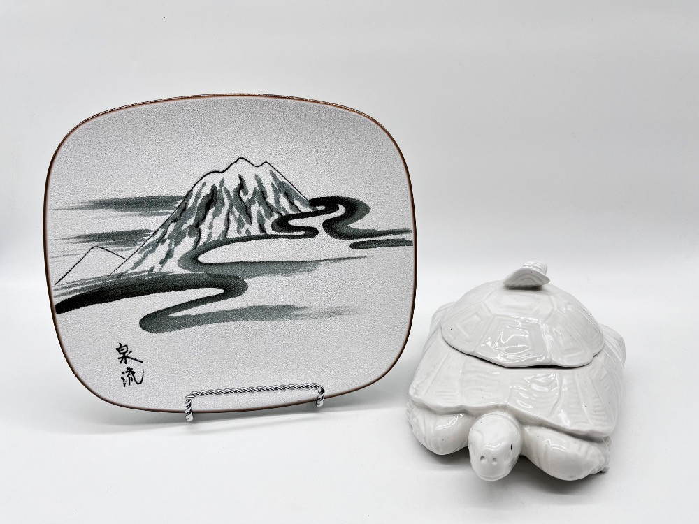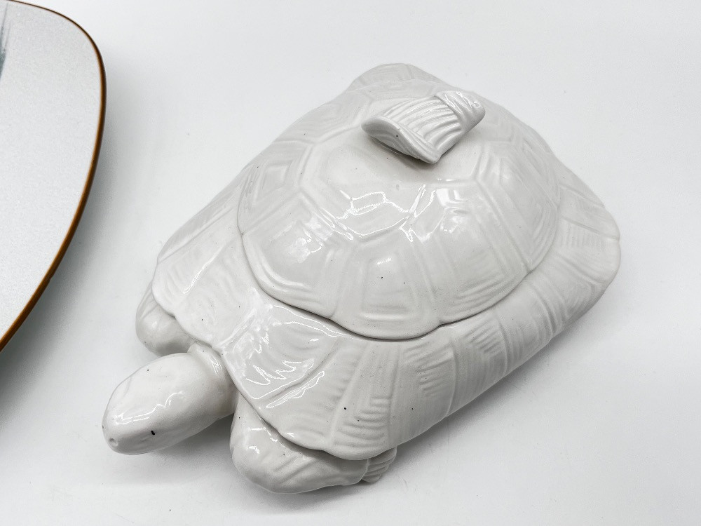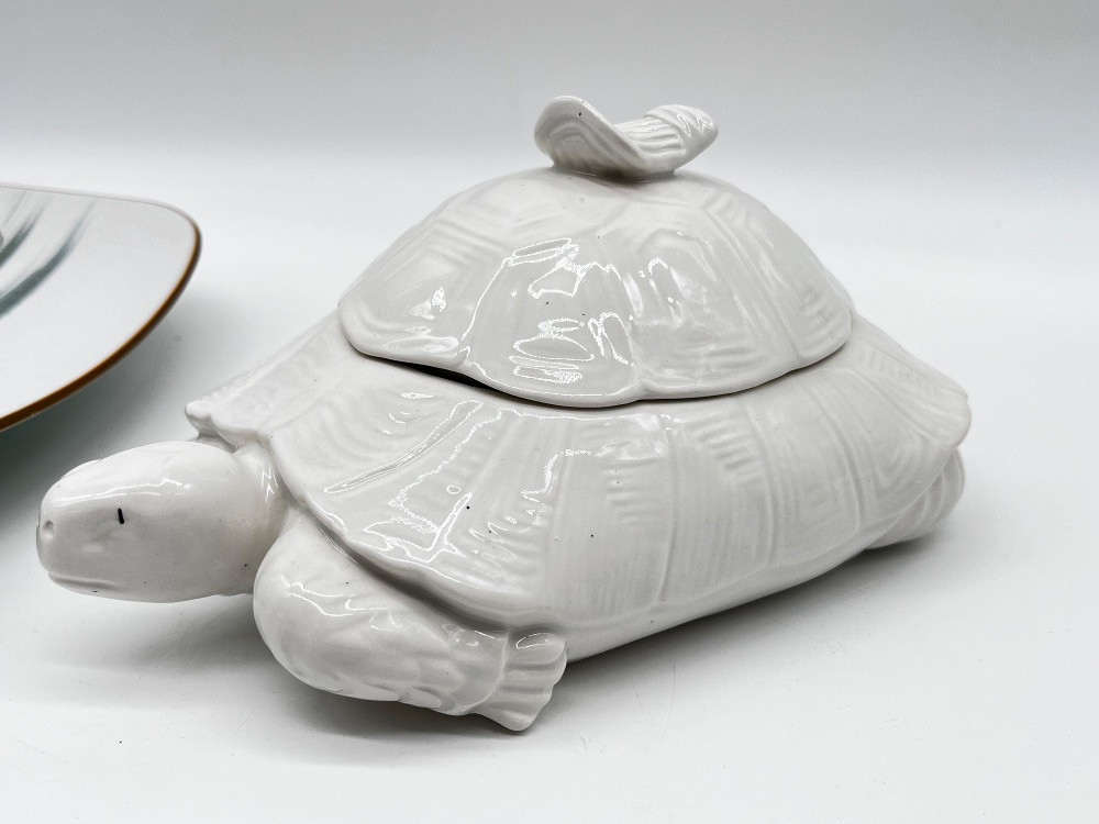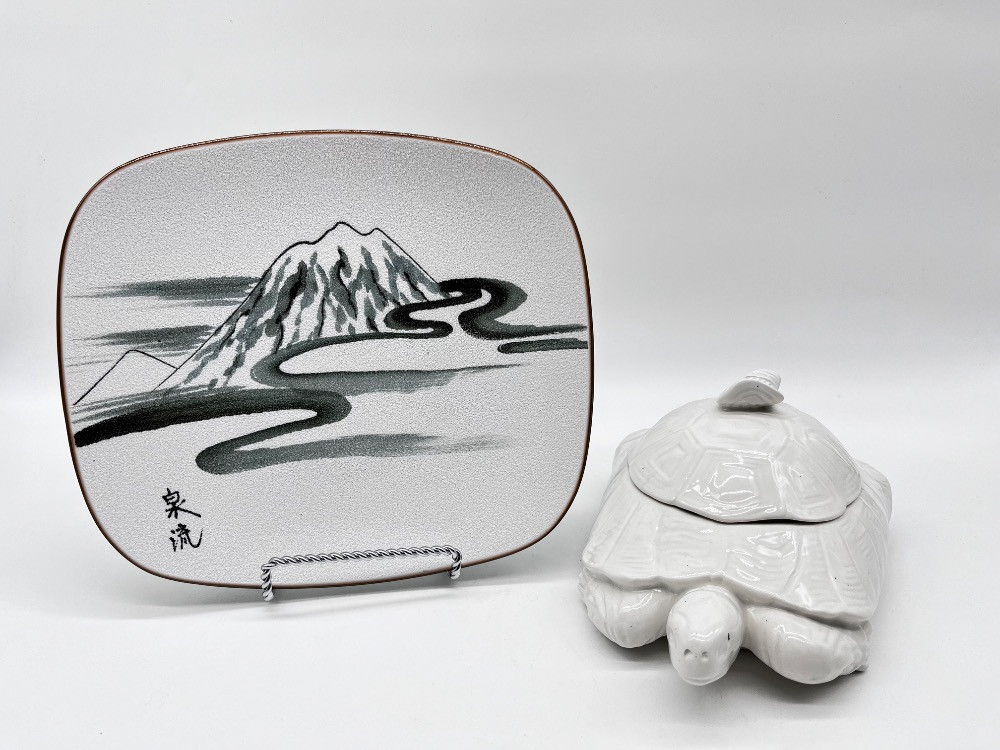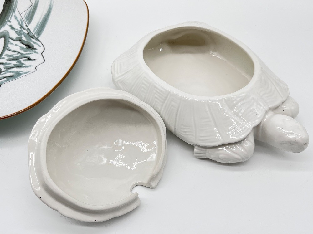 Antique Style Tortoise Ceramic Casserole & Japanese Art-Inspired Ceramic Plate. Antique Style White Ceramic Tortoise Soup Tureen Casserole - 4" H x 8" L x 6" W
