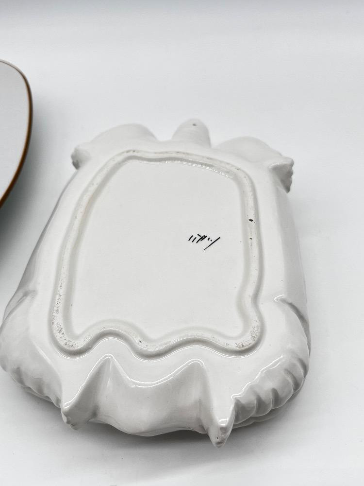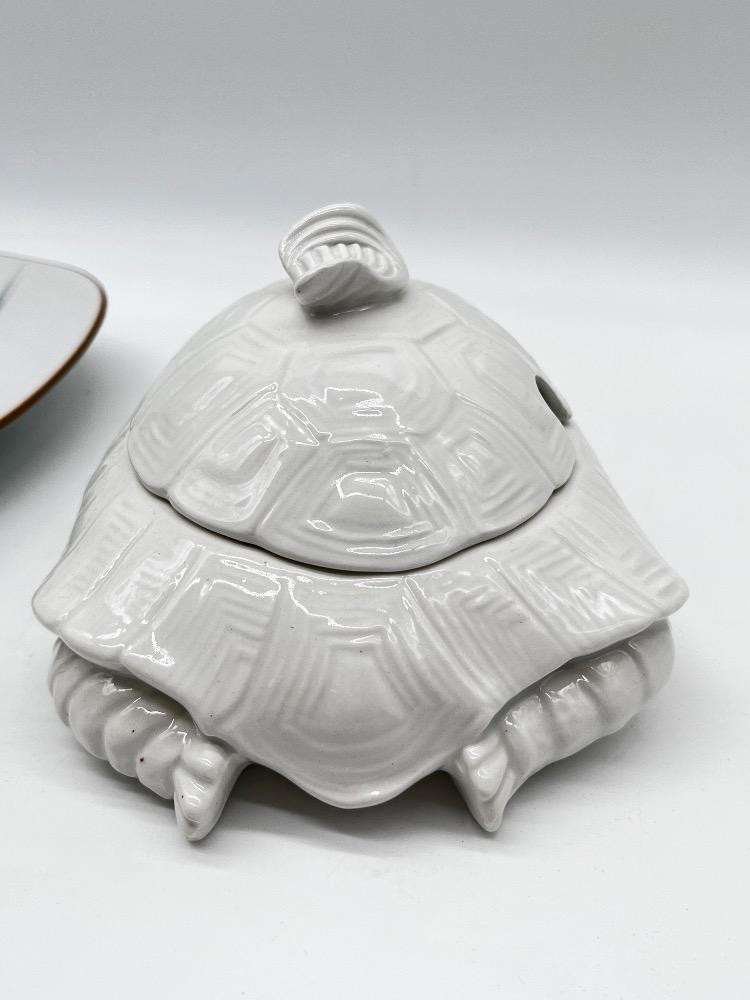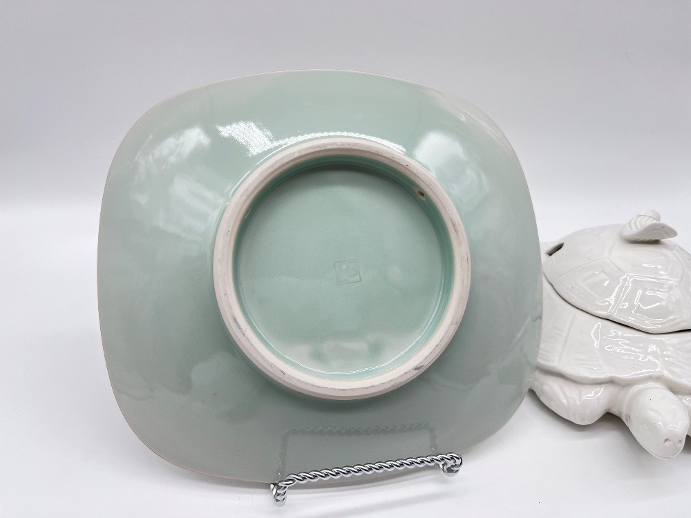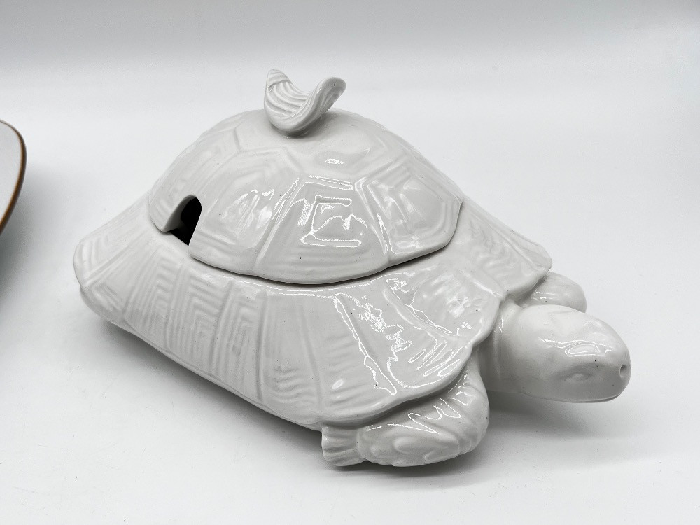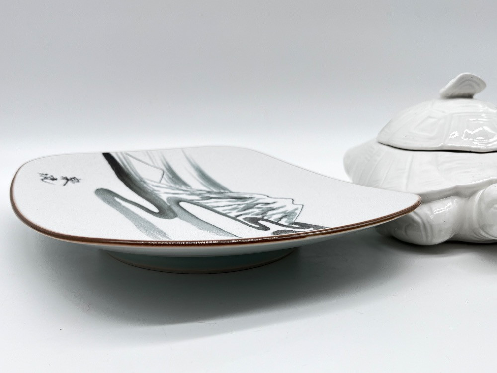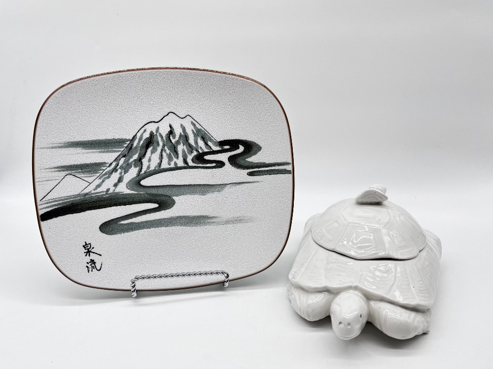 Antique Style Tortoise Ceramic Casserole & Japanese Art-Inspired Ceramic Plate. Antique Style White Ceramic Tortoise Soup Tureen Casserole - 4" H x 8" L x 6" W