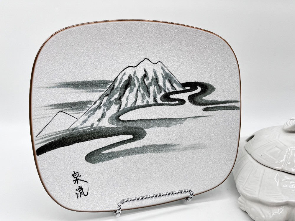 Japanese Art-Inspired Ceramic Plate - Mountain Scene w/ Maker’s Mark - 9" W x 8" H