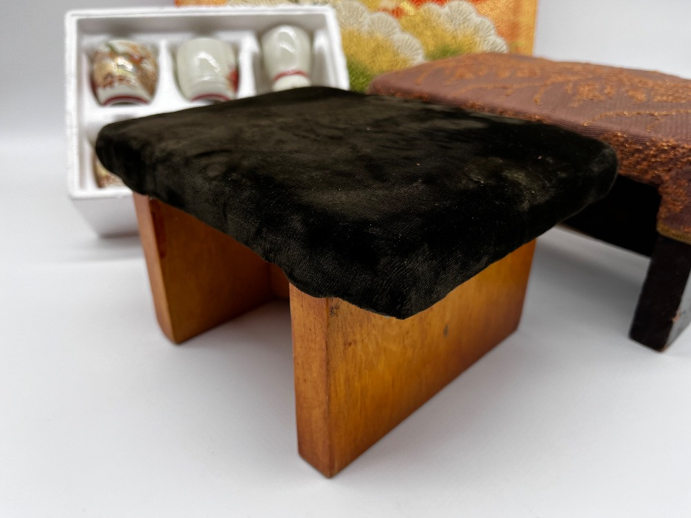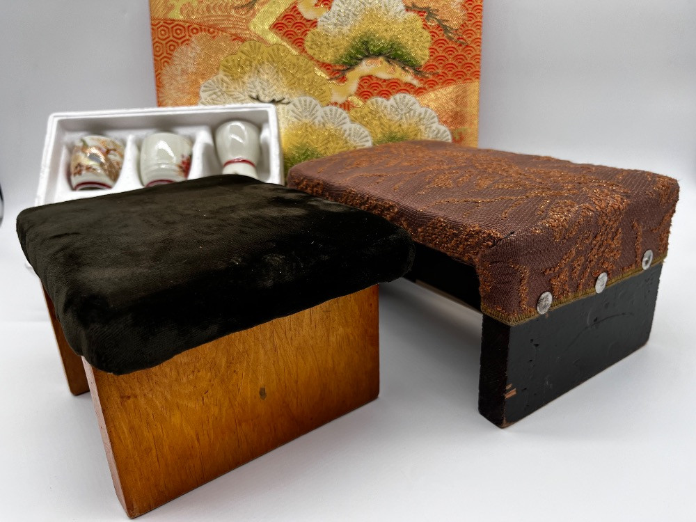 2 Vintage Japanese Wooden Footstools - Fabric Upholstered
