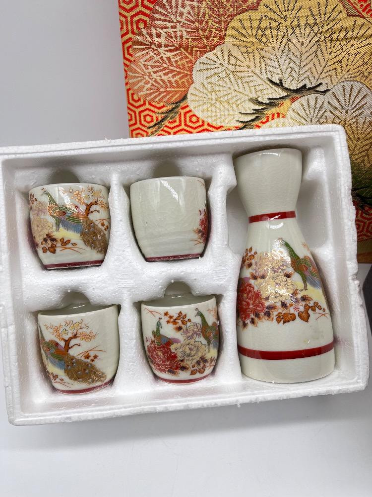 Vintage Japanese Sake Set, Photo Album & Footstools Lot. Vintage Japanese 5-Piece Sake Set – Porcelain Bottle & Cups