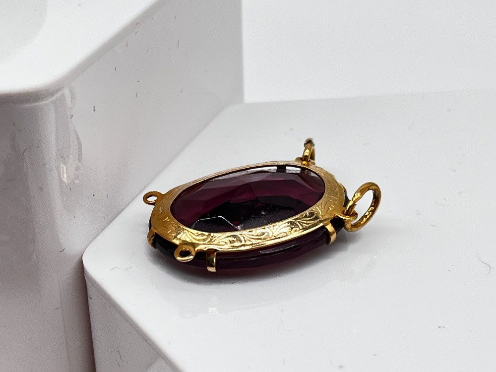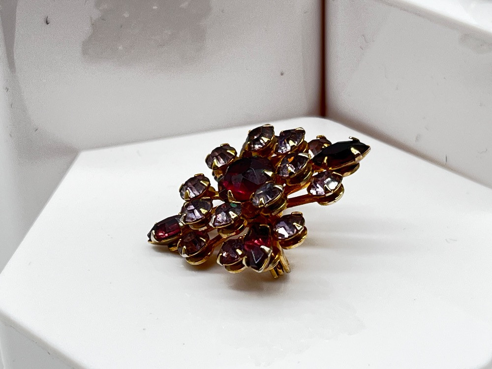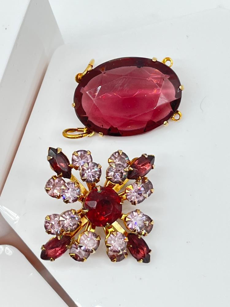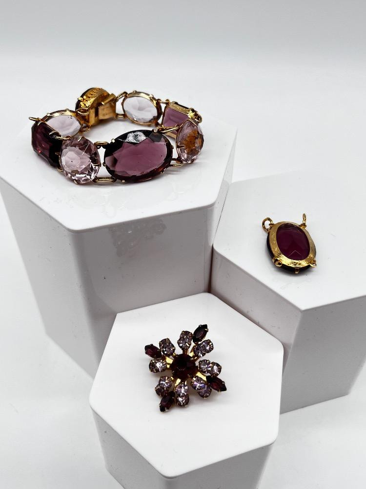 Vintage Amethyst Colored Jewelry Lot - Bracelet, Pendant, & Brooch. Disclaimer: We do not test the metals of the items listed for auction. By placing a bid, you acknowledge and agree that you are purchasing the item "as is" and without any guarantee of metal quality. We do not offer refunds based on metal content or purity.