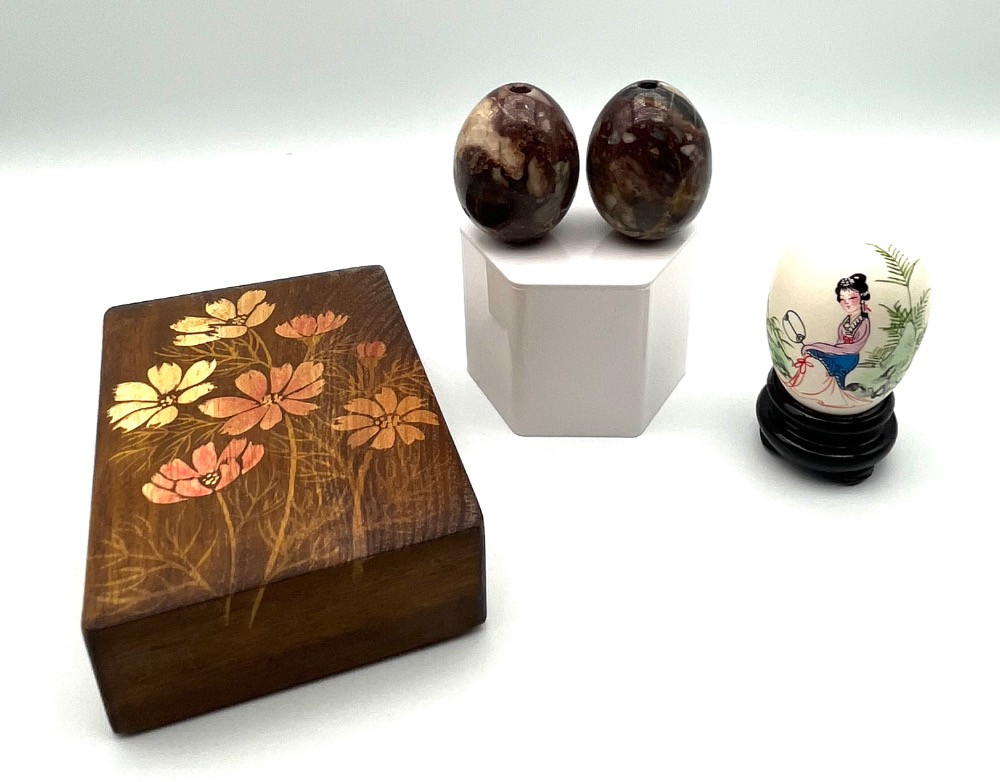 Hand-Painted Box, Chinese Hand Painted Egg, & 2 Polished Stone Eggs.