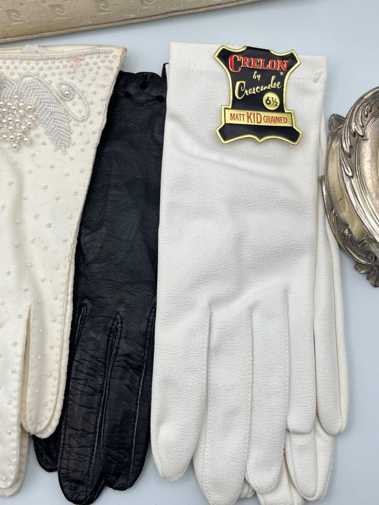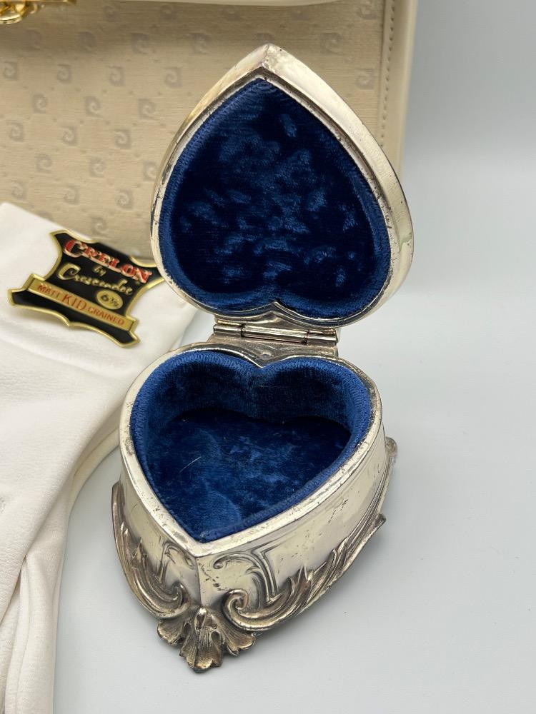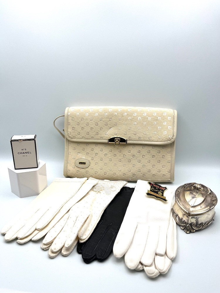 Vintage Pierre Cardin Clutch, Chanel No. 5 Perfume, Gloves & Silver-Plated Jewelry Box.