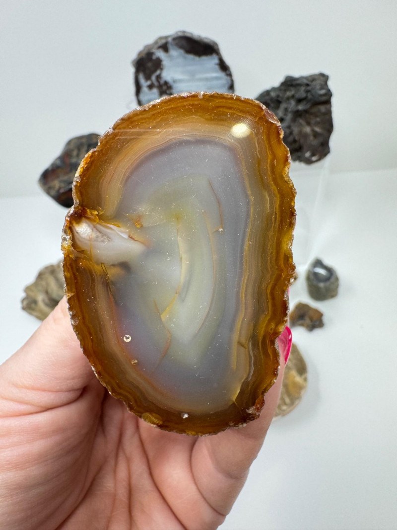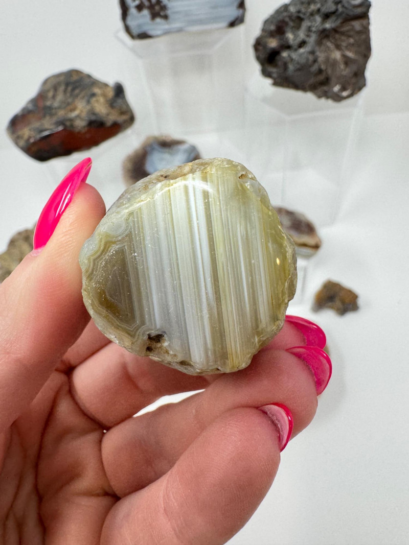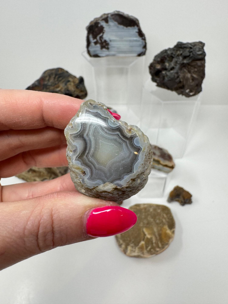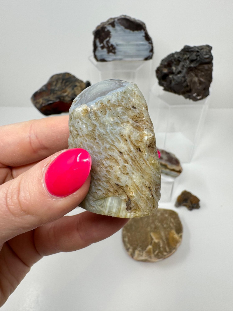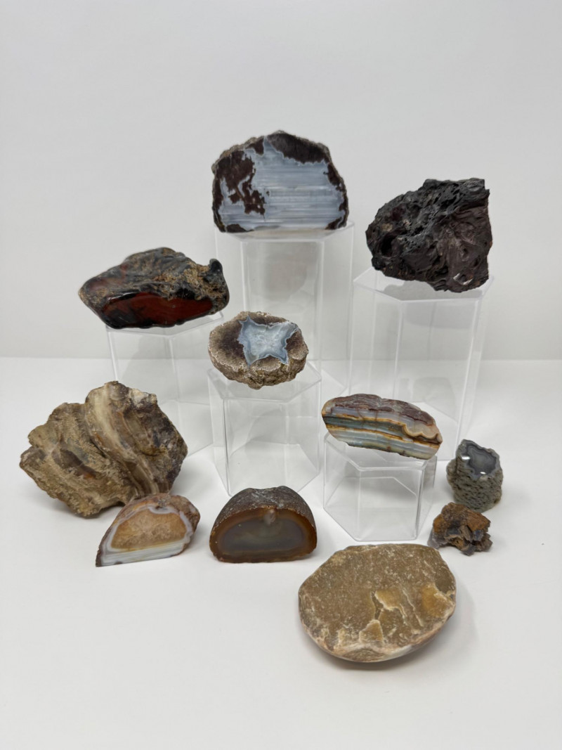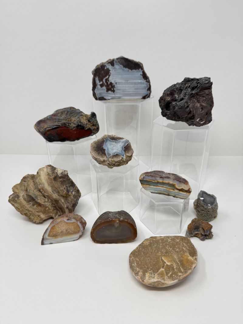 Natural Agate Slices & Rugged Stone Fossil Specimens - Set 1. Please note: These mineral specimens have not been professionally tested or identified. They are offered "as-is" based on visual assessment. Bid accordingly.