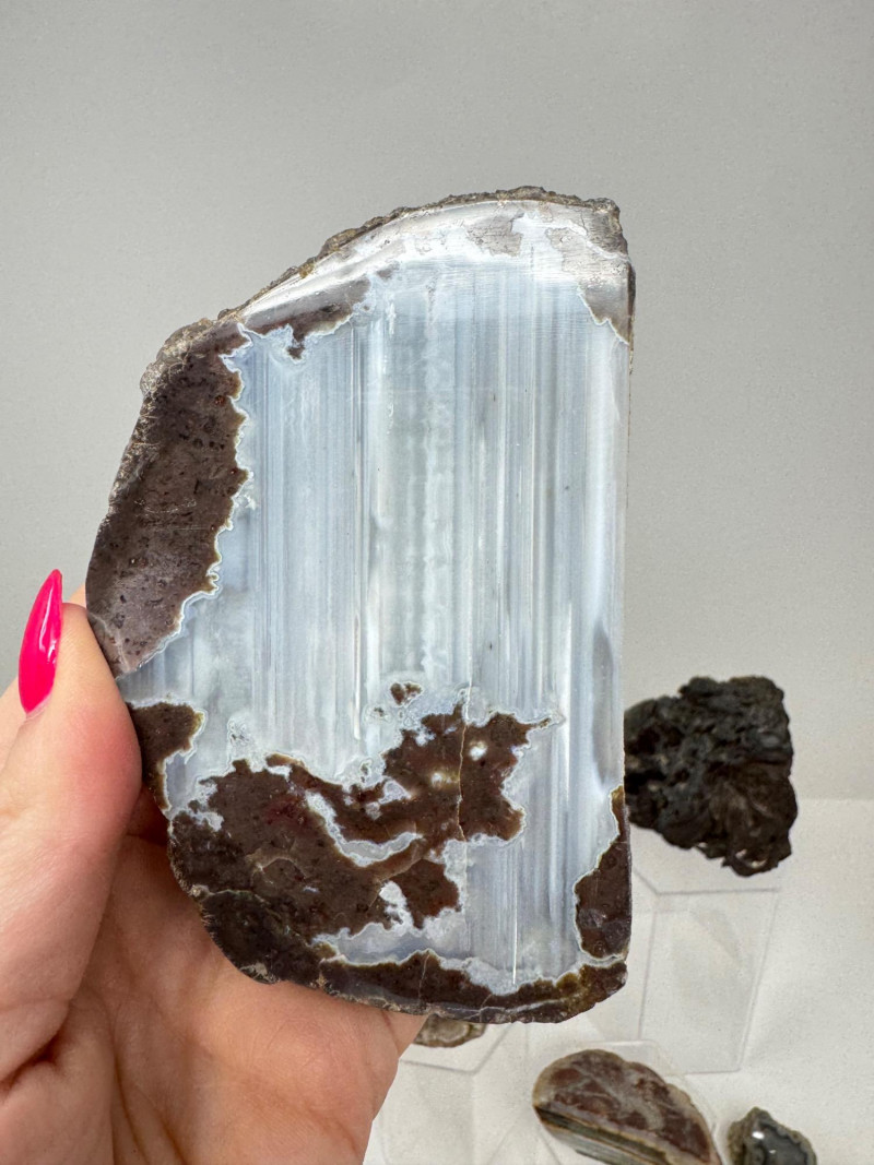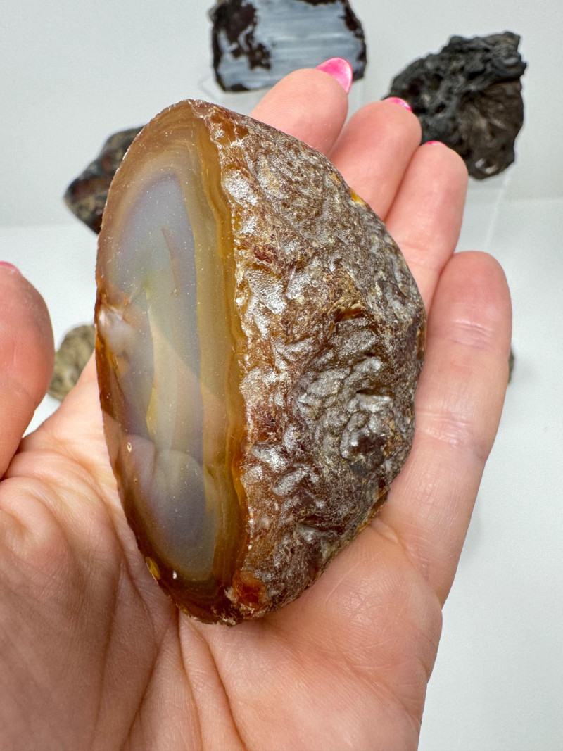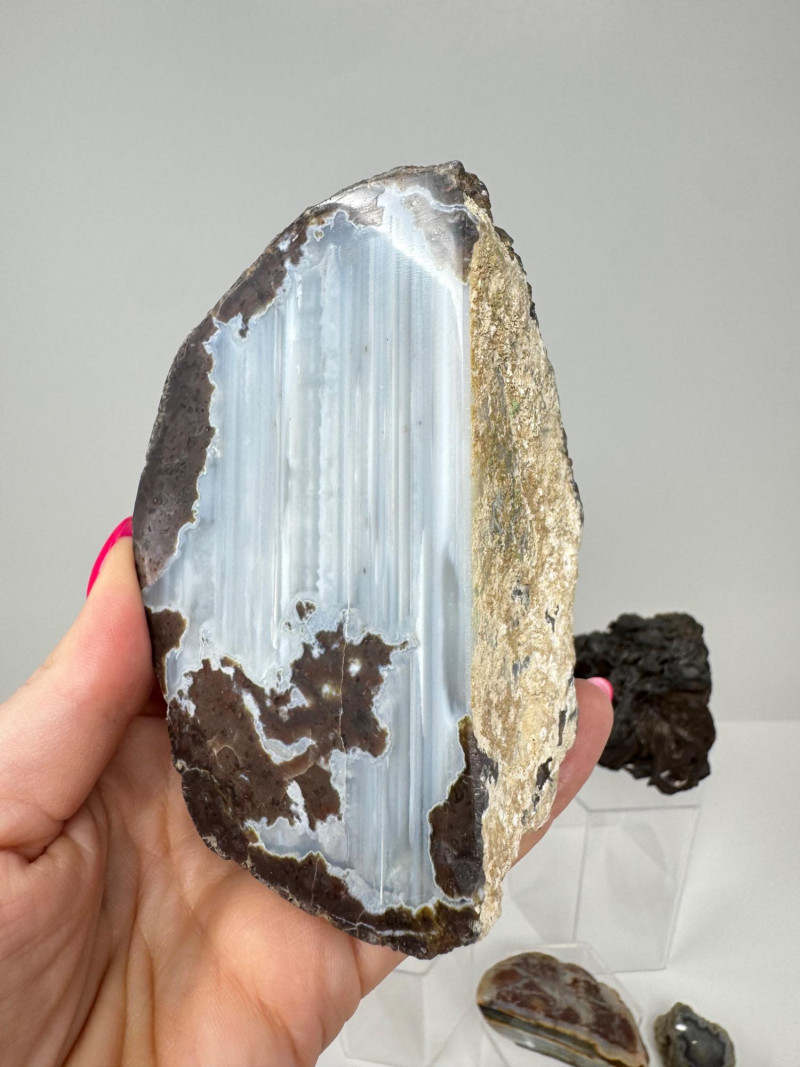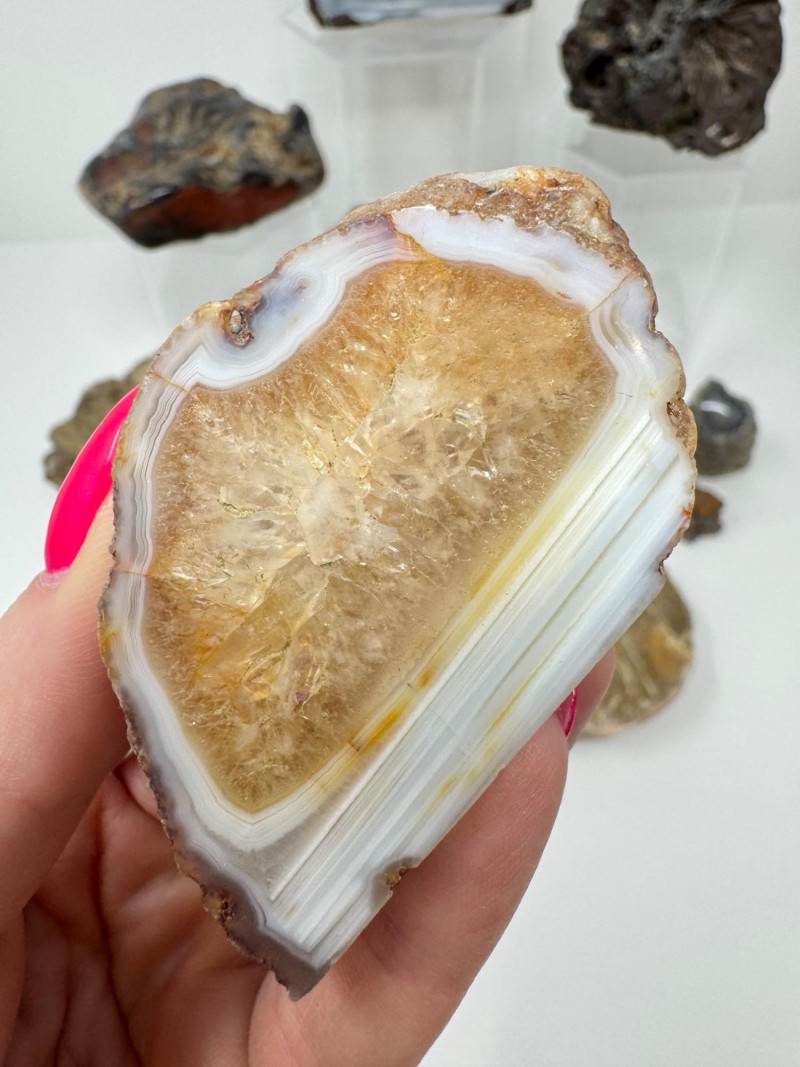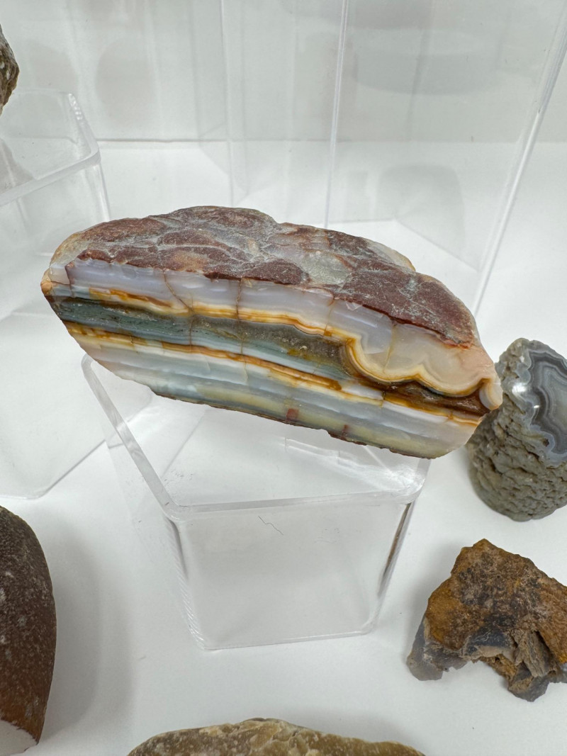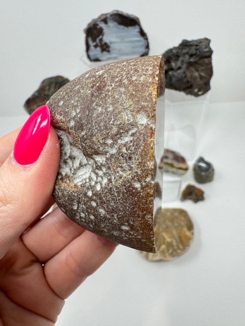 Natural Agate Slices & Rugged Stone Fossil Specimens - Set 1. Please note: These mineral specimens have not been professionally tested or identified. They are offered "as-is" based on visual assessment. Bid accordingly.