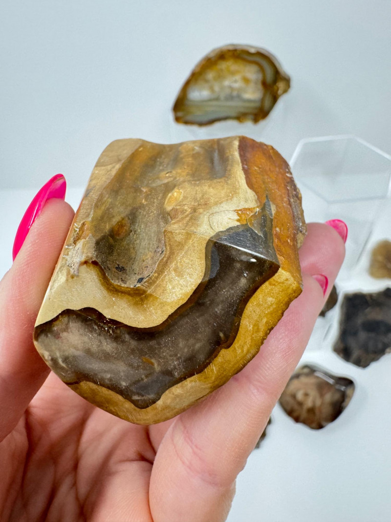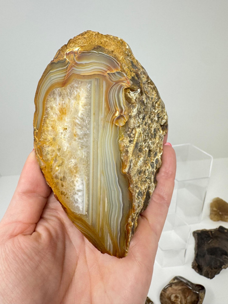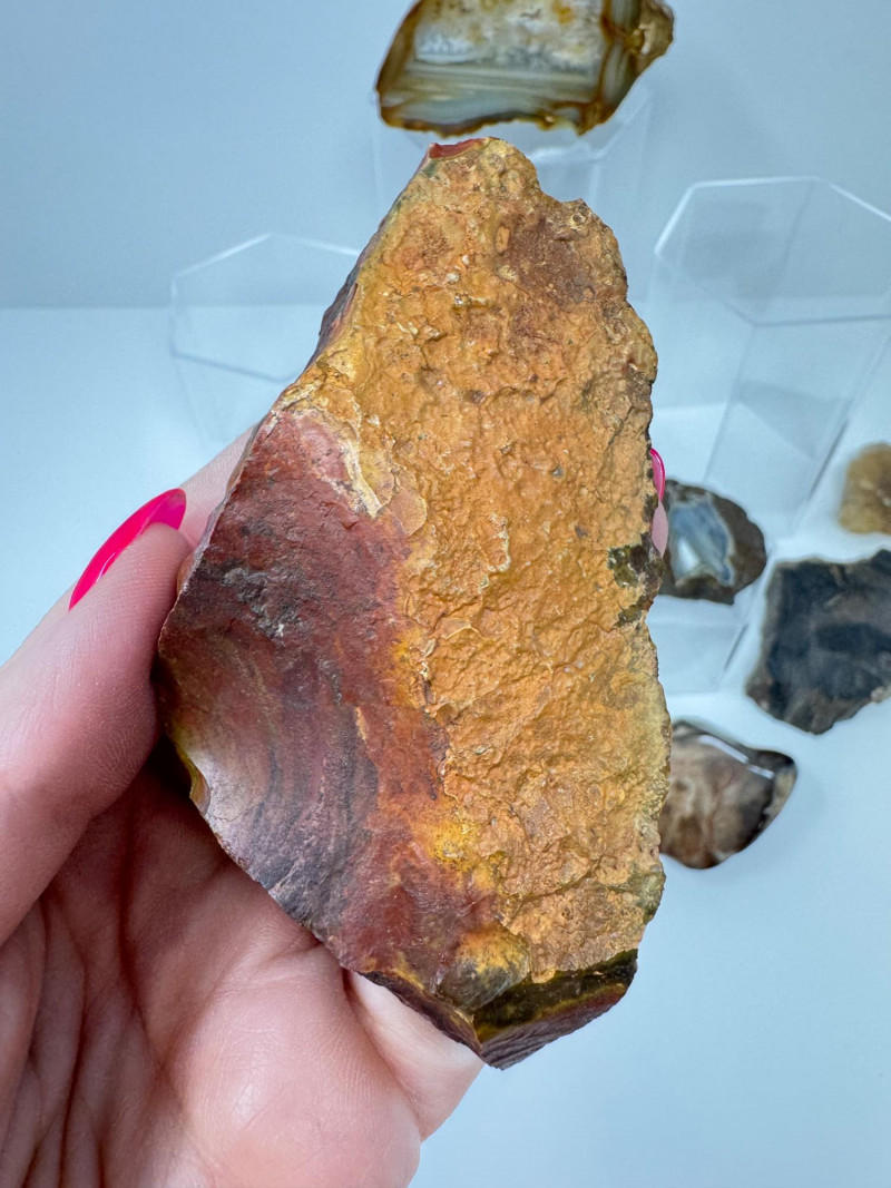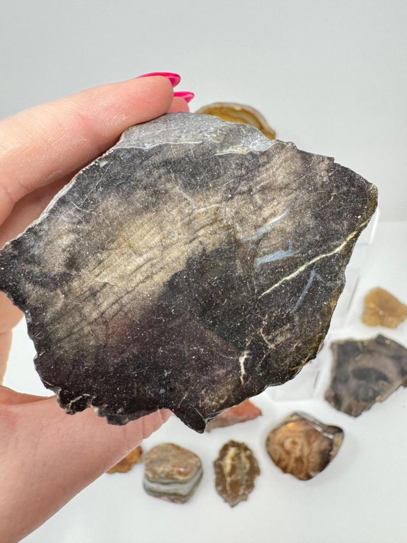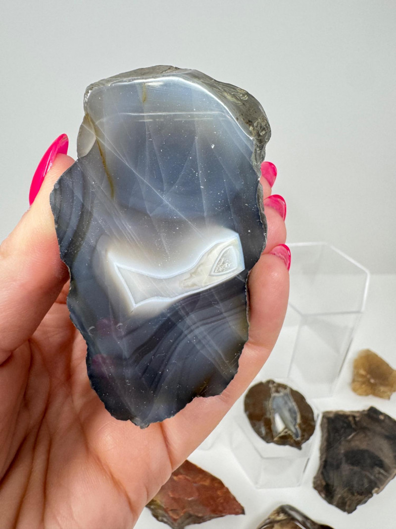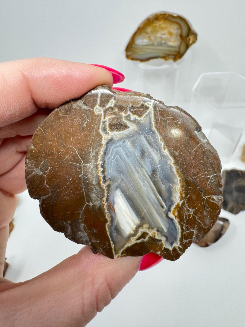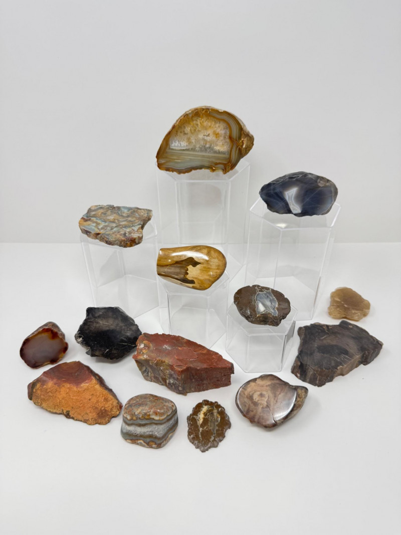 Natural Agate Slices & Rugged Stone Fossil Specimens - Set 2. Please note: These mineral specimens have not been professionally tested or identified. They are offered "as-is" based on visual assessment. Bid accordingly.
