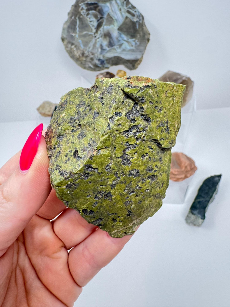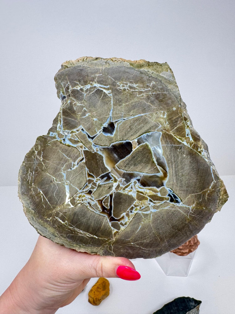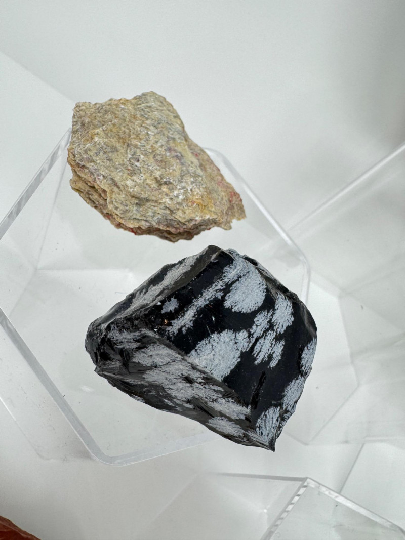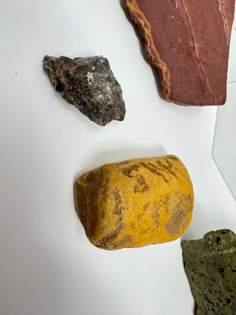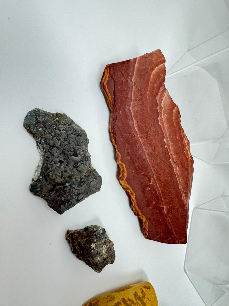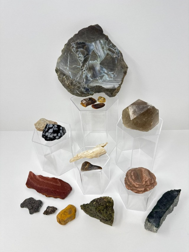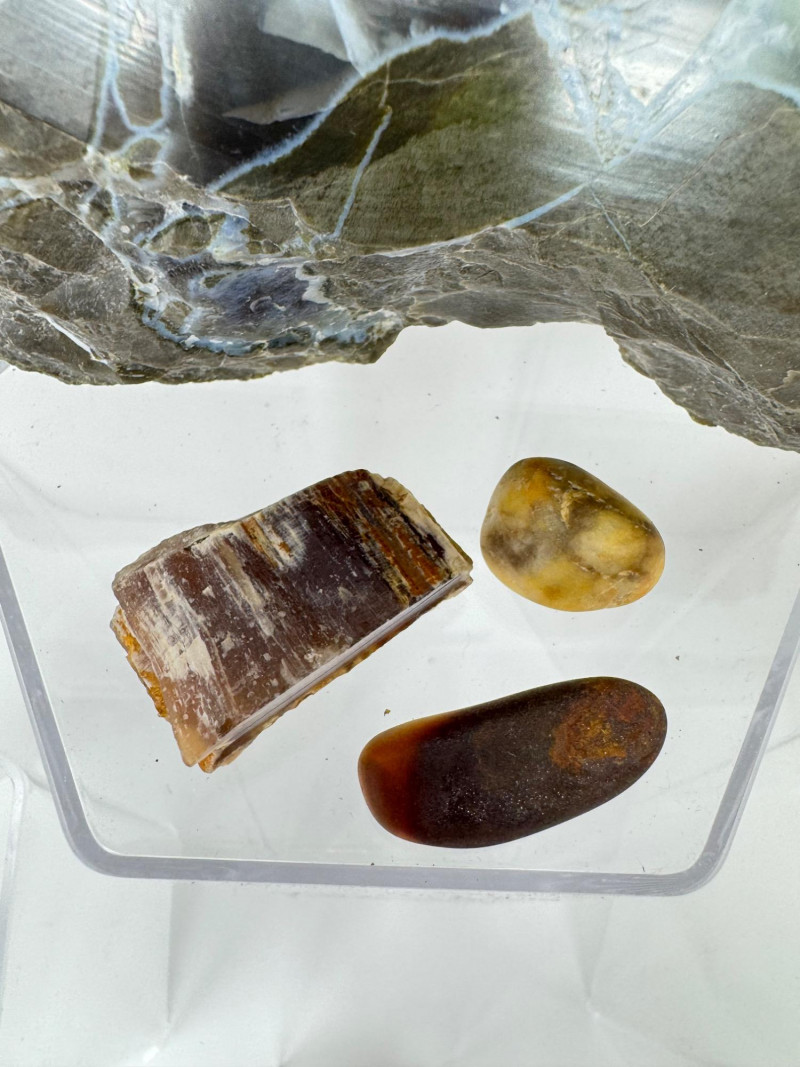 16-PieceMineral Set w/ Obsidian Slab, Tiger’s Eye & Amber + Large Flat Rock 7.5” Across Please note: These mineral specimens have not been professionally tested or identified. They are offered "as-is" based on visual assessment. Bid accordingly.