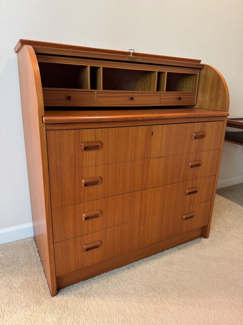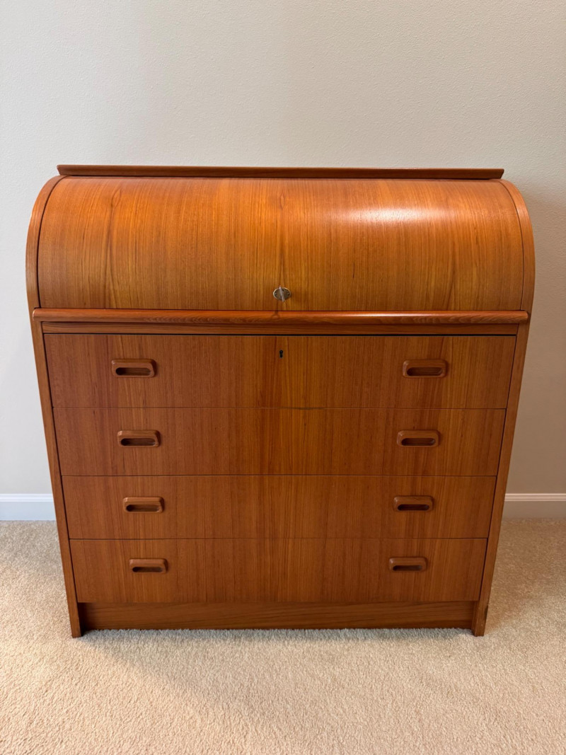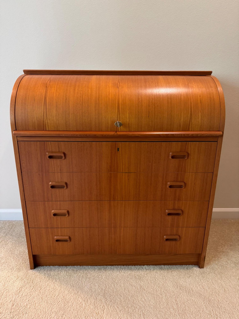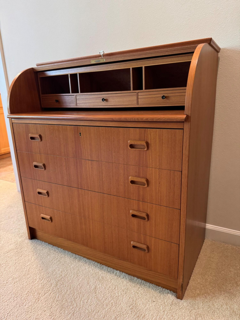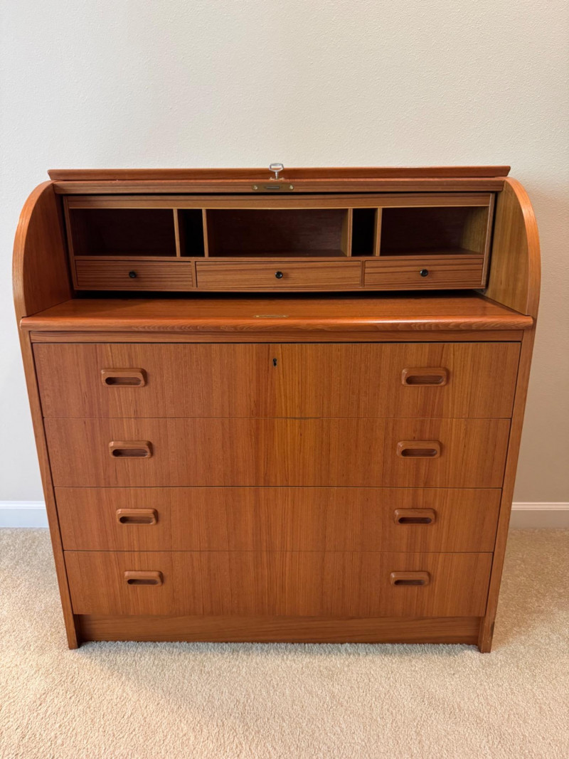 MCM Vintage Danish Roll-Top Secretary Desk – Teak Veneer. 35.5” Wide 18.5” Deep 38” Tall Bidding on this lot is an agreement that: (1.) You will have at least 2 capable, able bodied persons to lift and load at a minimum. (2.) You will bring a hand truck and/or any other tools needed to remove this item. If these steps are not followed your item will be forfeit and no refund given.