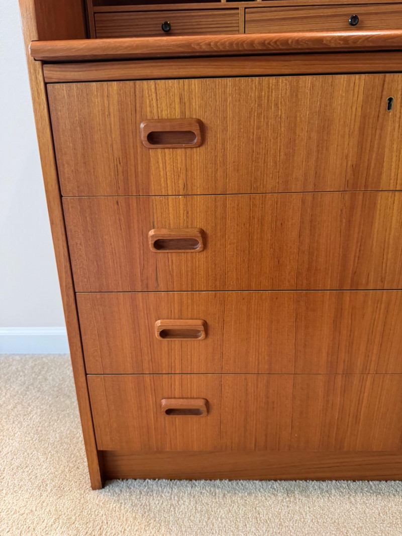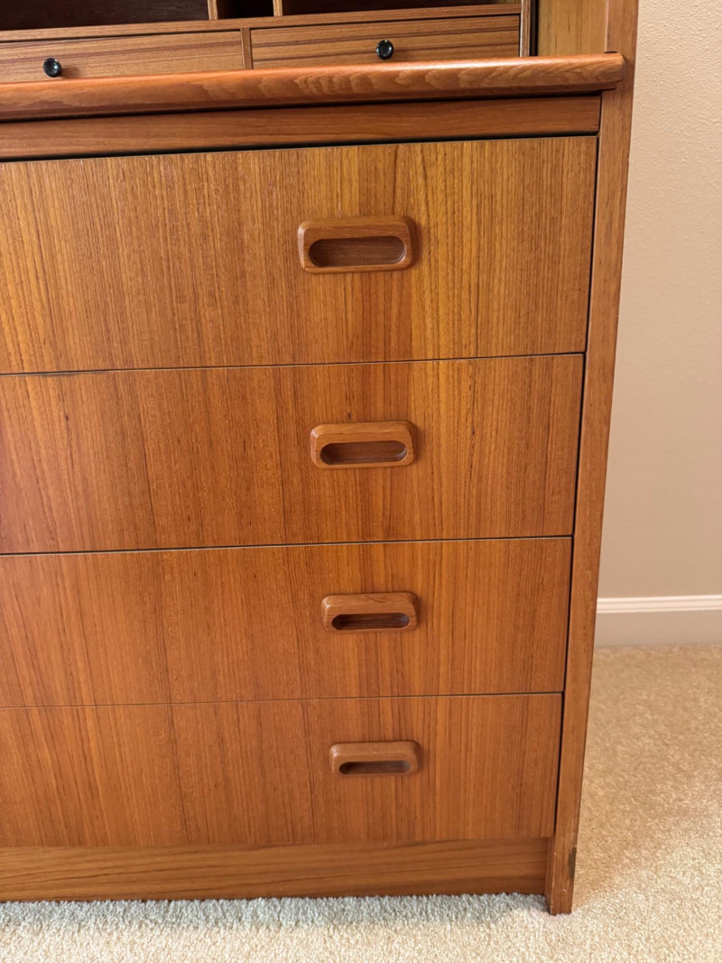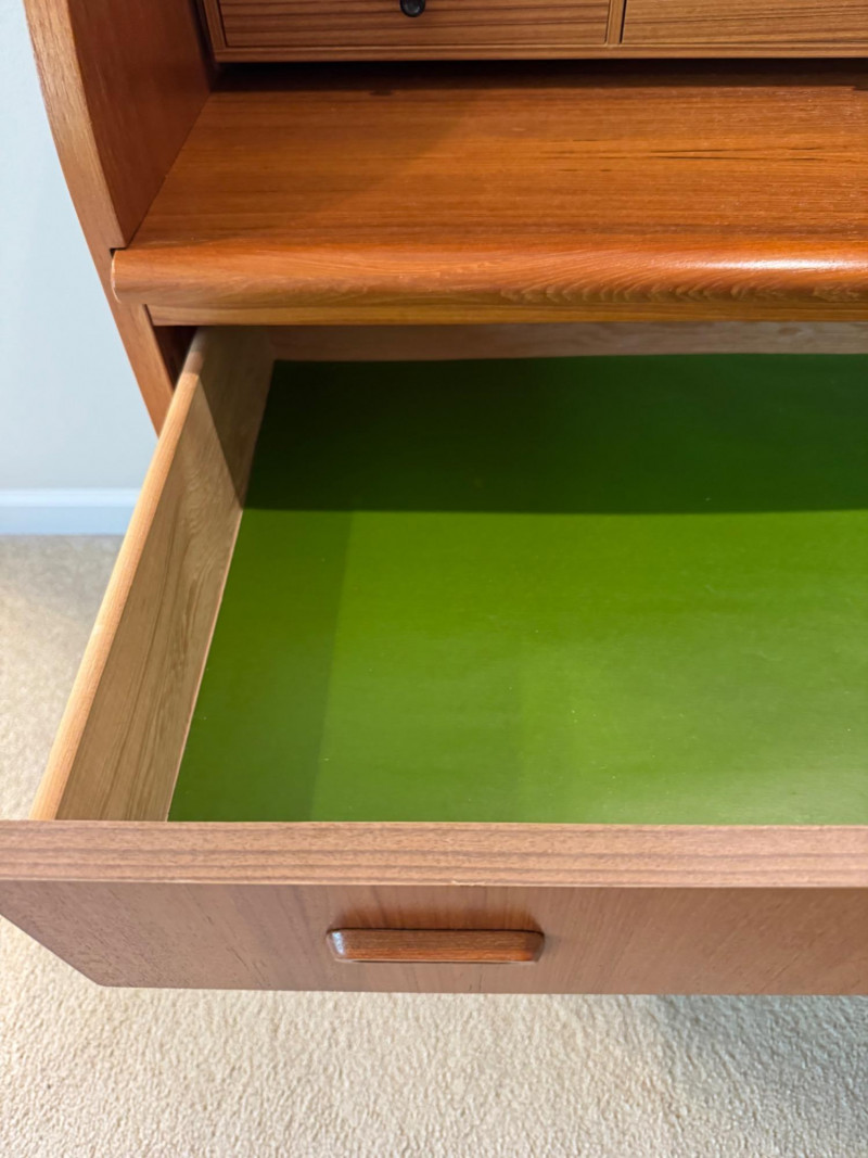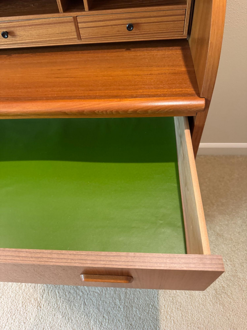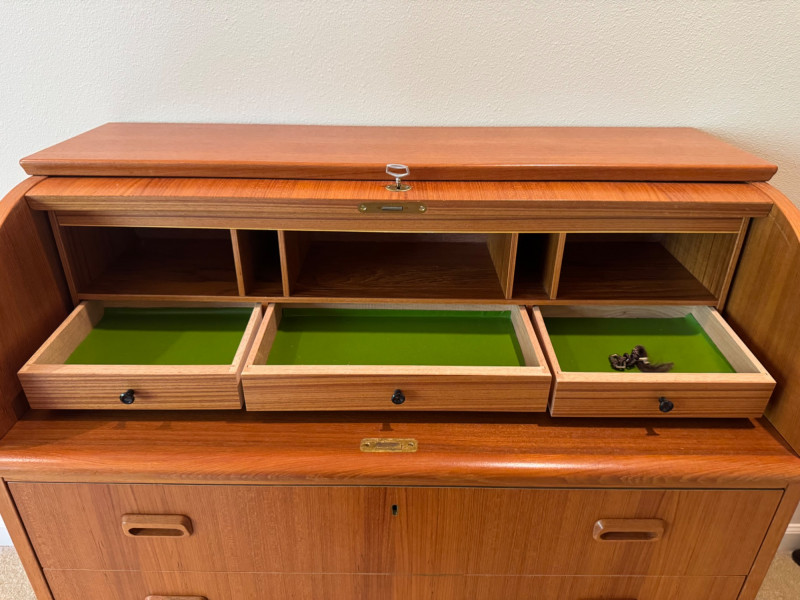 MCM Vintage Danish Roll-Top Secretary Desk – Teak Veneer. 35.5” Wide 18.5” Deep 38” Tall Bidding on this lot is an agreement that: (1.) You will have at least 2 capable, able bodied persons to lift and load at a minimum. (2.) You will bring a hand truck and/or any other tools needed to remove this item. If these steps are not followed your item will be forfeit and no refund given.