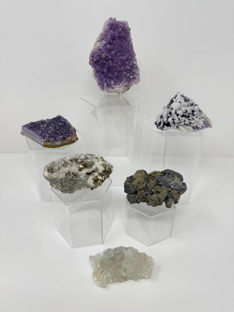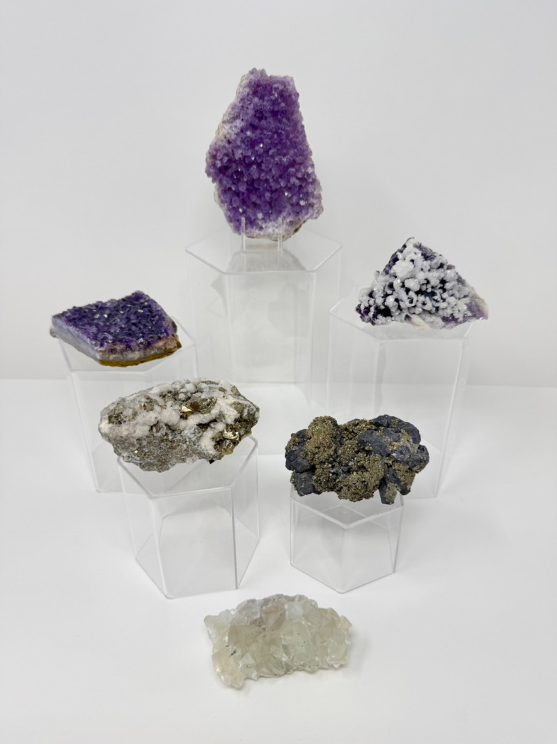 Diverse Crystal & Mineral Group - Amethyst, Pyrite?, & Other Specimens. 3-4.5” Tall Please note: These mineral specimens have not been professionally tested or identified. They are offered "as-is" based on visual assessment. Bid accordingly.
