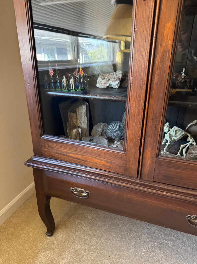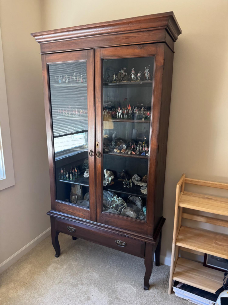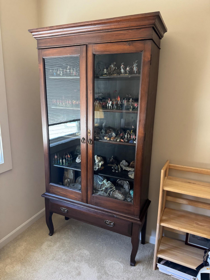 Antique Glass-Front China Cabinet w/ Drawer. 39” W x 15” D x 78.5” H Contents not included. Disclaimer: By placing a bid on this lot, you agree to the following removal conditions: (1.) You will have a minimum of two capable individuals to assist with lifting and loading. (2.) You will bring a hand truck and any other equipment required for removal. If these conditions are not met, the item will be forfeited, and no refund will be provided. This item is located on the second floor, and the buyer must arrange all moving.