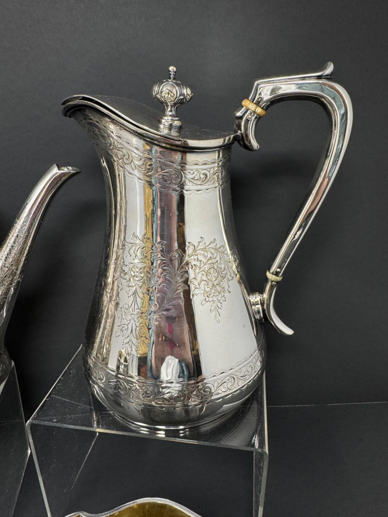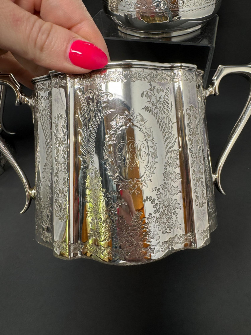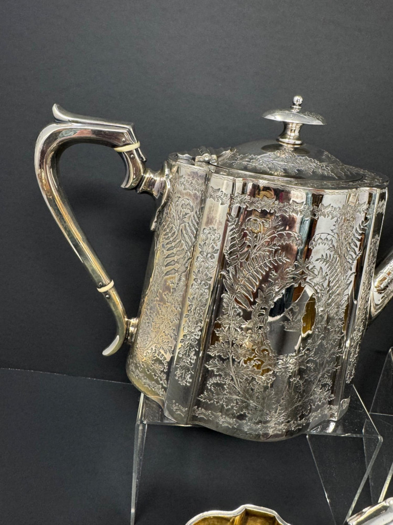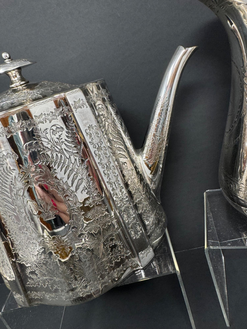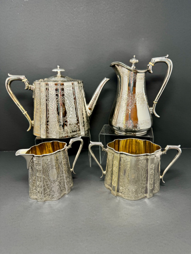 Ornate F.B. Rogers Silver Plate 4pc Tea & Coffee Set – Pattern 4235. Disclaimer: We do not test the metals of the items listed for auction. By placing a bid, you acknowledge and agree that you are purchasing the item "as is" and without any guarantee of metal quality. We do not offer refunds based on metal content or purity.