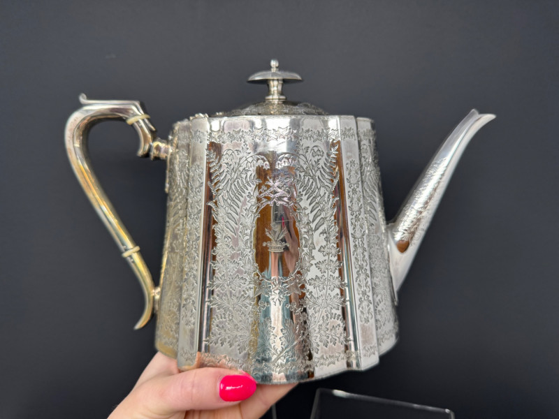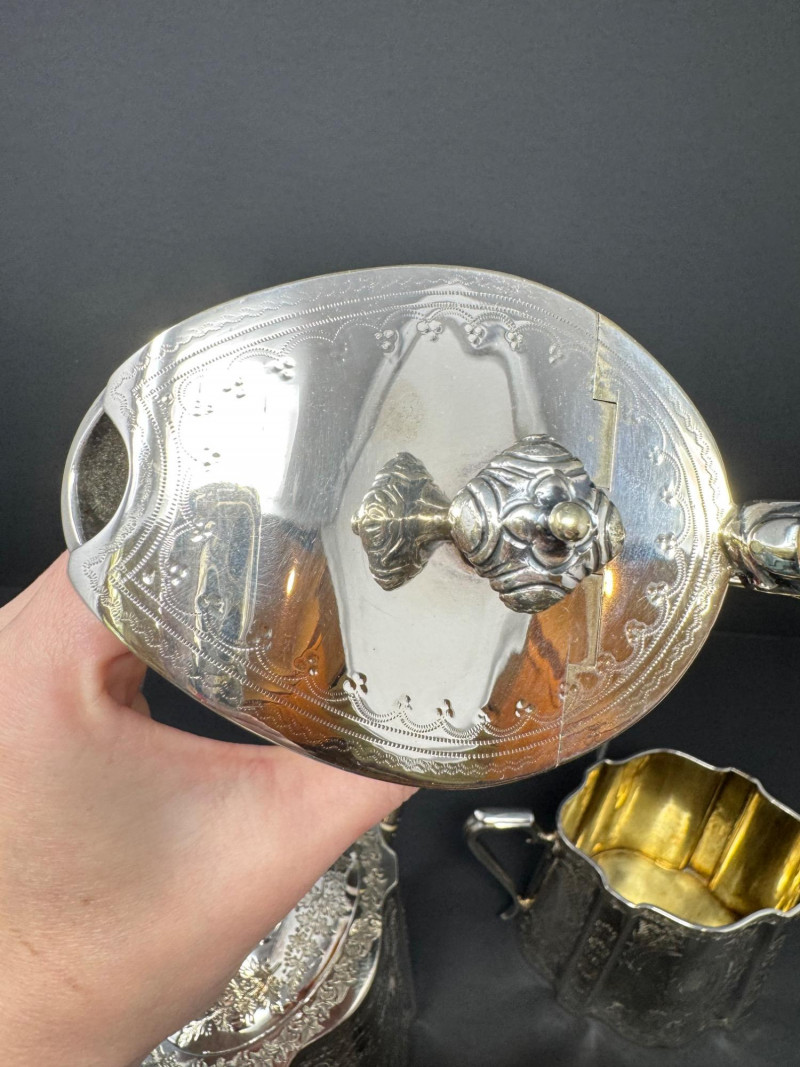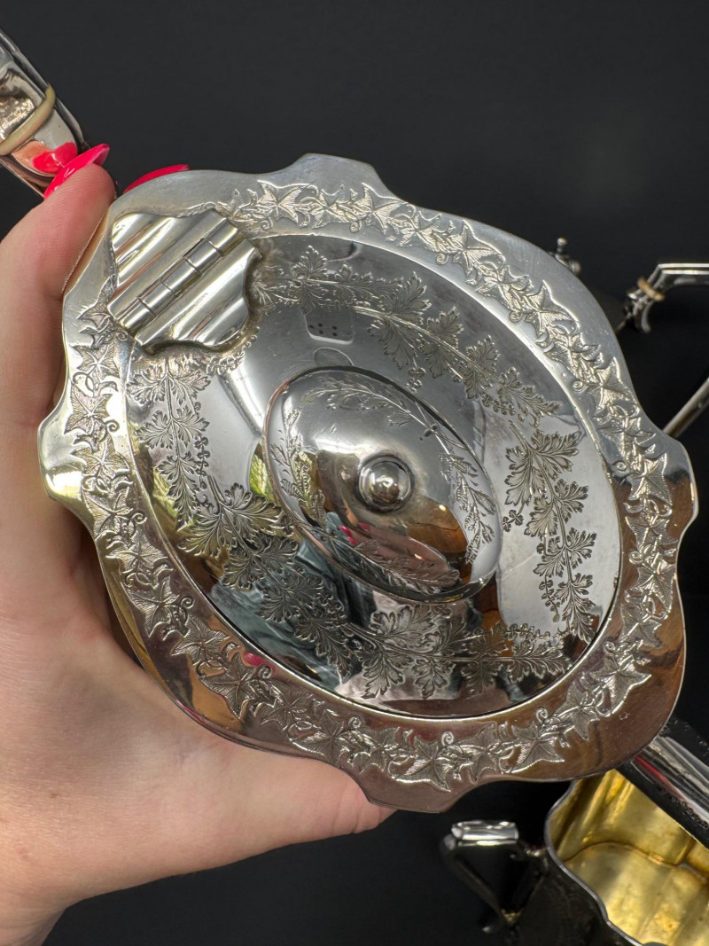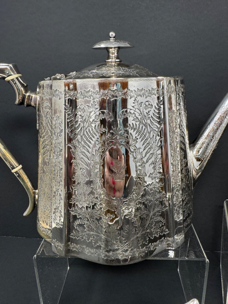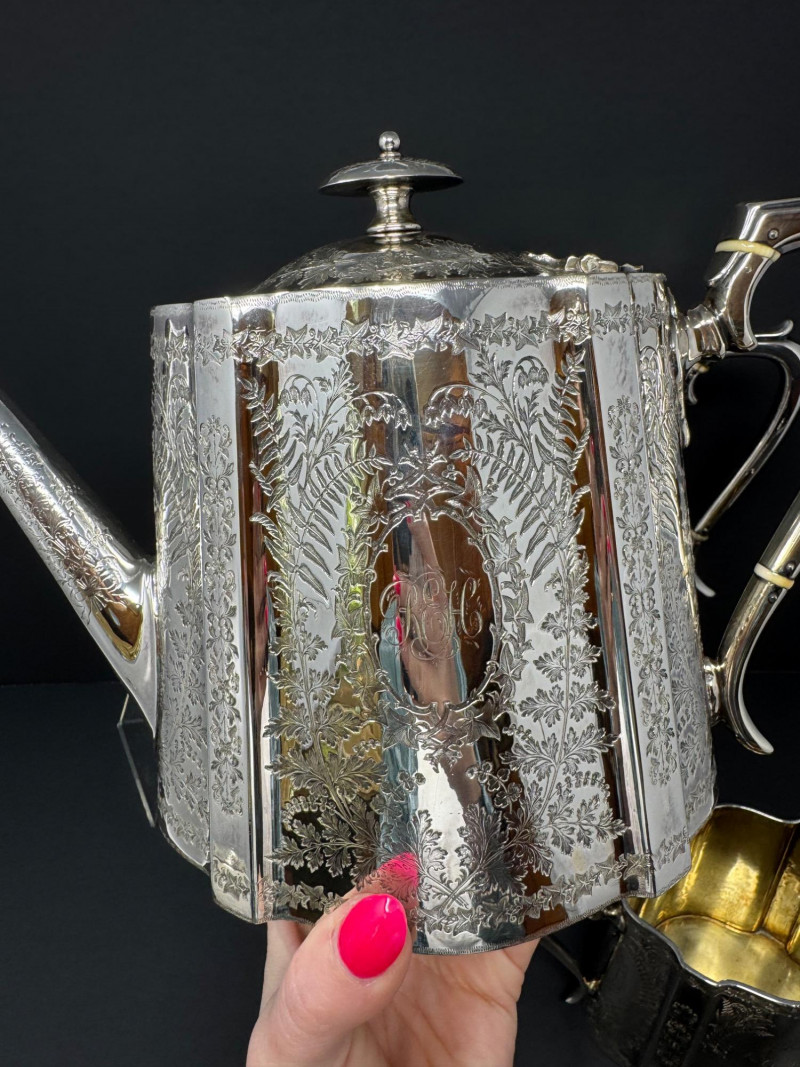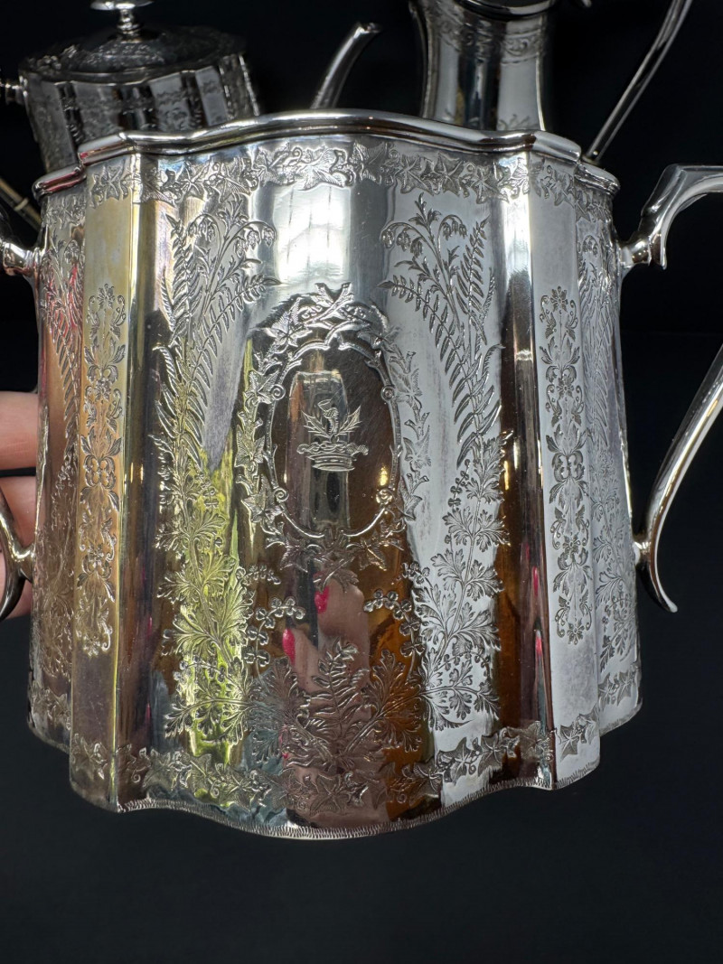 Ornate F.B. Rogers Silver Plate 4pc Tea & Coffee Set – Pattern 4235. Disclaimer: We do not test the metals of the items listed for auction. By placing a bid, you acknowledge and agree that you are purchasing the item "as is" and without any guarantee of metal quality. We do not offer refunds based on metal content or purity.