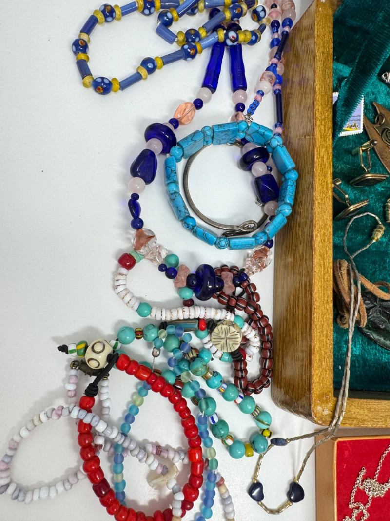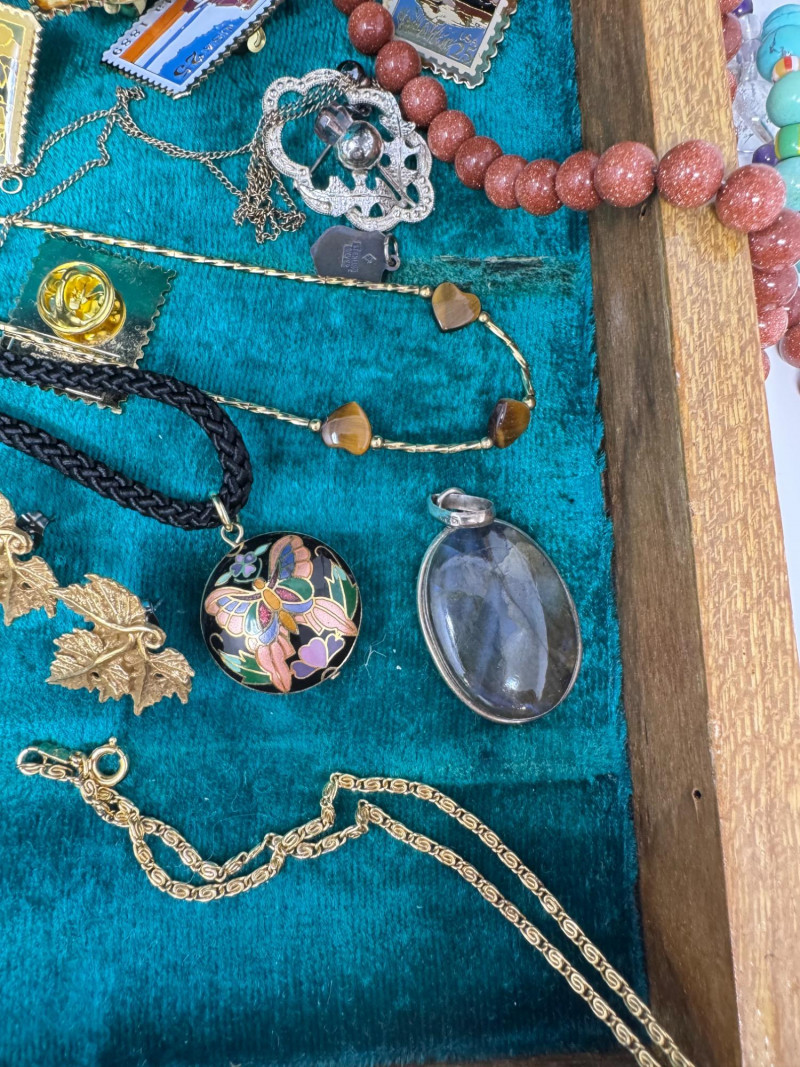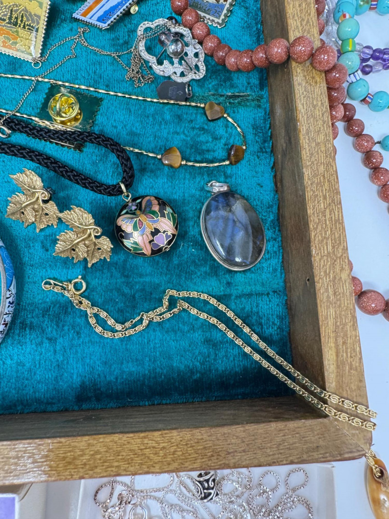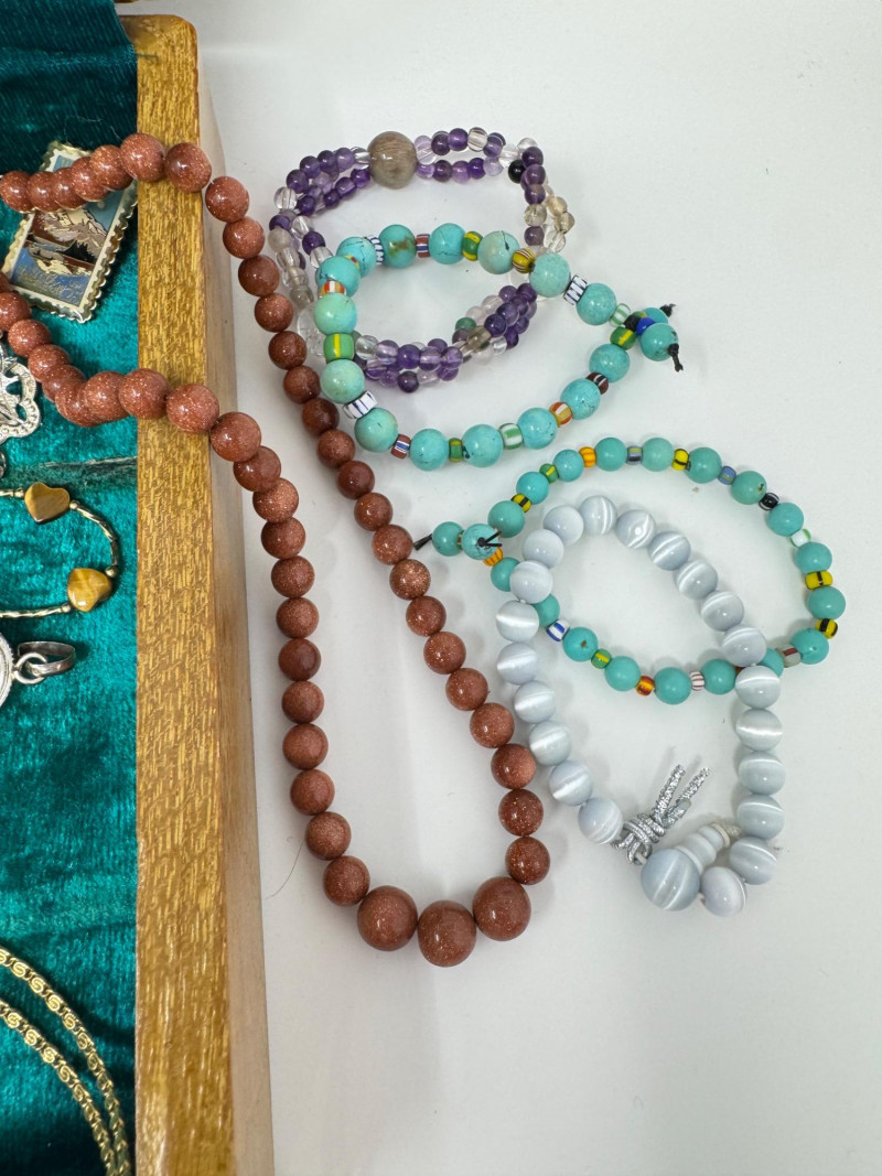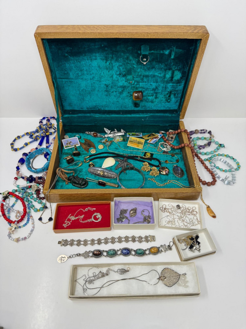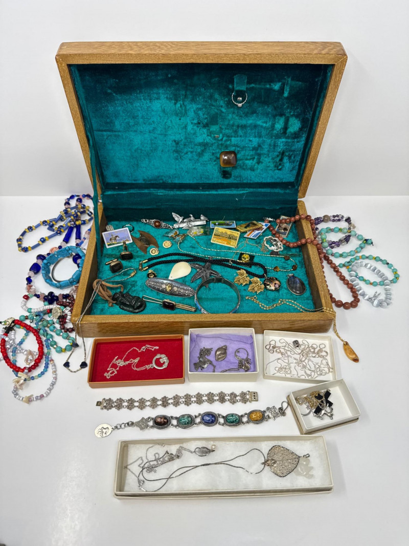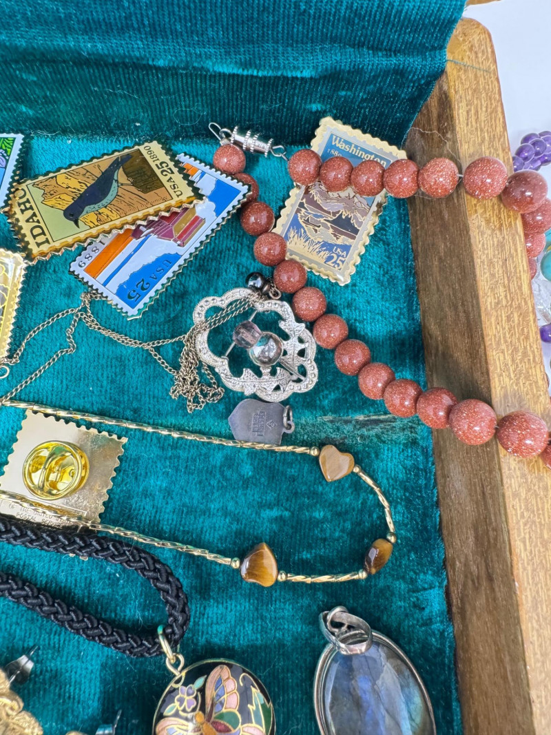 Eclectic Jewelry Box Treasure Trove – Sterling, Stones & Costume Finds. Disclaimer: We do not test the metals of the items listed for auction. By placing a bid, you acknowledge and agree that you are purchasing the item "as is" and without any guarantee of metal quality. We do not offer refunds based on metal content or purity.