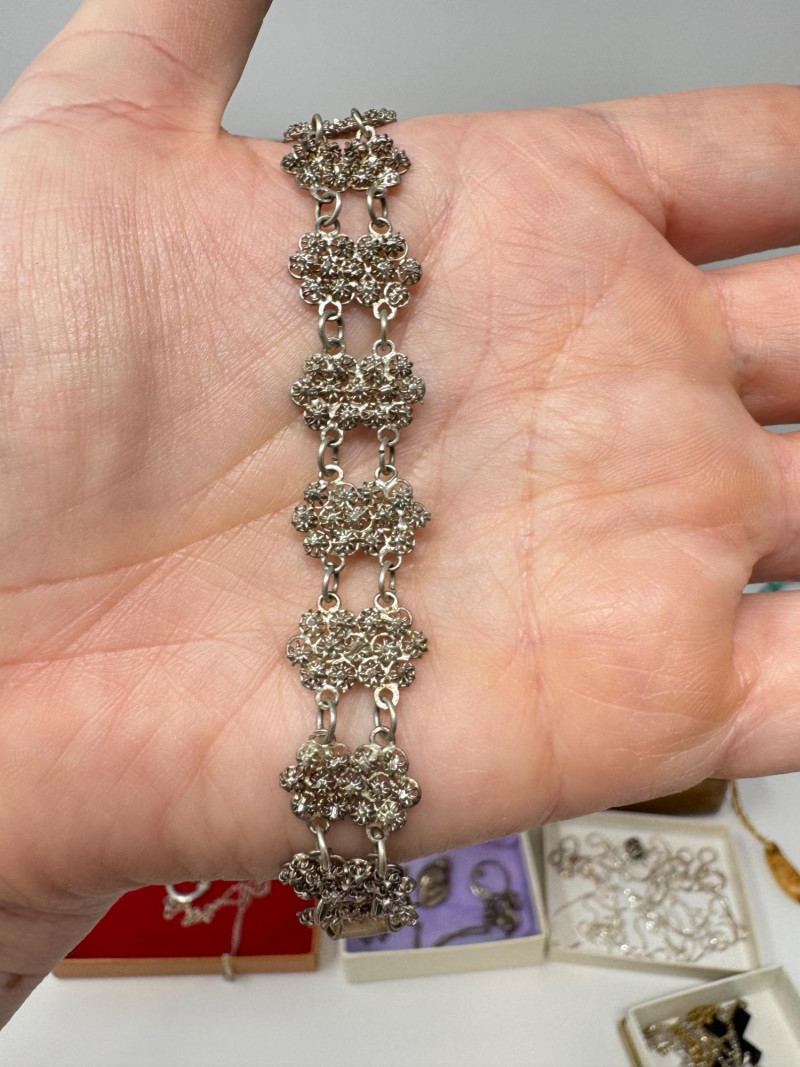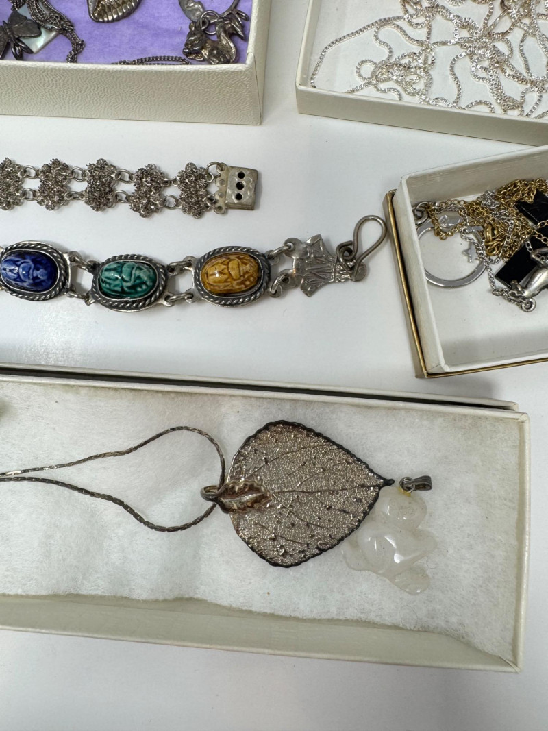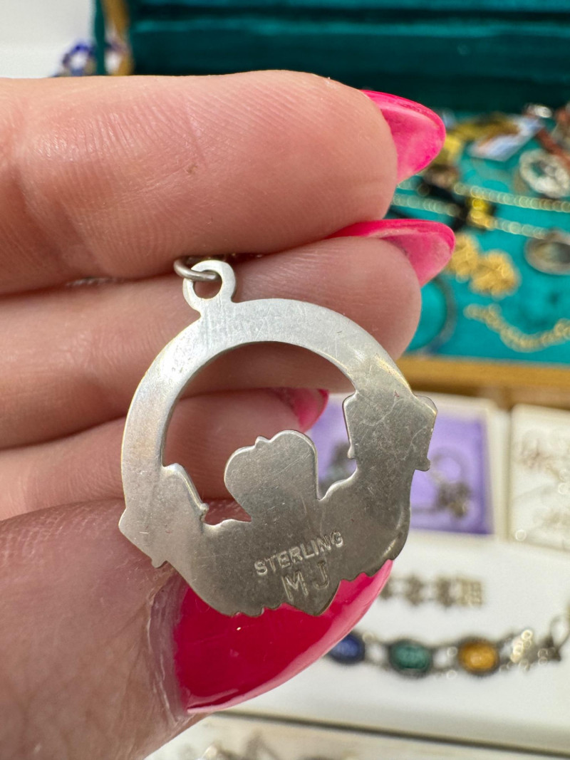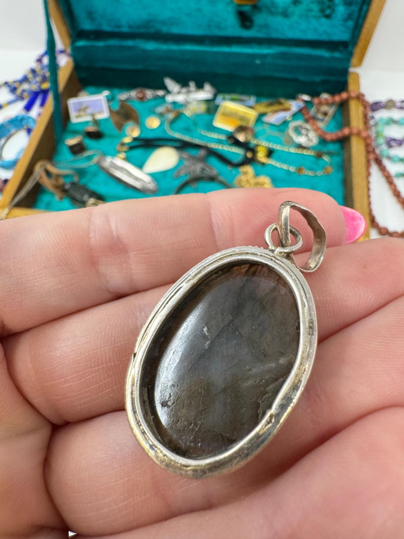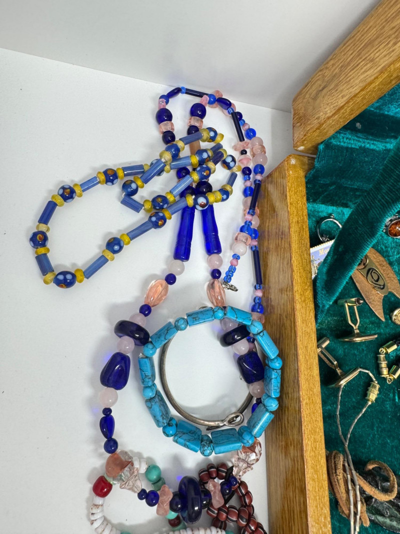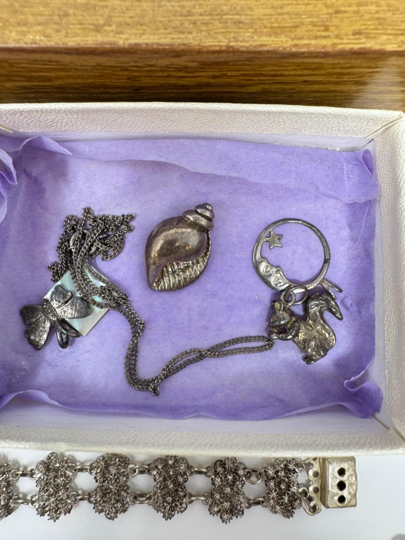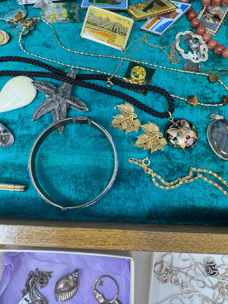 Eclectic Jewelry Box Treasure Trove – Sterling, Stones & Costume Finds. Disclaimer: We do not test the metals of the items listed for auction. By placing a bid, you acknowledge and agree that you are purchasing the item "as is" and without any guarantee of metal quality. We do not offer refunds based on metal content or purity.