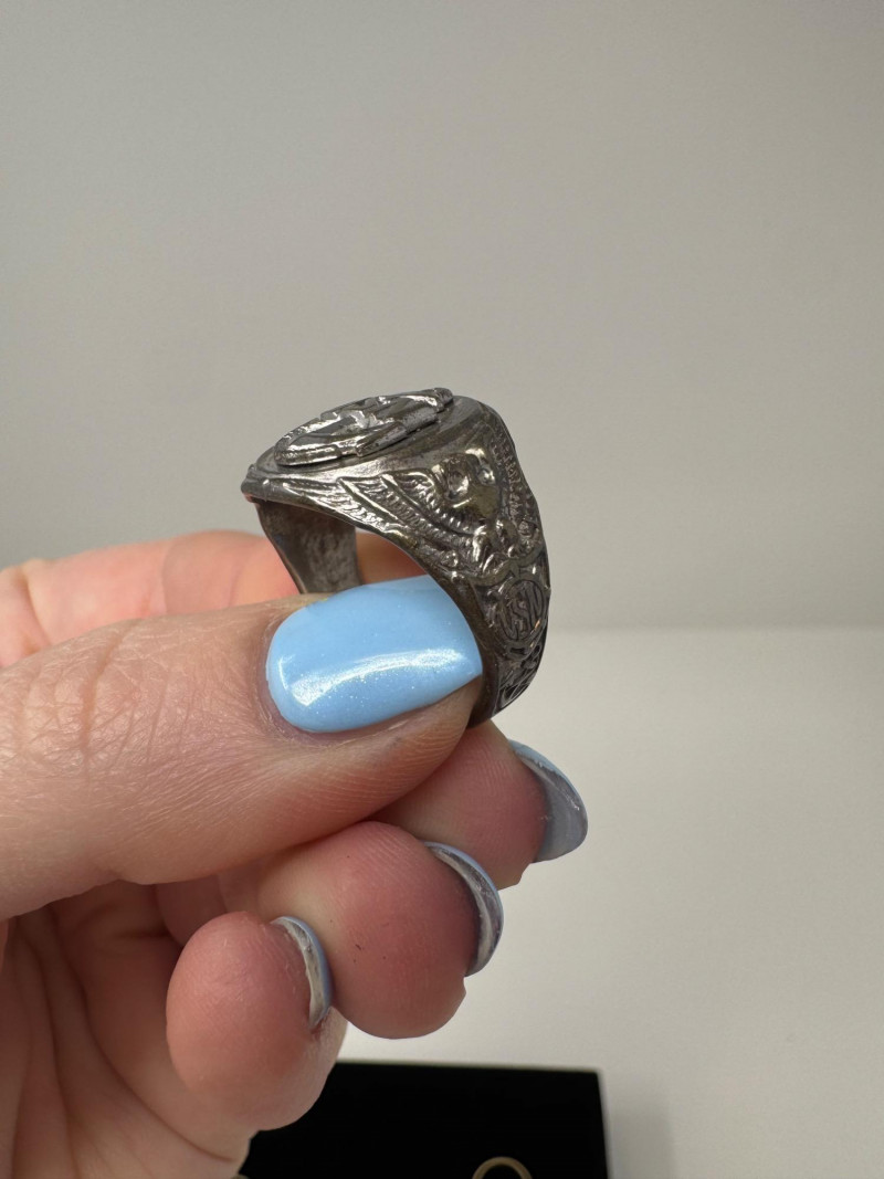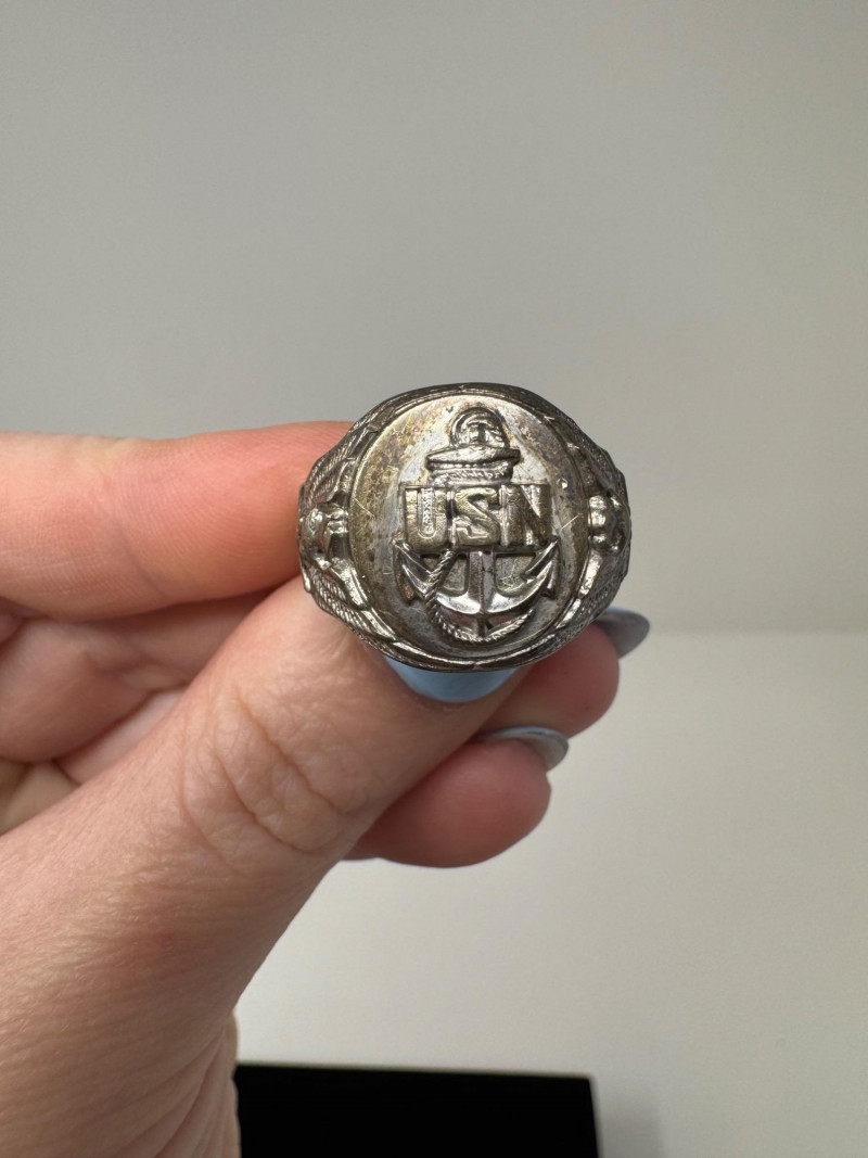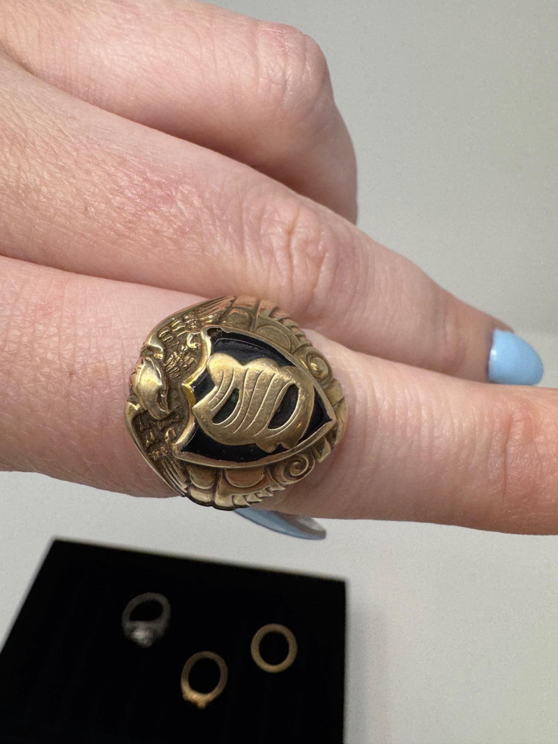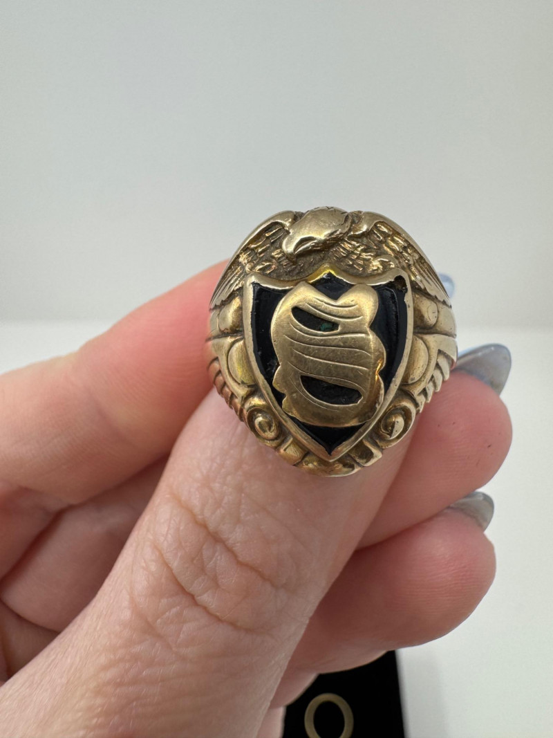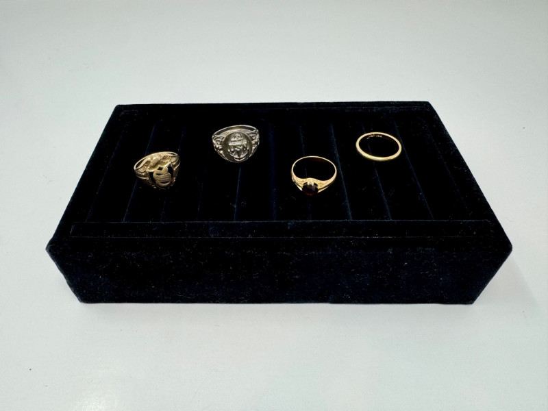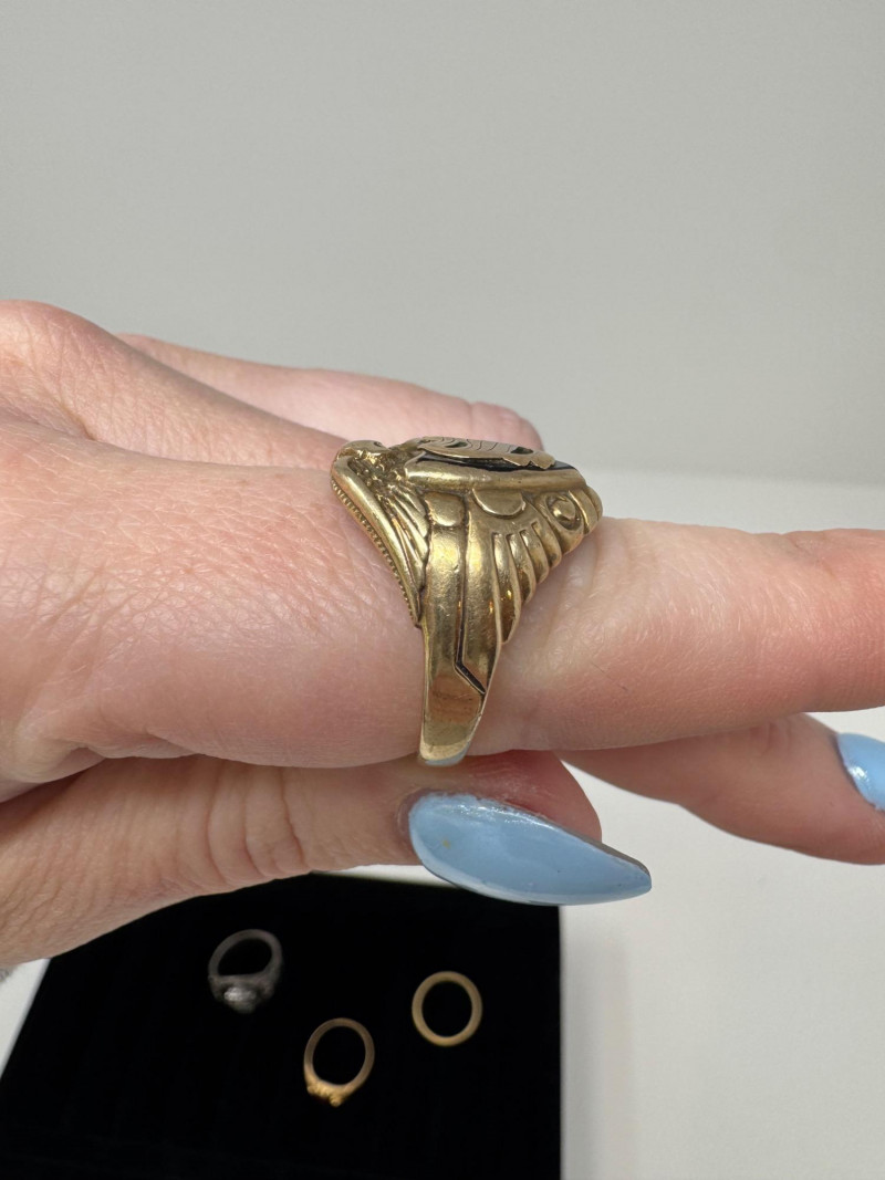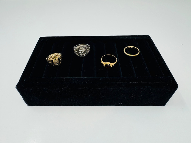 Mixed Ring Lot – 10K, 14K Gold, Sterling – 25.1g Total Weight. 10K Gold Gothic/Initial Ring – Approx. 5.25g, black enamel with gold "S" and eagle crest motif Sterling Silver U.S. Navy Ring – Bold insignia with anchor and “USN,” approx. 11.76g Mystery Gold-Tone Ring w/ Red Stone – No gold mark, deep garnet-colored stone, approx. 4.93g 14K Gold Wedding Band – Classic style, marked, approx. 3.15g Total Weight: 25.1 grams (mixed metals)
