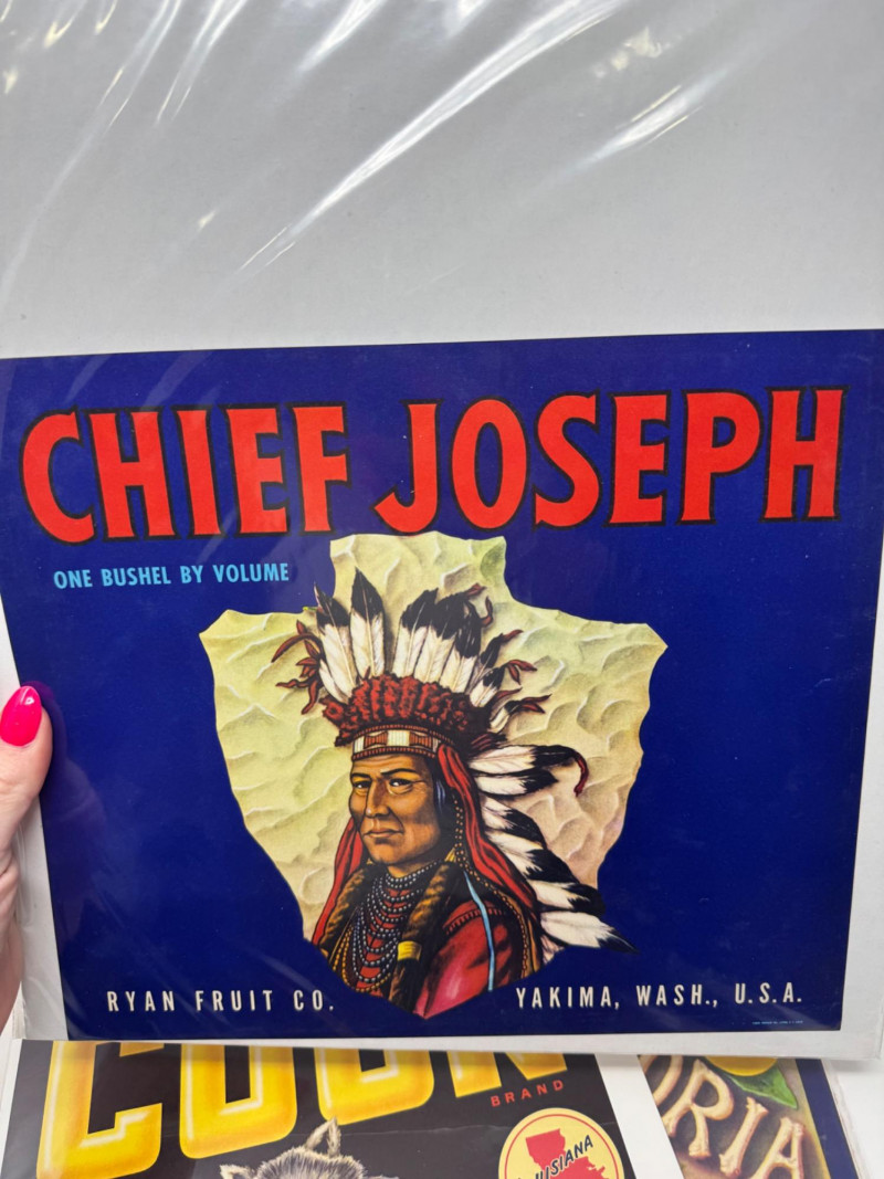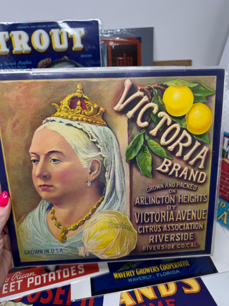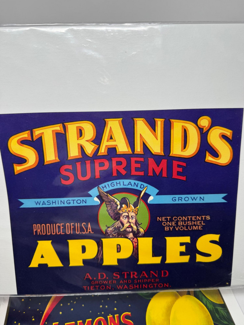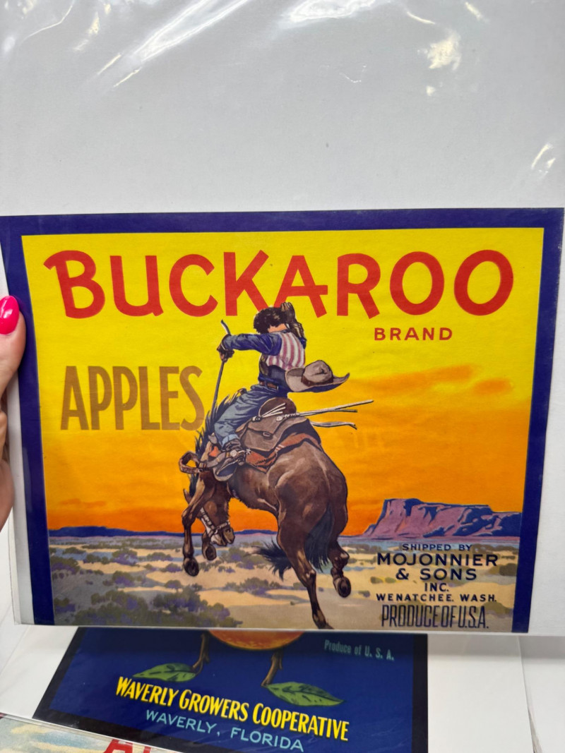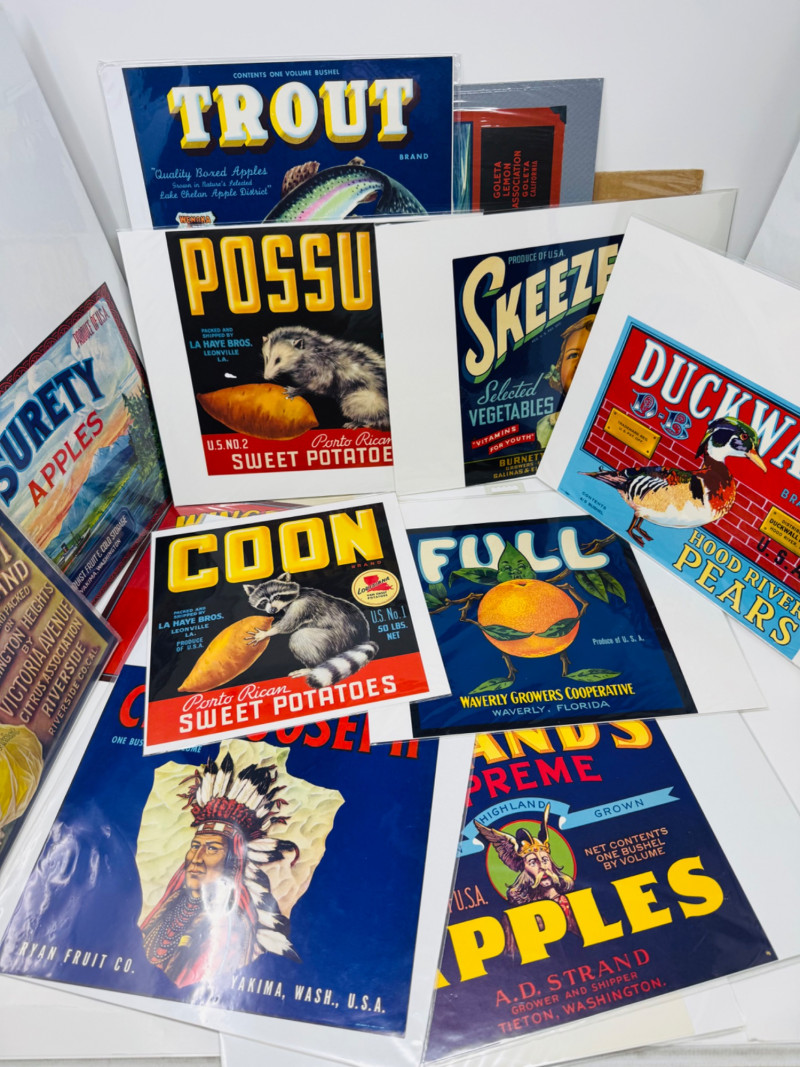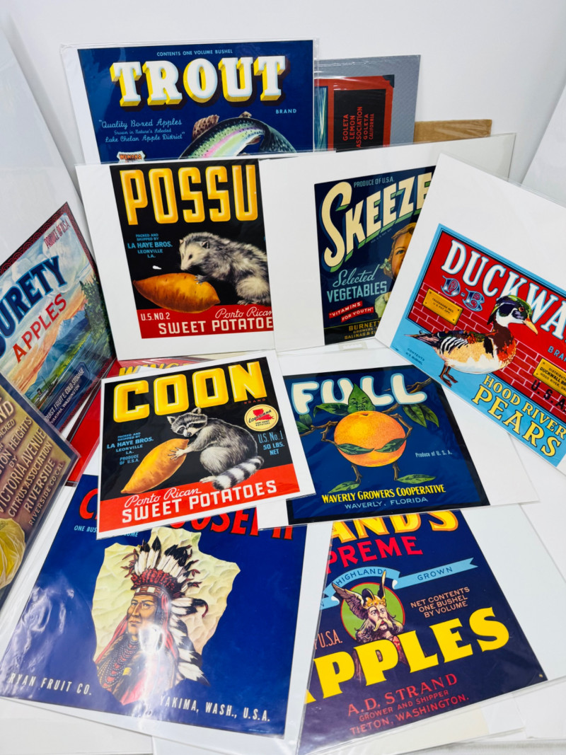 #2: 21-pc New Old Stock Vintage Fruit Crate Labels – Trout, Big Wolf + Buckaroo Brand And More.Common Label Examples:
