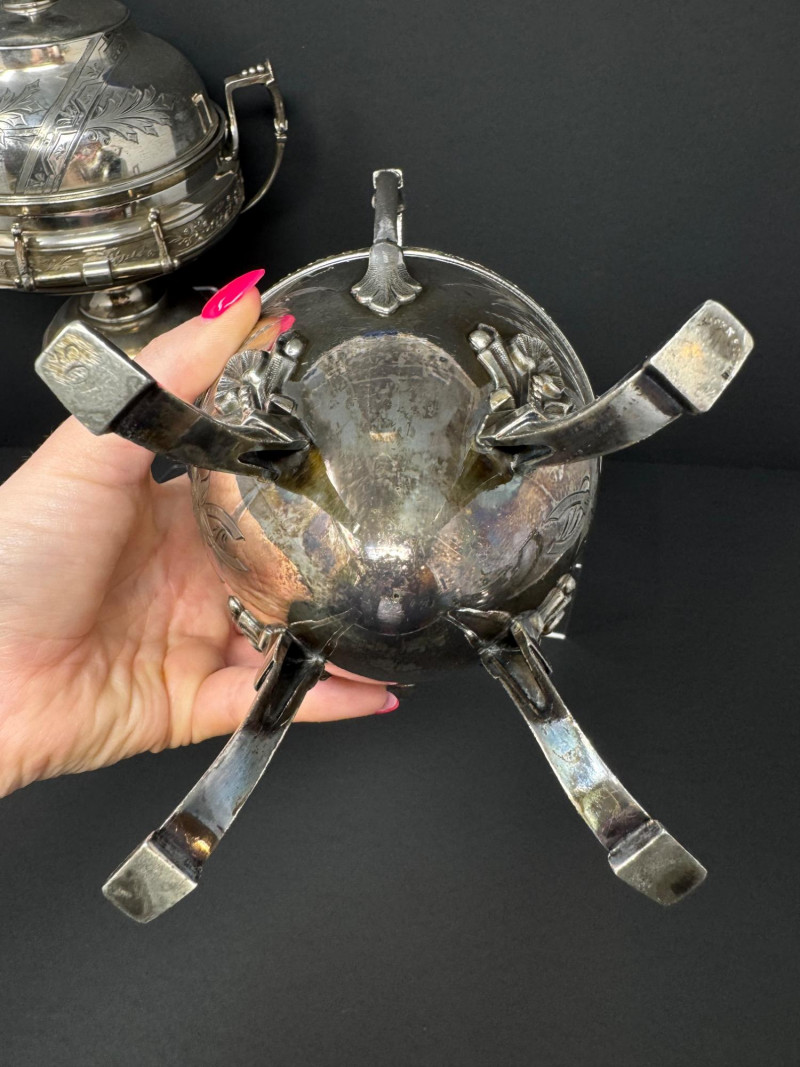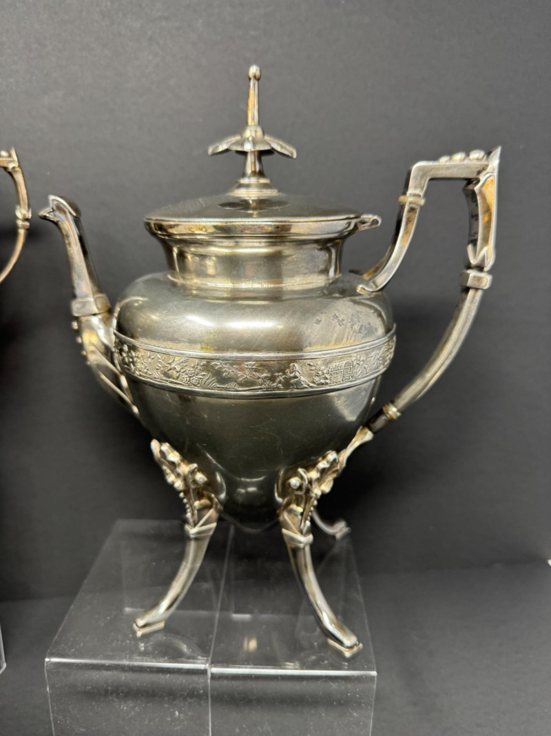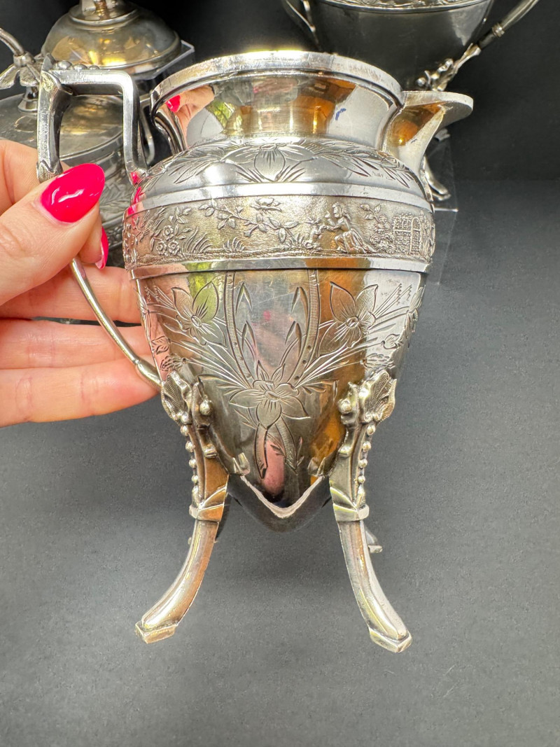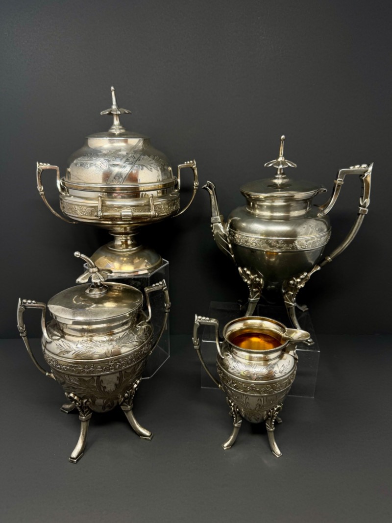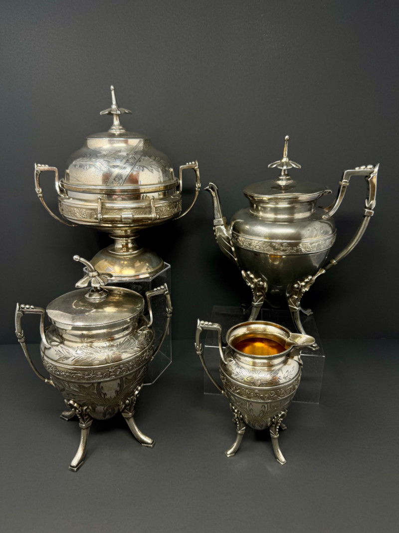 Victorian Aesthetic Era Silver Plate Tea Set w/ Domed Butter Dish. Tallest Piece 10.5” Tall Disclaimer: We do not test the metals of the items listed for auction. By placing a bid, you acknowledge and agree that you are purchasing the item "as is" and without any guarantee of metal quality. We do not offer refunds based on metal content or purity.