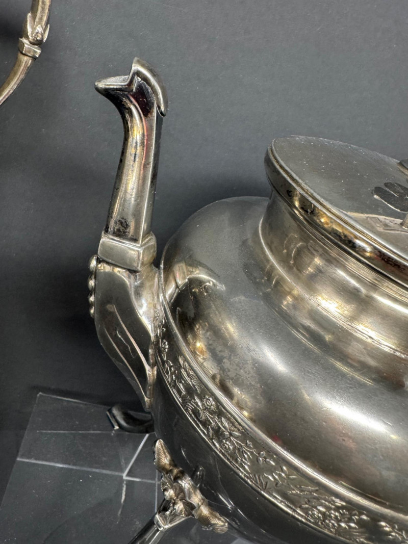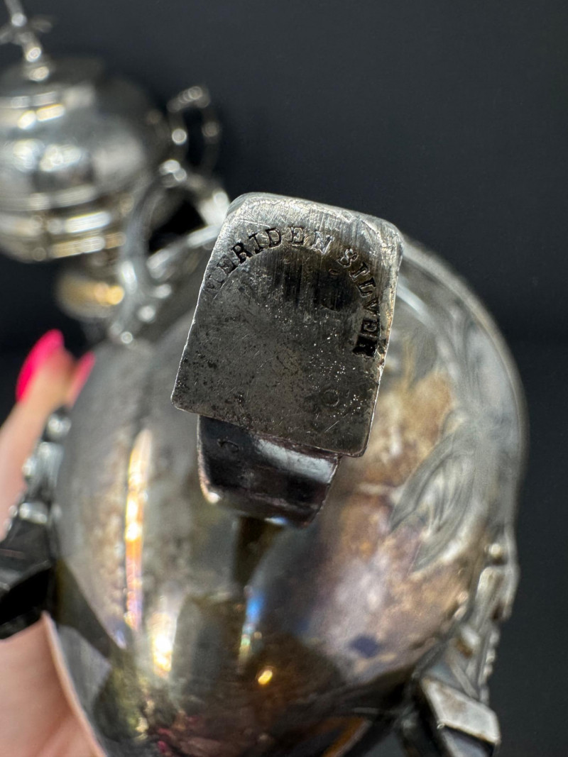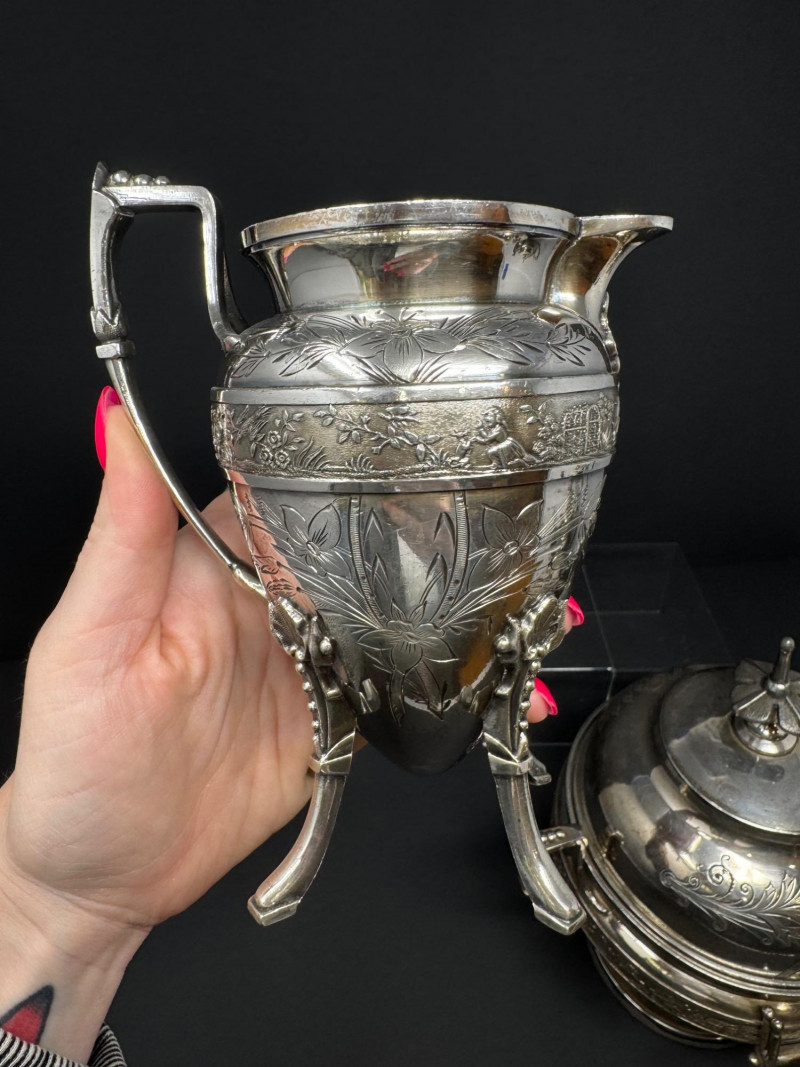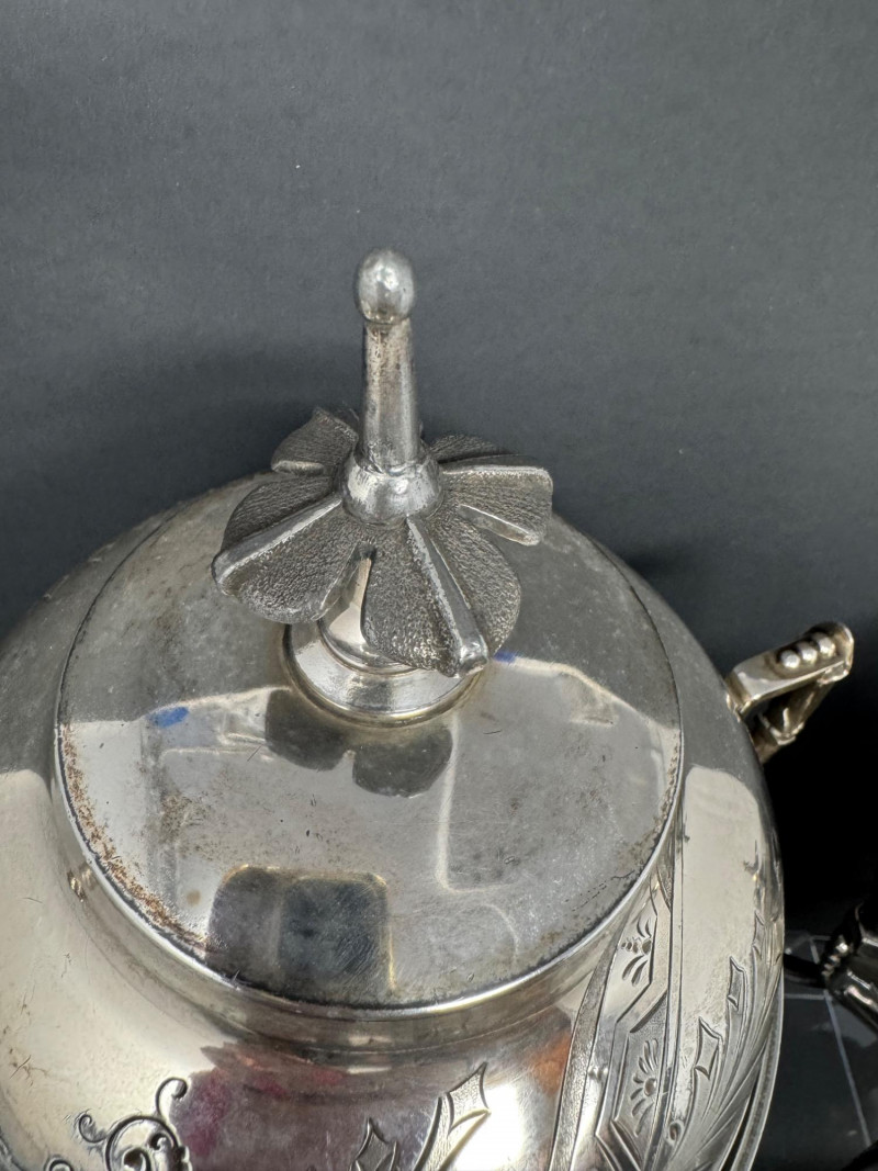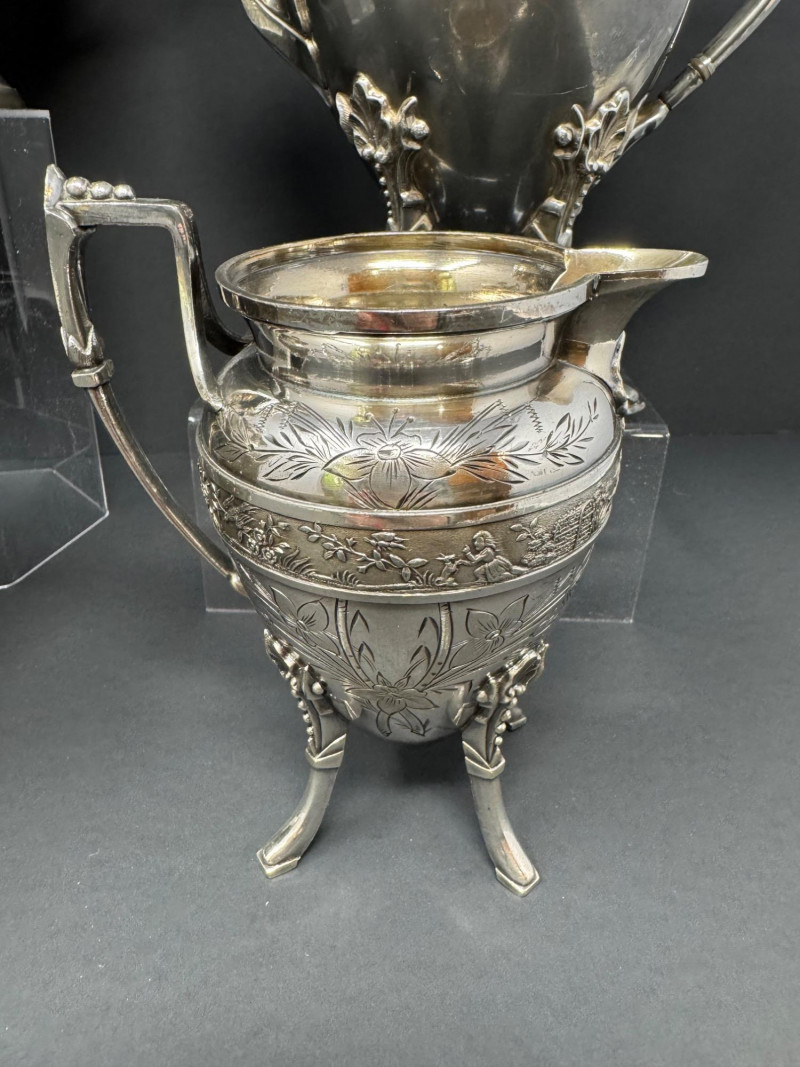 Victorian Aesthetic Era Silver Plate Tea Set w/ Domed Butter Dish. Tallest Piece 10.5” Tall Disclaimer: We do not test the metals of the items listed for auction. By placing a bid, you acknowledge and agree that you are purchasing the item "as is" and without any guarantee of metal quality. We do not offer refunds based on metal content or purity.