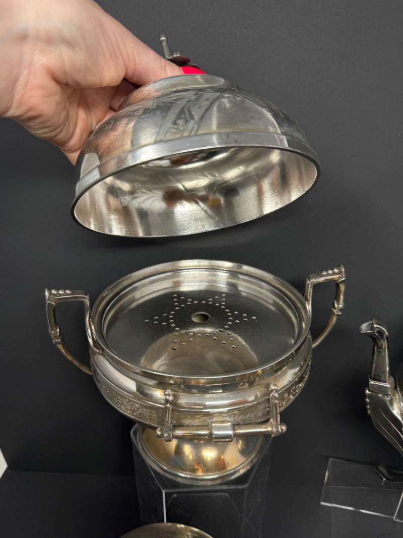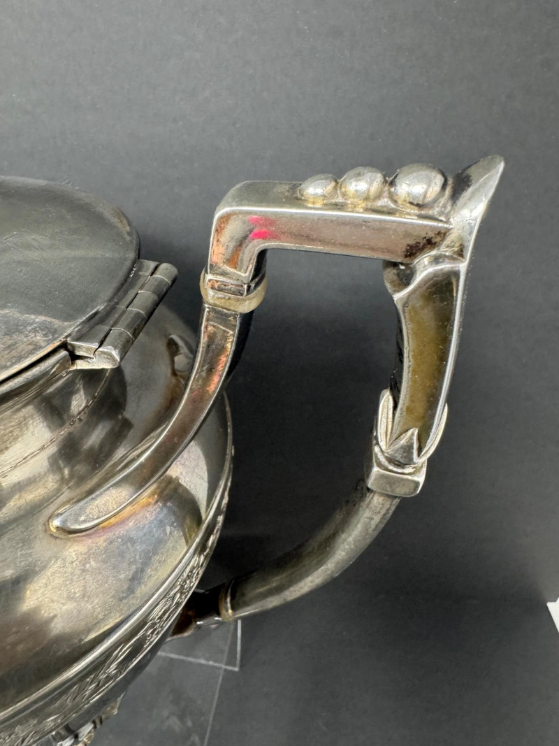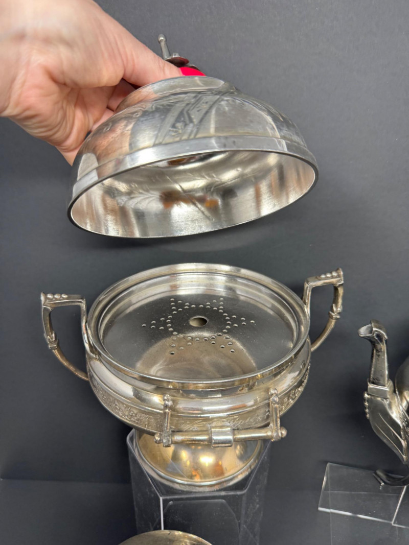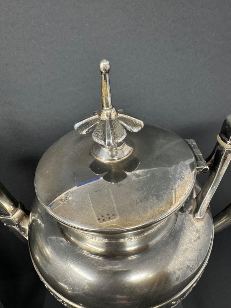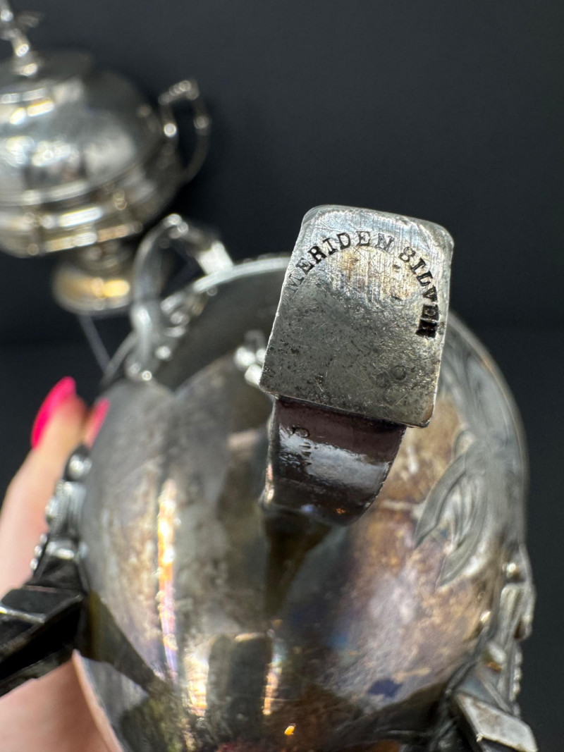 Victorian Aesthetic Era Silver Plate Tea Set w/ Domed Butter Dish. Tallest Piece 10.5” Tall Disclaimer: We do not test the metals of the items listed for auction. By placing a bid, you acknowledge and agree that you are purchasing the item "as is" and without any guarantee of metal quality. We do not offer refunds based on metal content or purity.