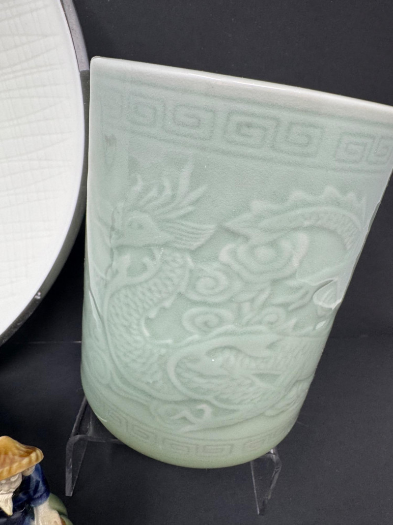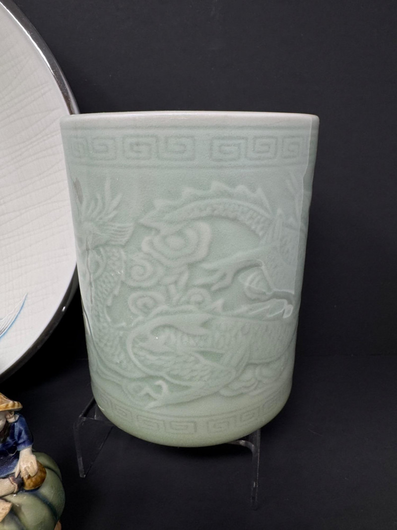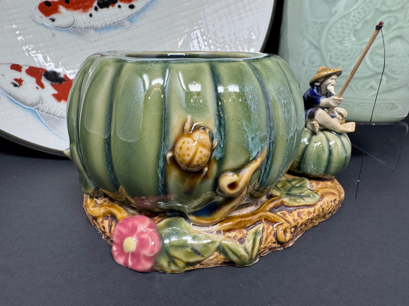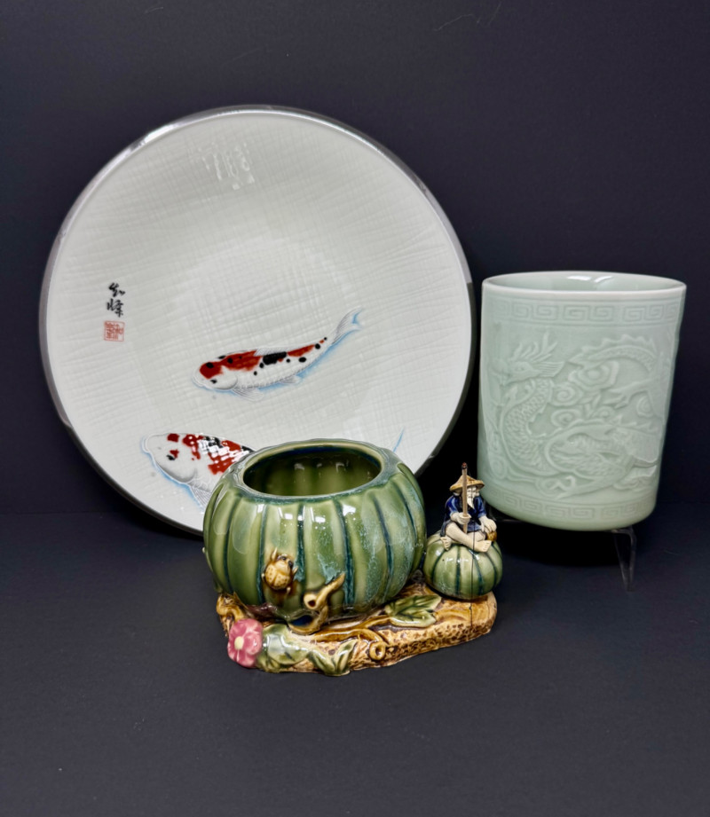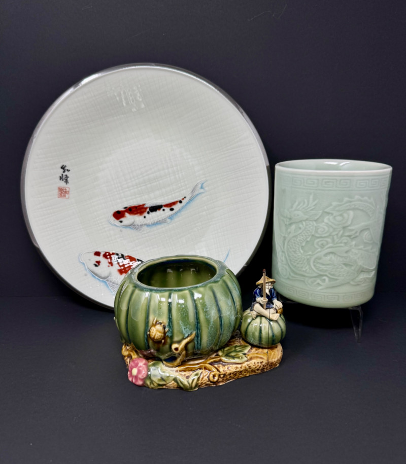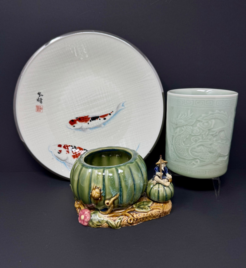Vintage Asian Porcelain Trio – Koi Bowl, Celadon Brush Pot & Mudman Vase.