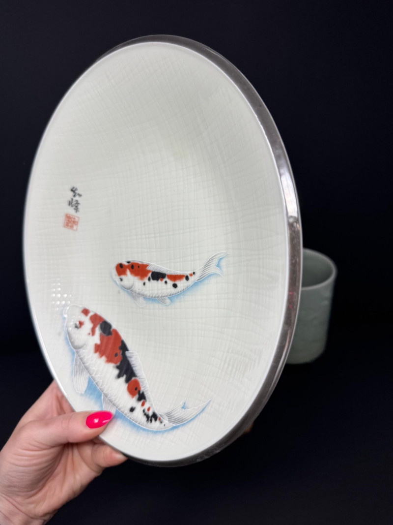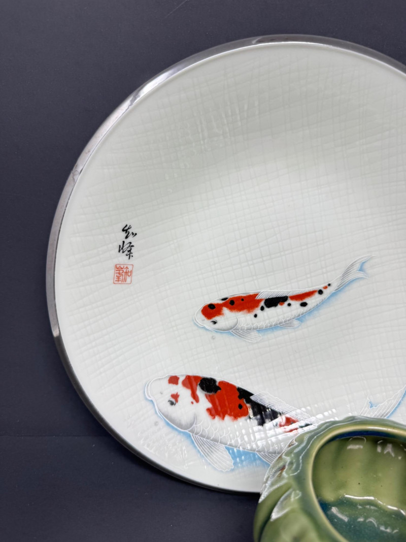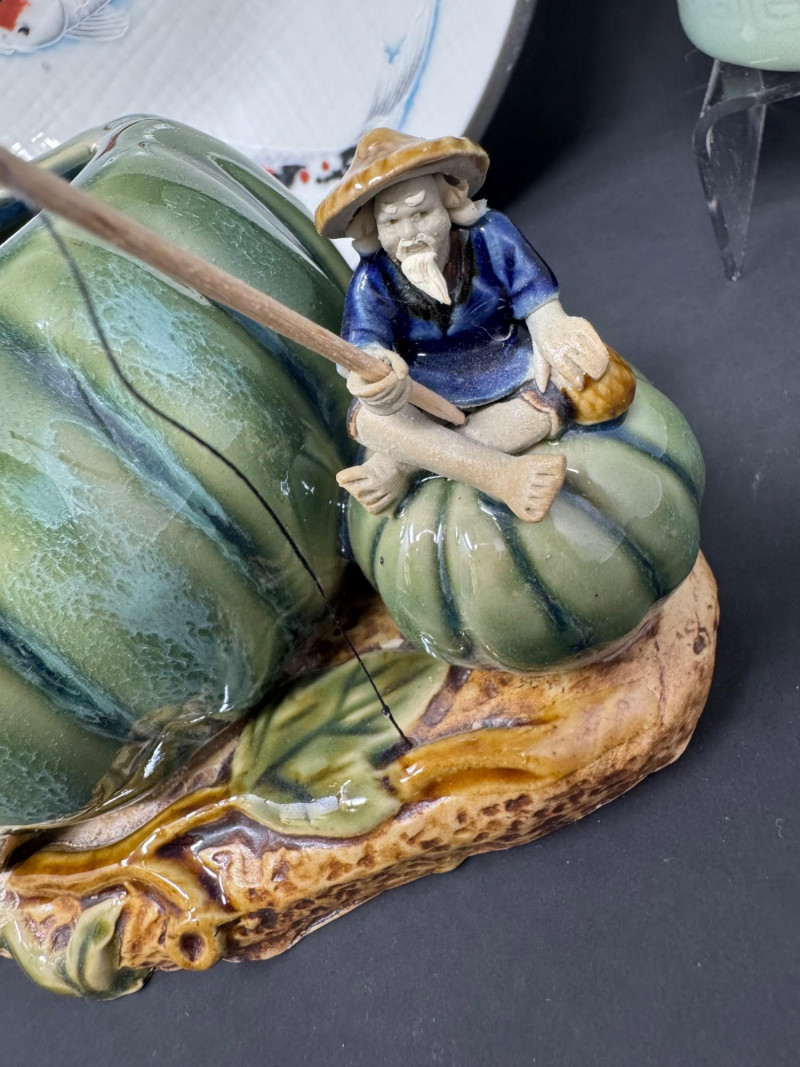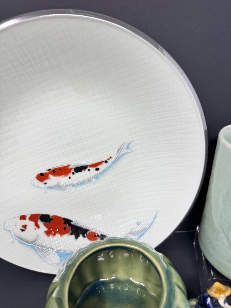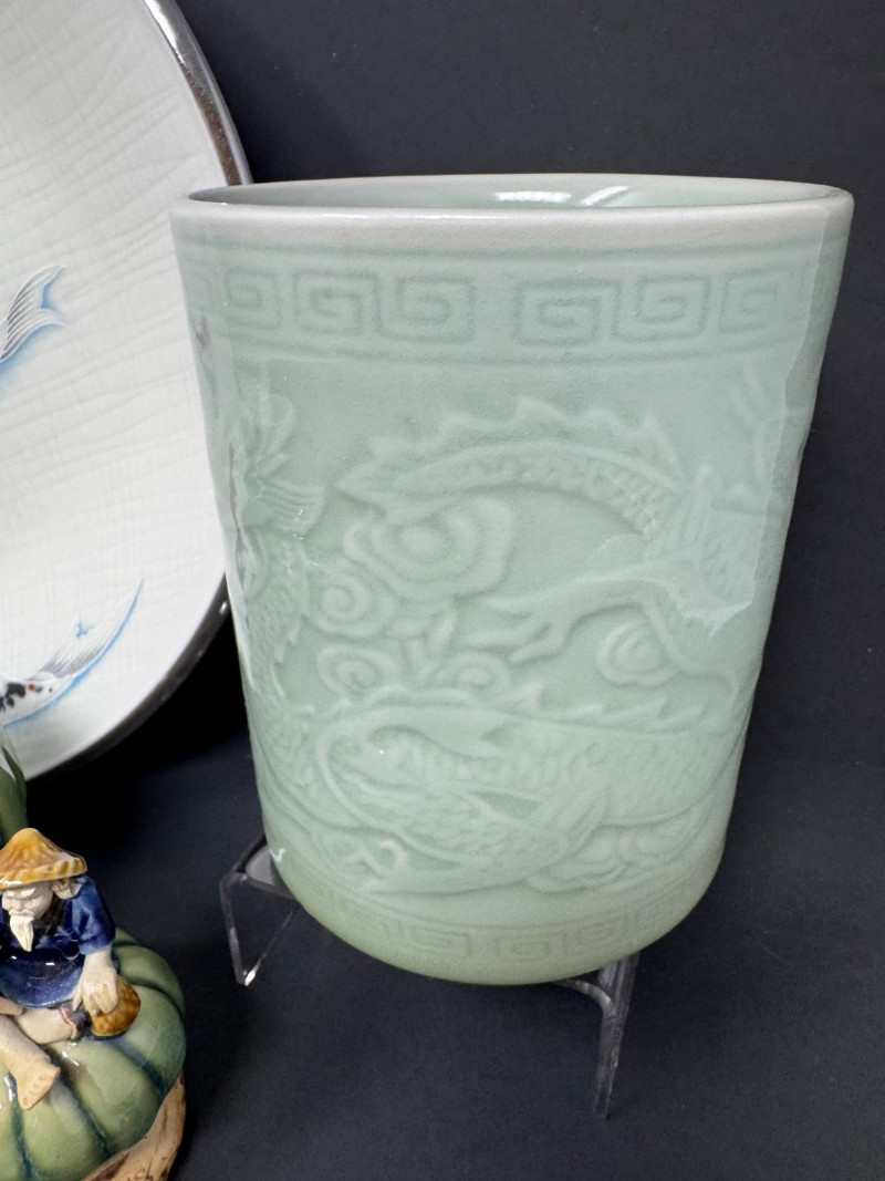 Vintage Asian Porcelain Trio – Koi Bowl, Celadon Brush Pot & Mudman Vase.