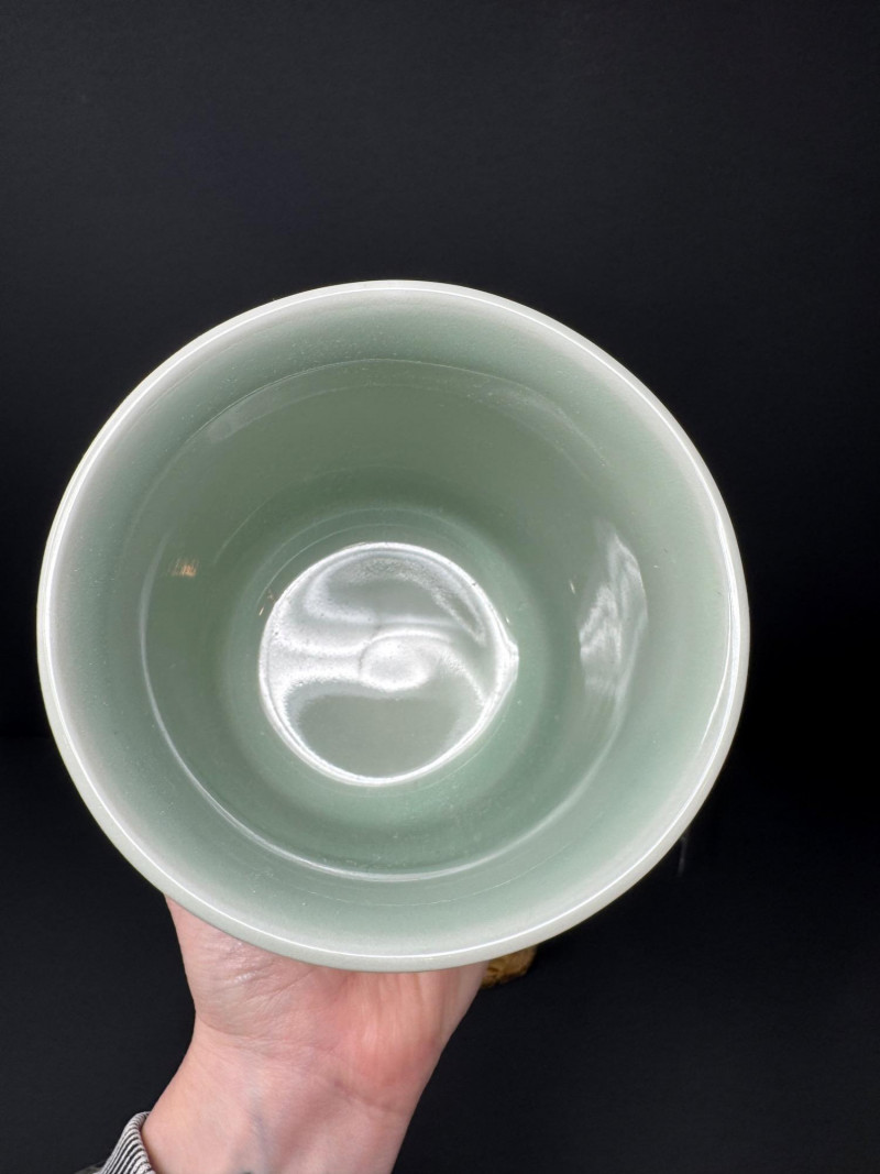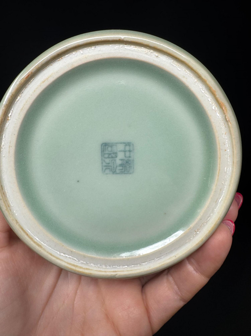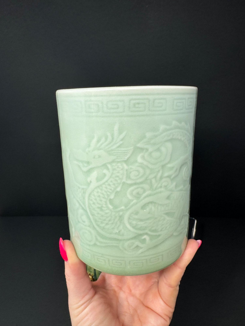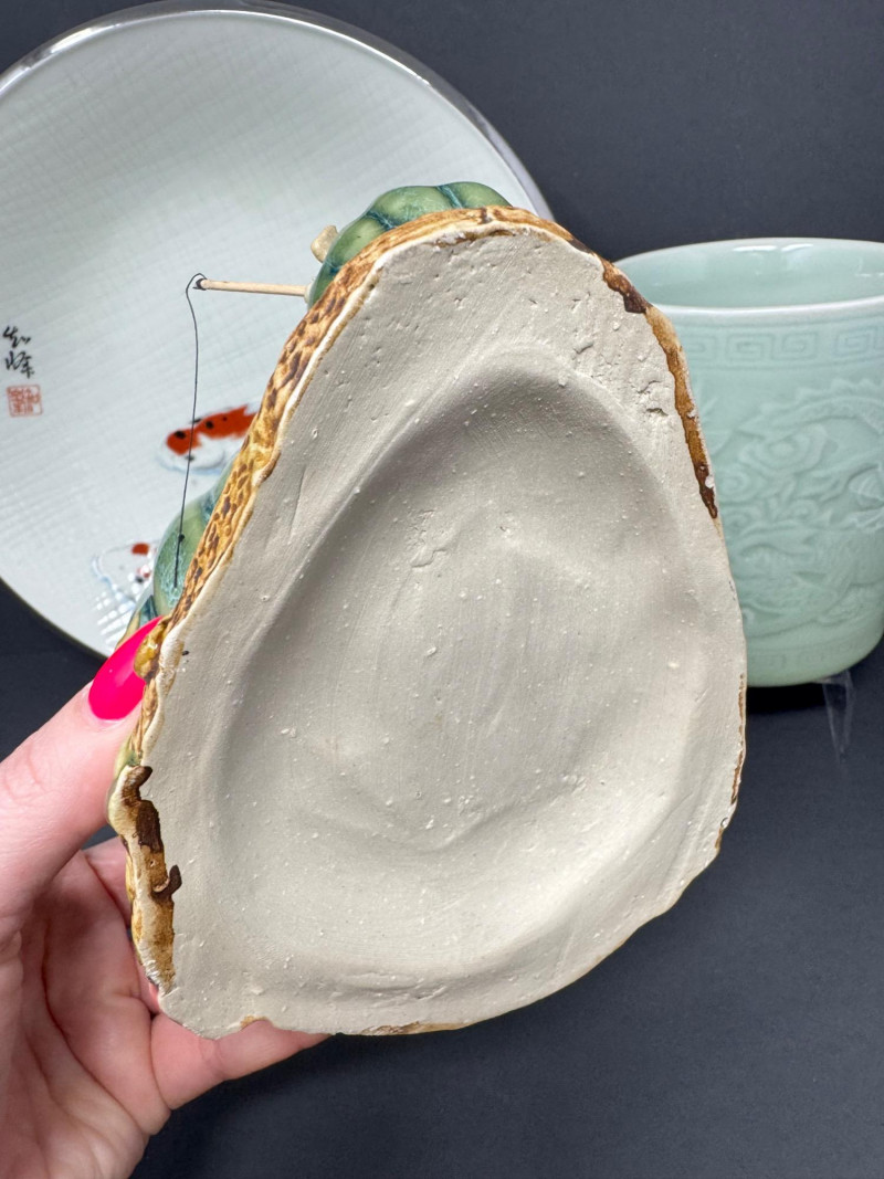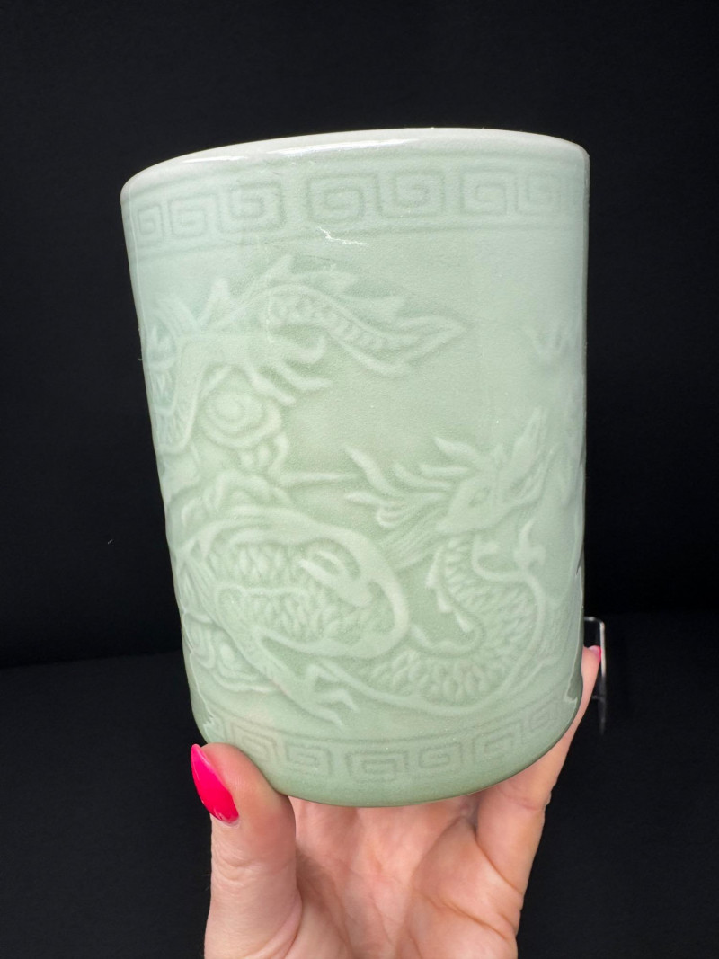 Vintage Asian Porcelain Trio – Koi Bowl, Celadon Brush Pot & Mudman Vase.