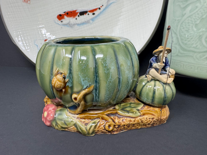 Lot # 50 - Vintage Asian Porcelain Trio: Koi Bowl, Celadon Pot & Mudman Vase