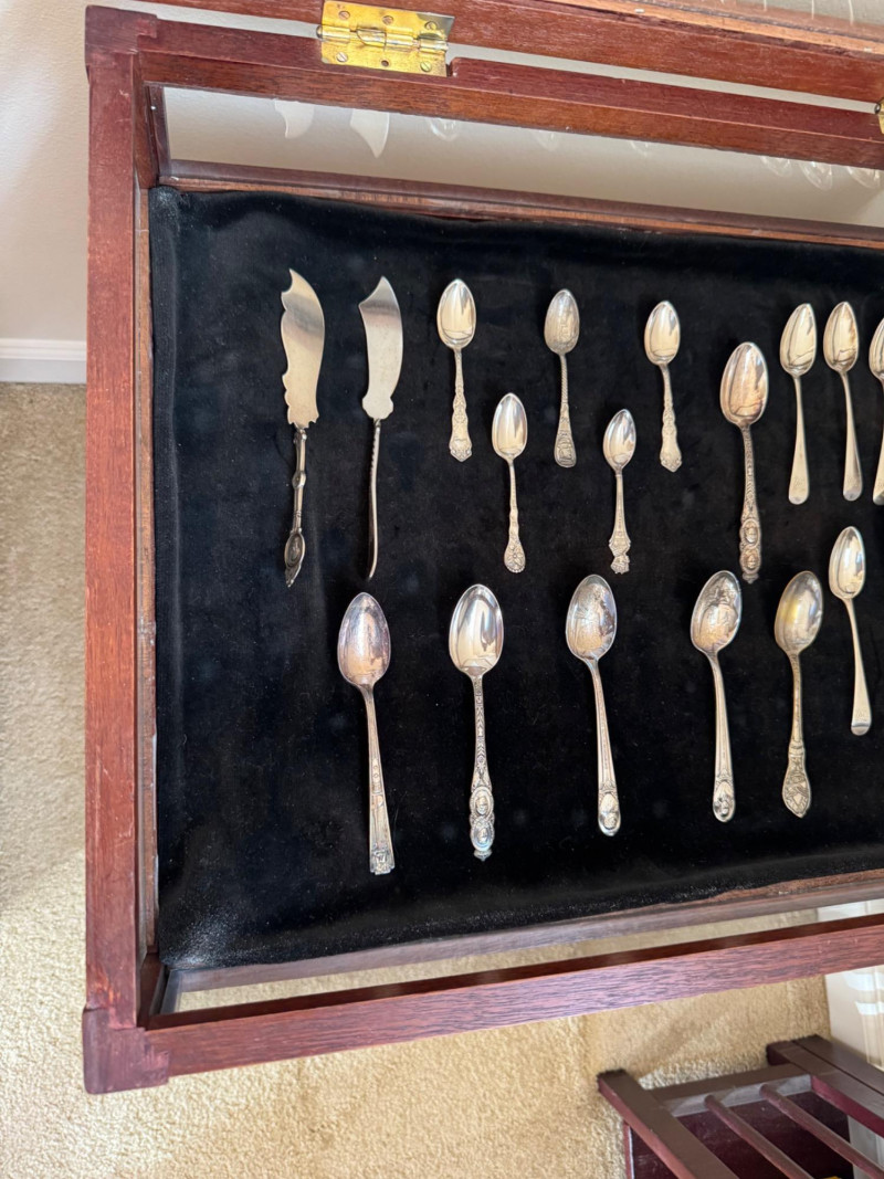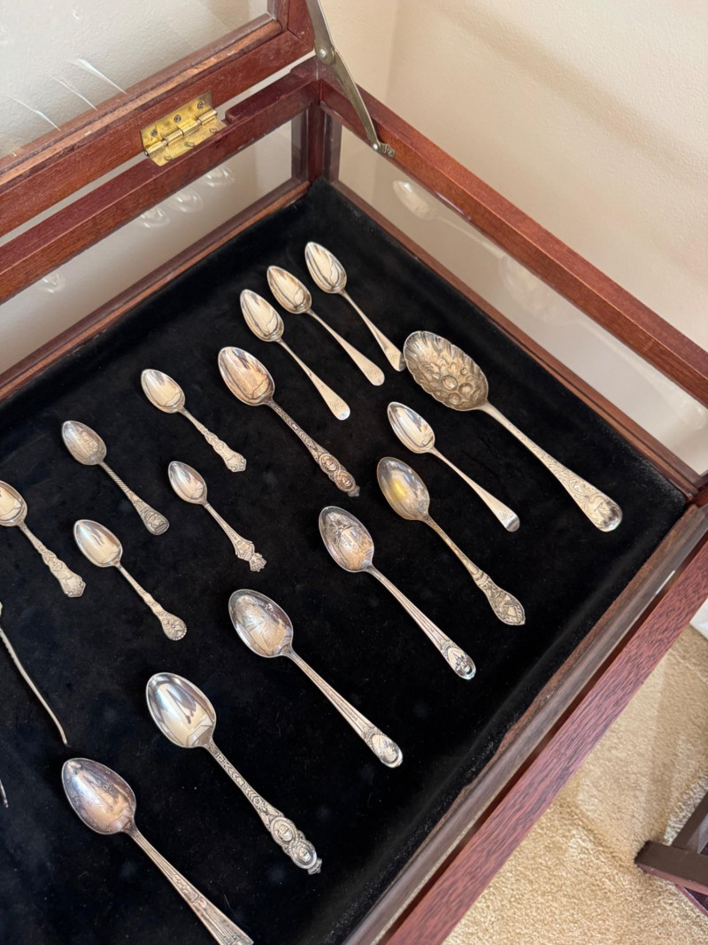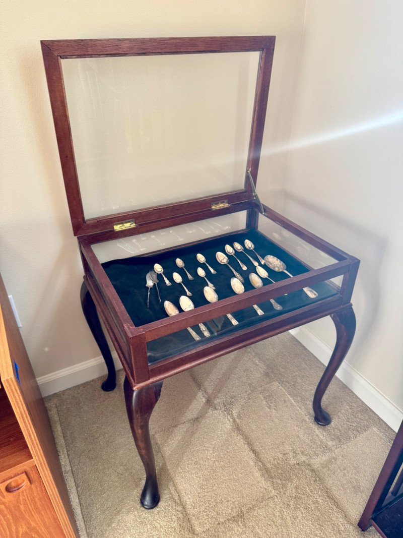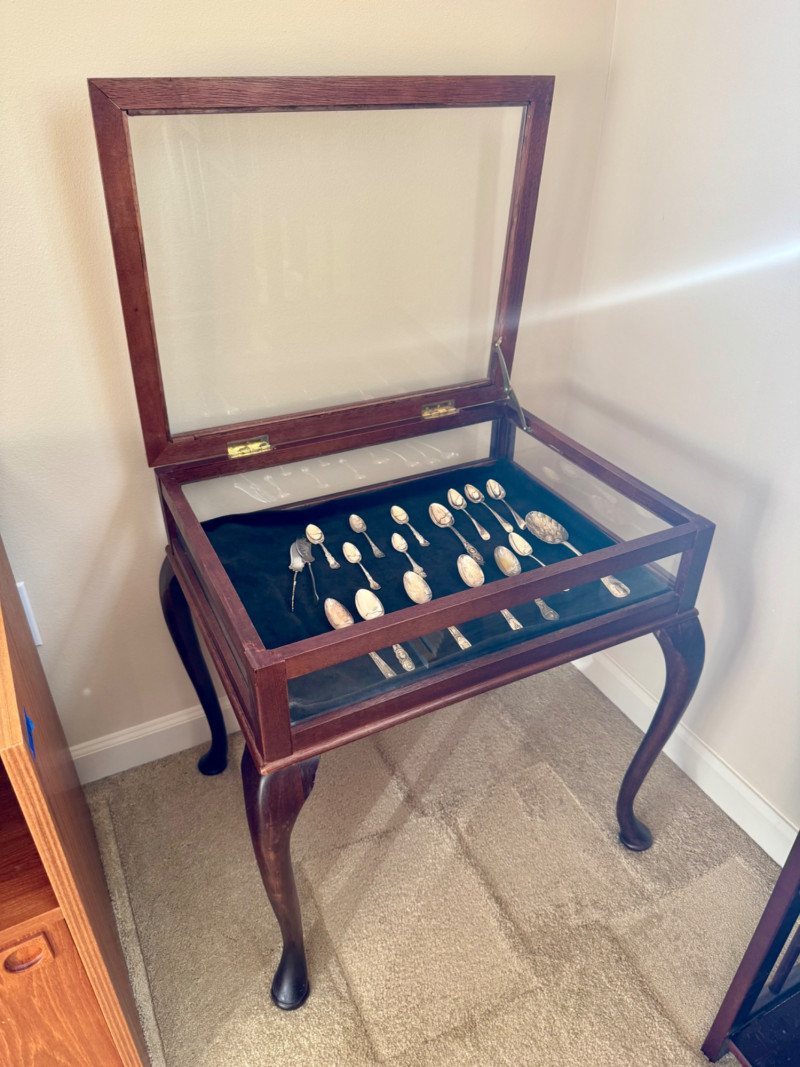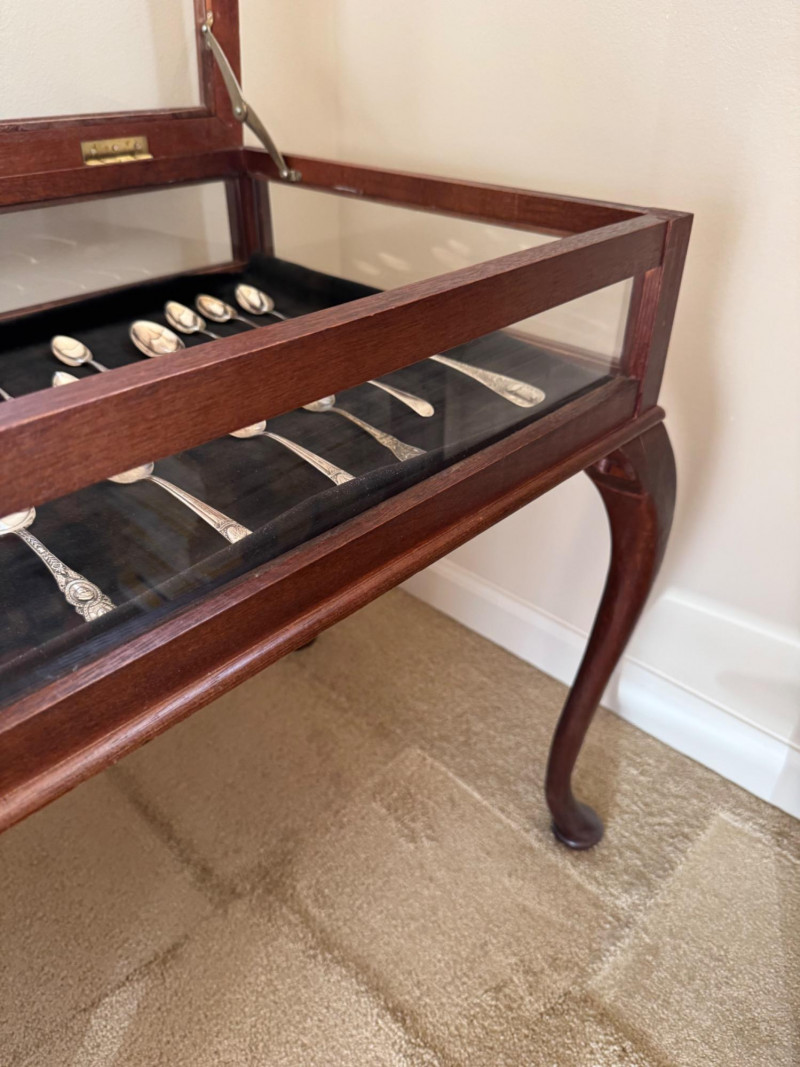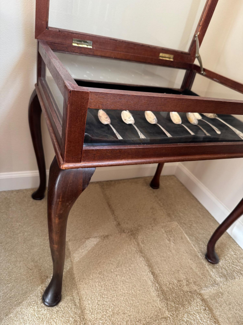 Vintage Queen Anne Display Table w/ Silverplate Souvenir Spoons. 22.5” Wide 18” Deep 24” Tall Please note: Most spoons are marked as silverplate, while some are unmarked. None have been tested for metal content—please bid accordingly and as-is.