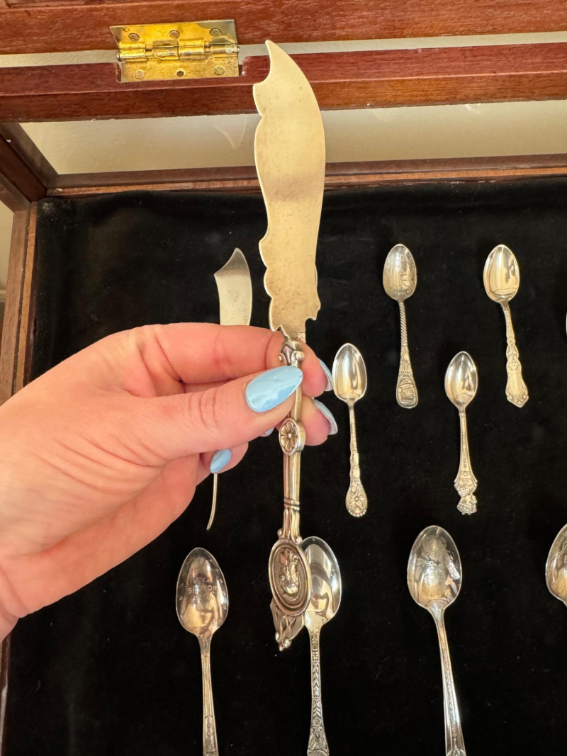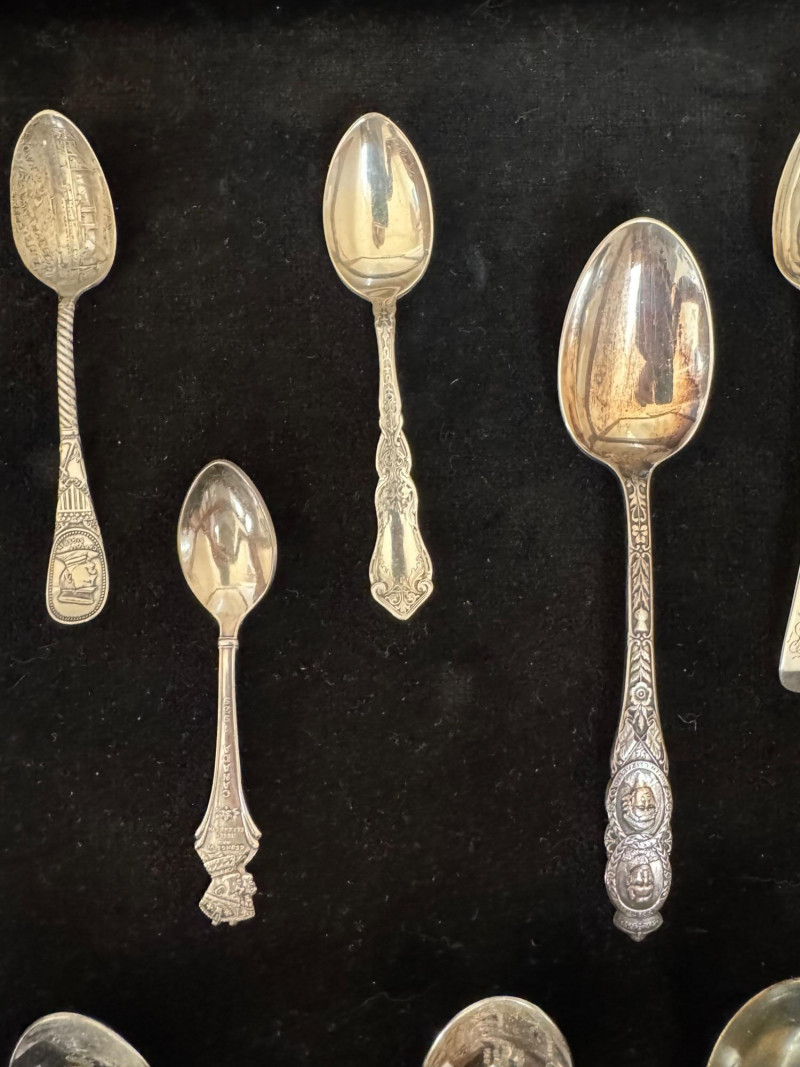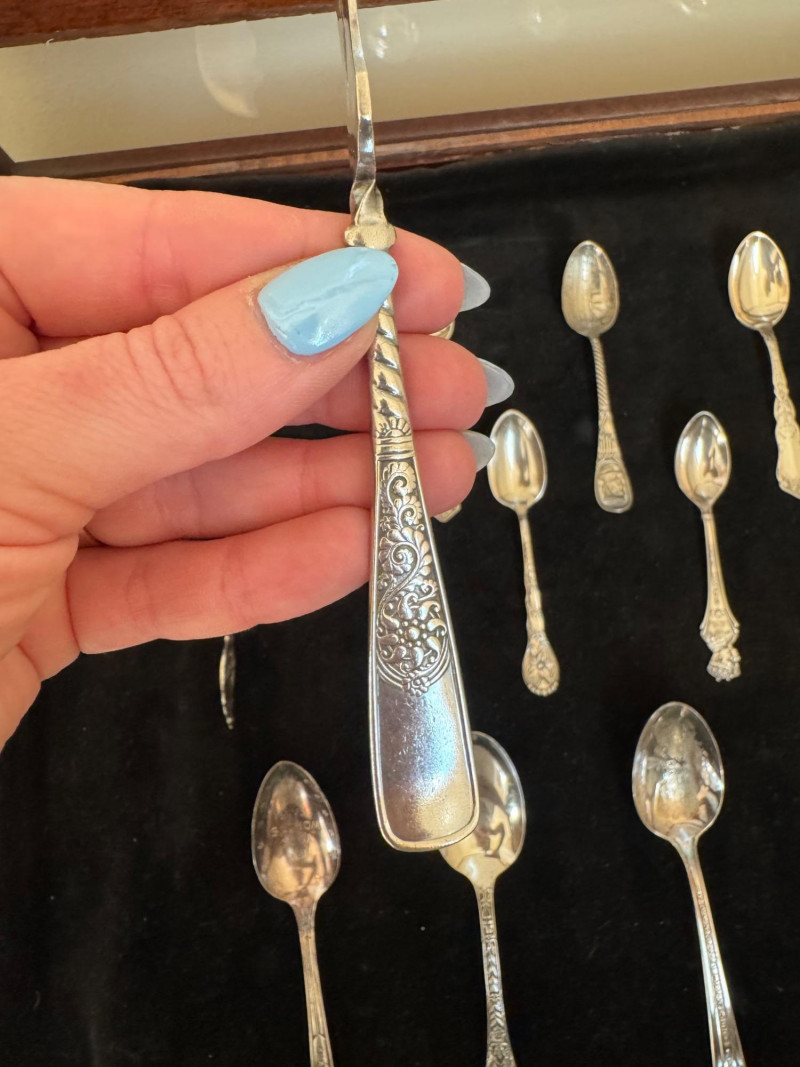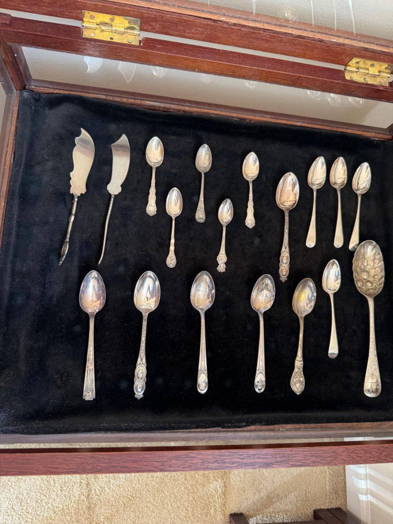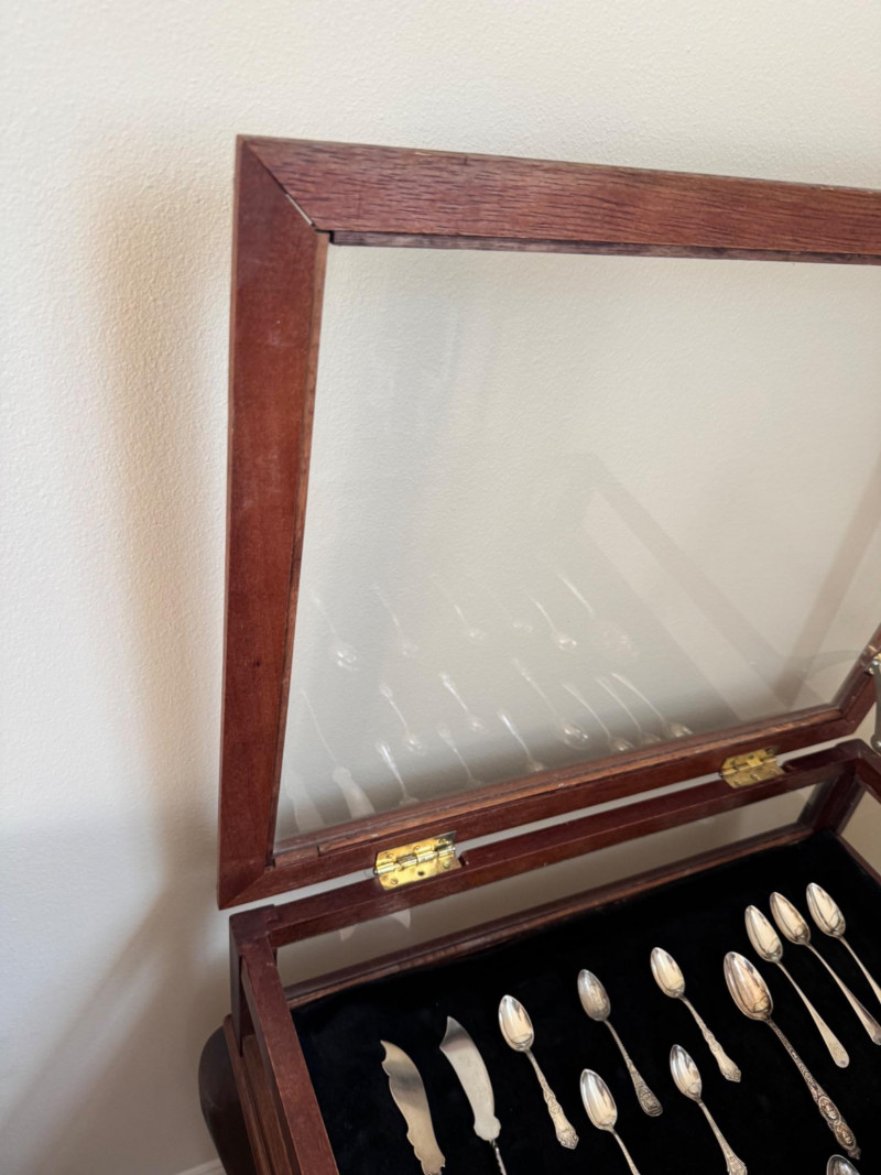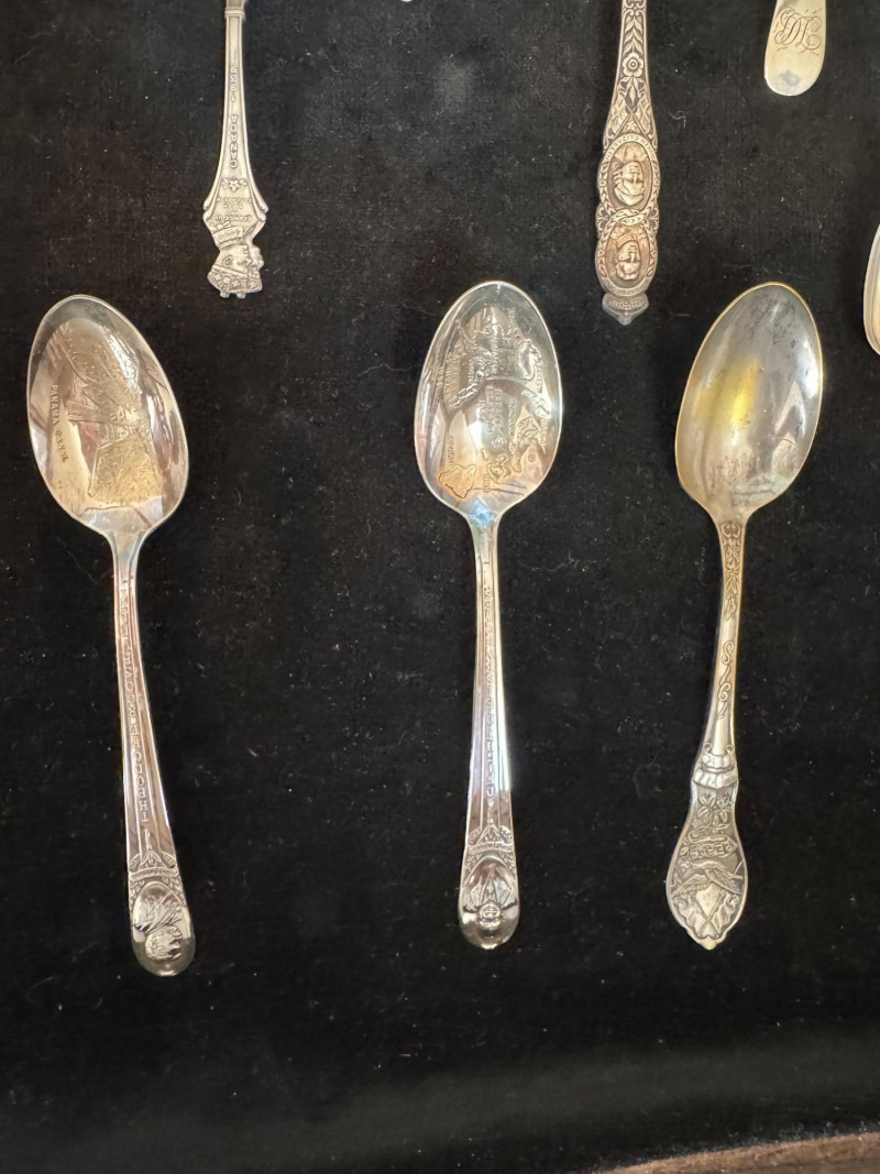 Vintage Queen Anne Display Table w/ Silverplate Souvenir Spoons. 22.5” Wide 18” Deep 24” Tall Please note: Most spoons are marked as silverplate, while some are unmarked. None have been tested for metal content—please bid accordingly and as-is.
