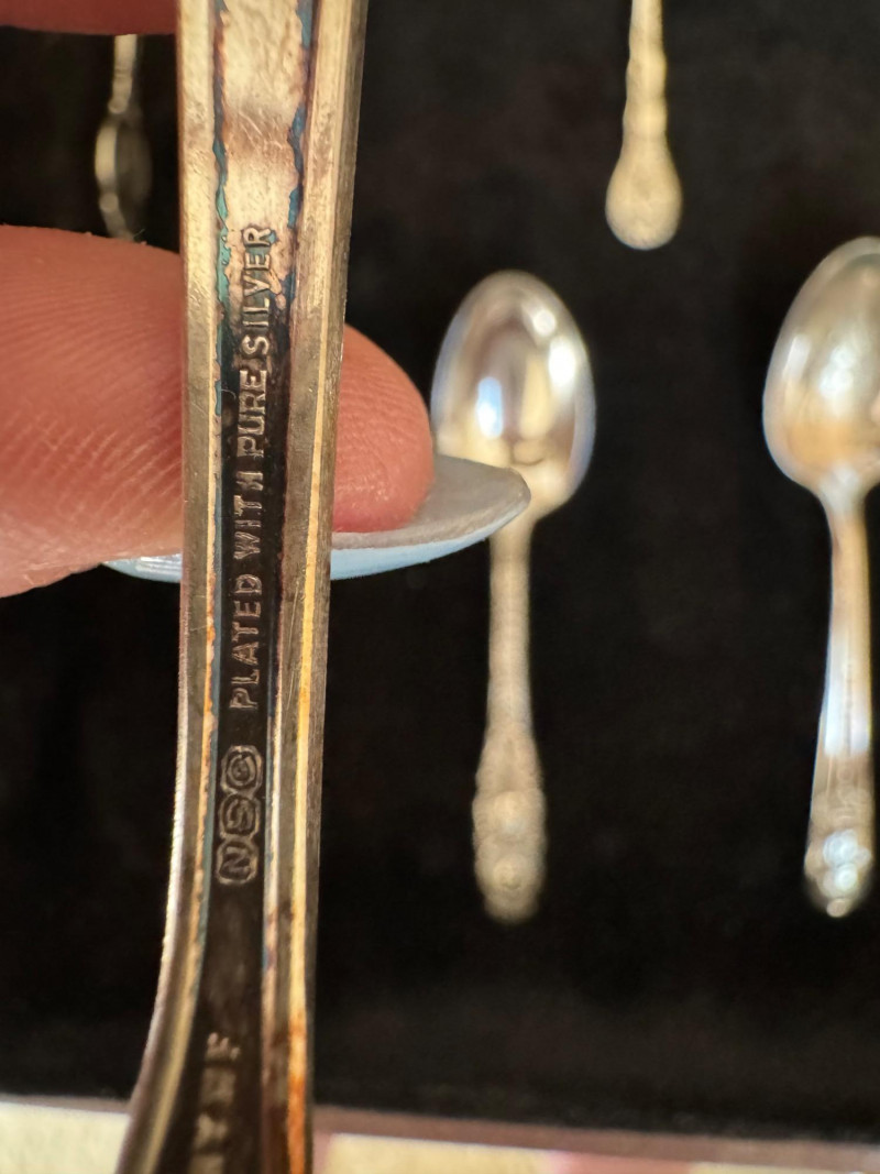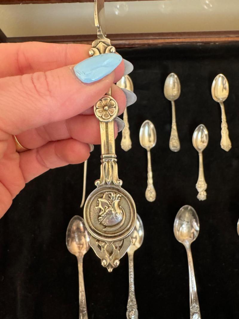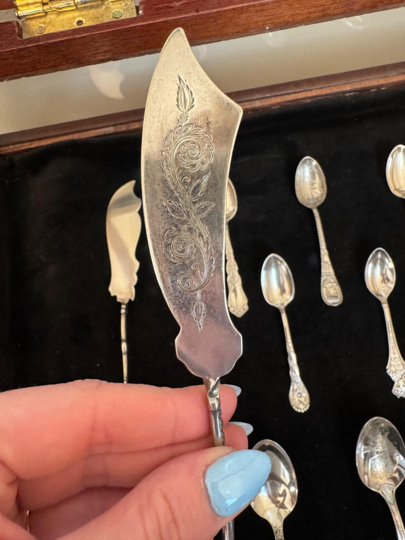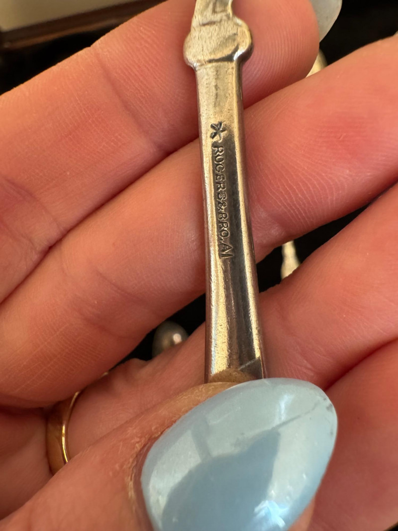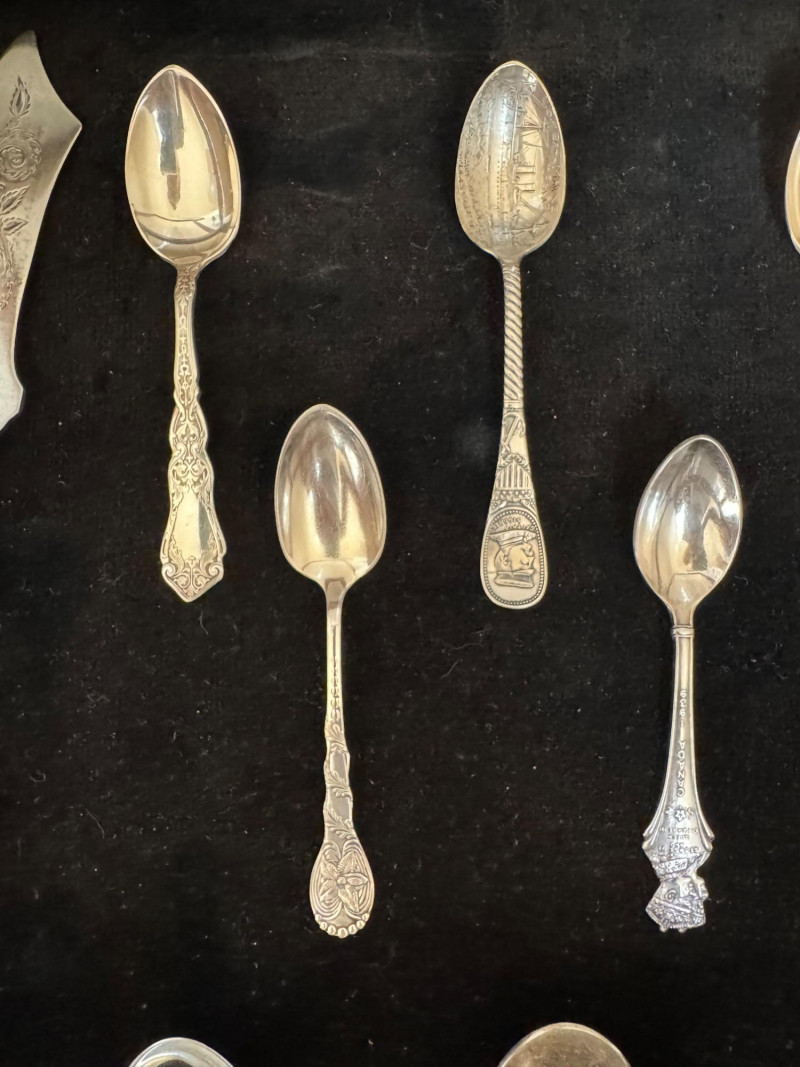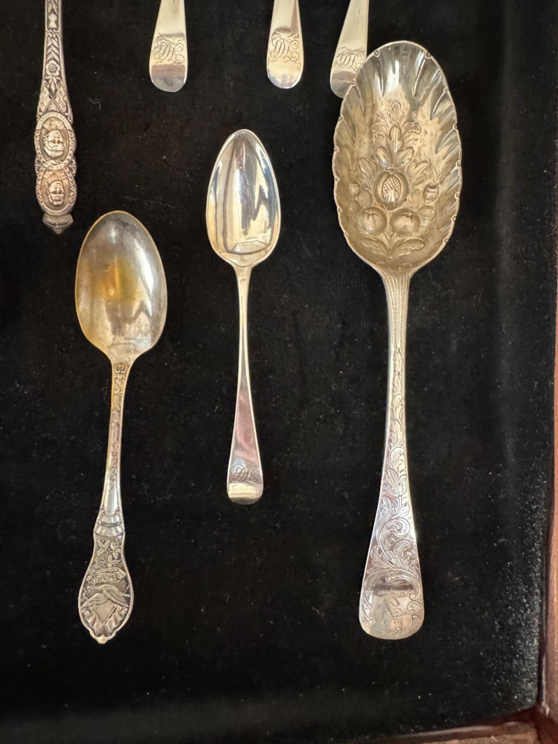 Vintage Queen Anne Display Table w/ Silverplate Souvenir Spoons. 22.5” Wide 18” Deep 24” Tall Please note: Most spoons are marked as silverplate, while some are unmarked. None have been tested for metal content—please bid accordingly and as-is.