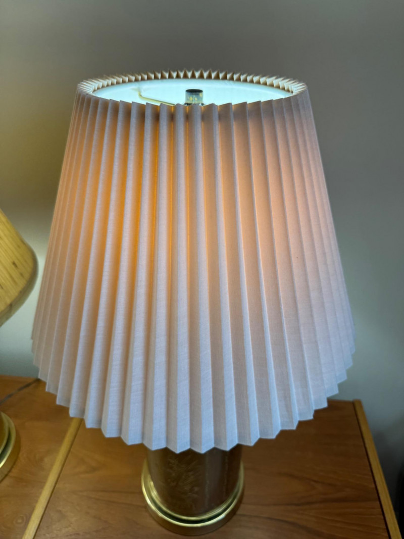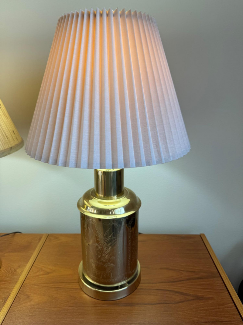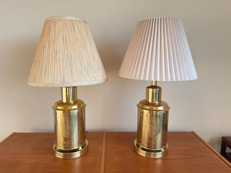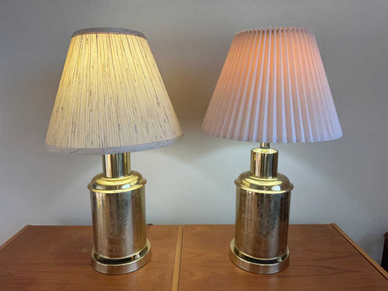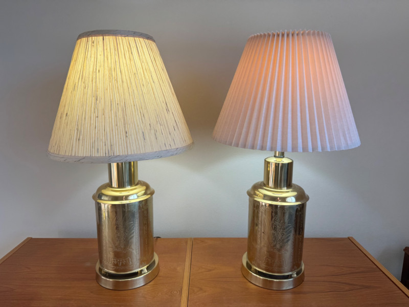 Brass Canister Lamps w/ Asian-Inspired Engravings & Pleated Shades. 26” Tall