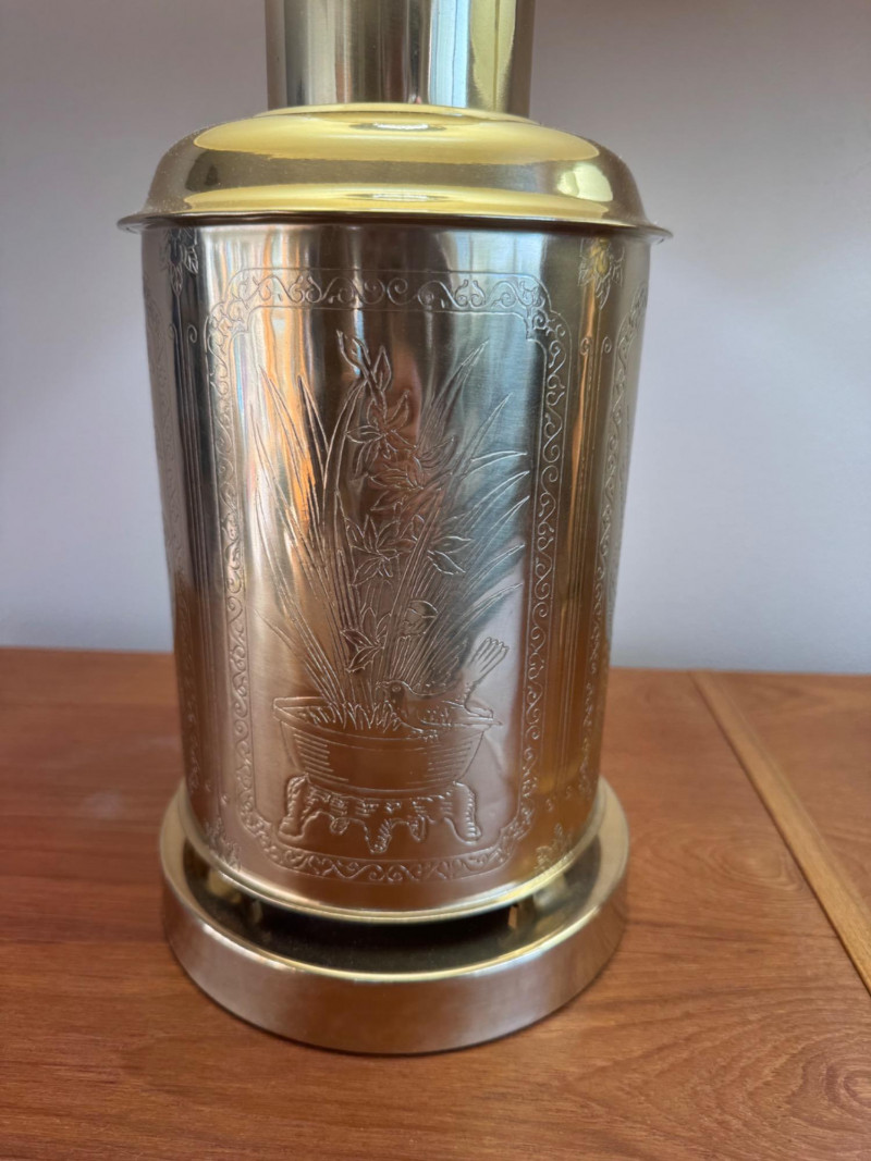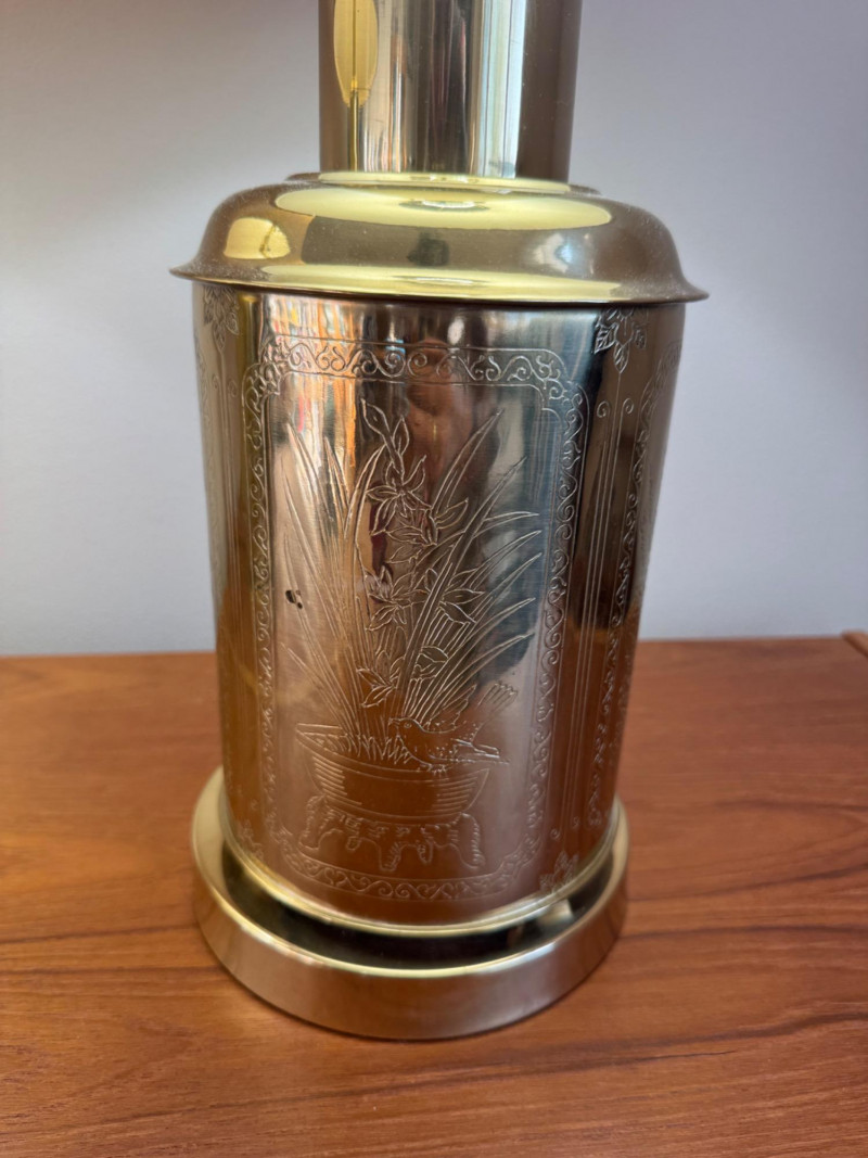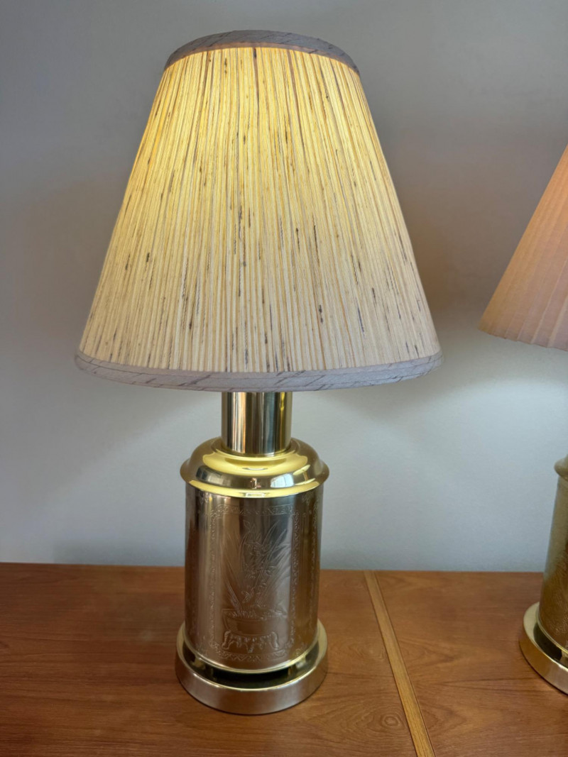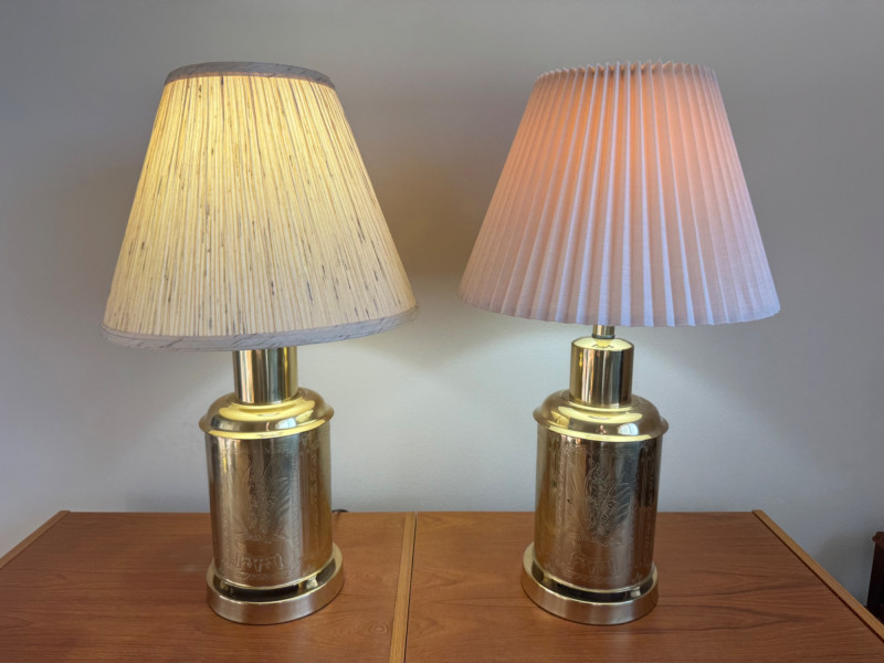 Lot # 68 - Brass Canister Lamps w/ Asian-Inspired Engravings & Pleated Shades