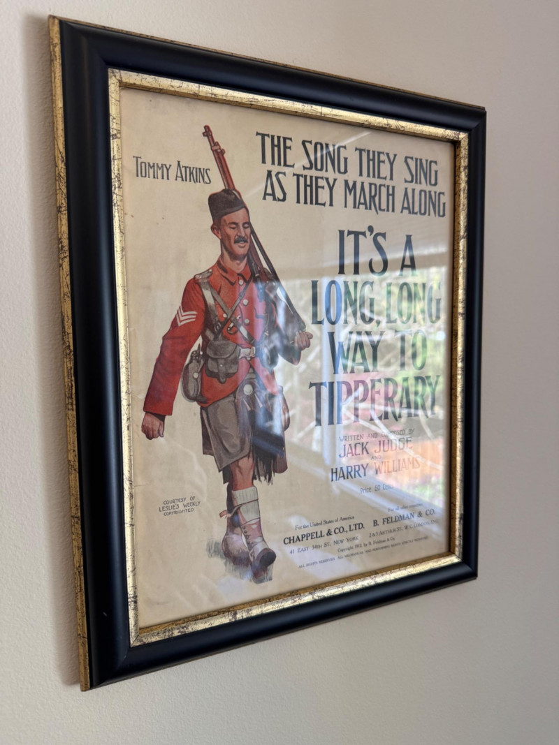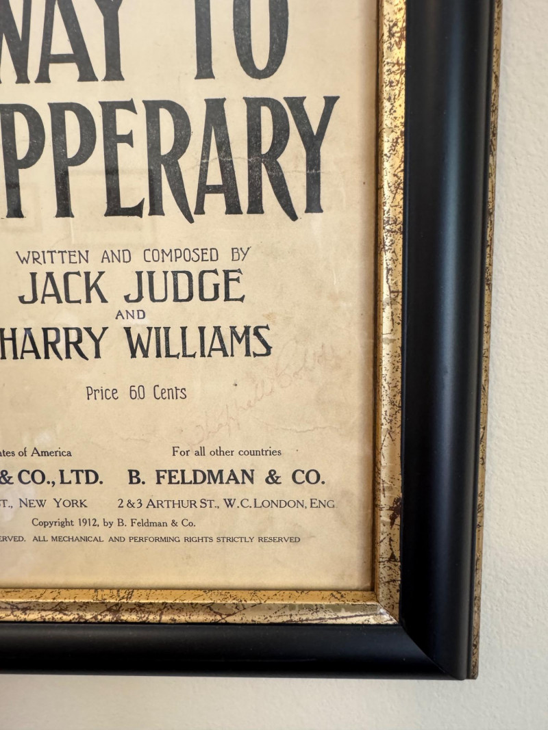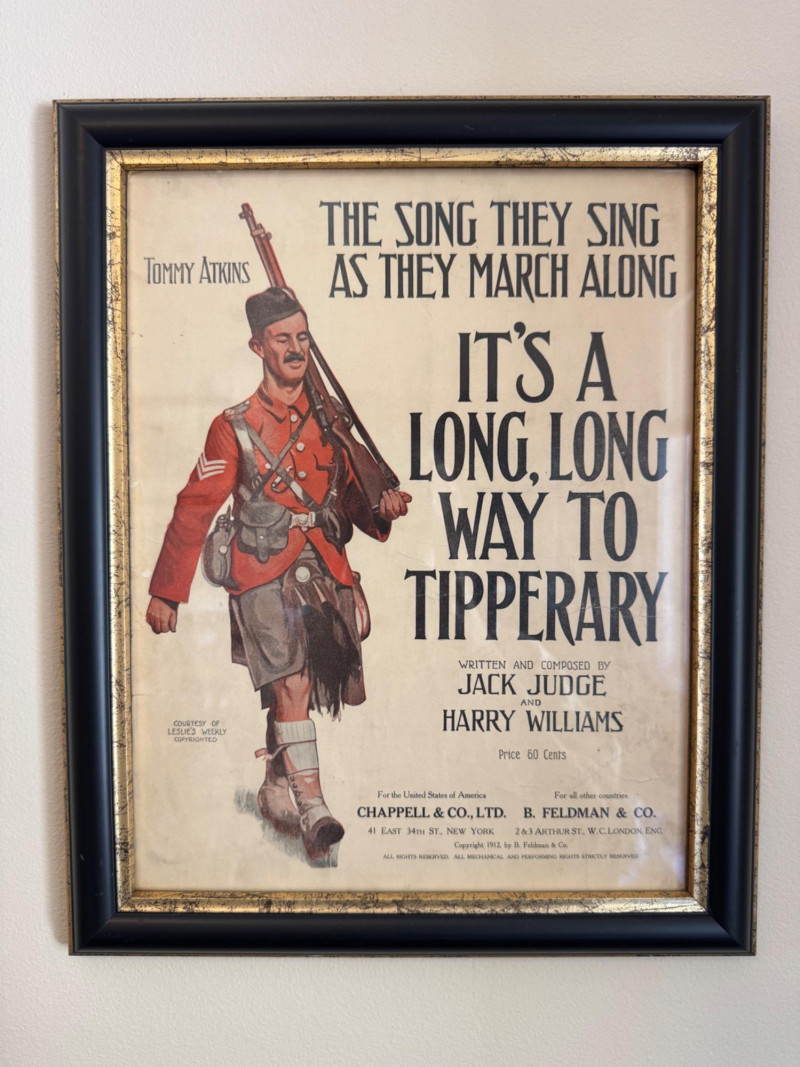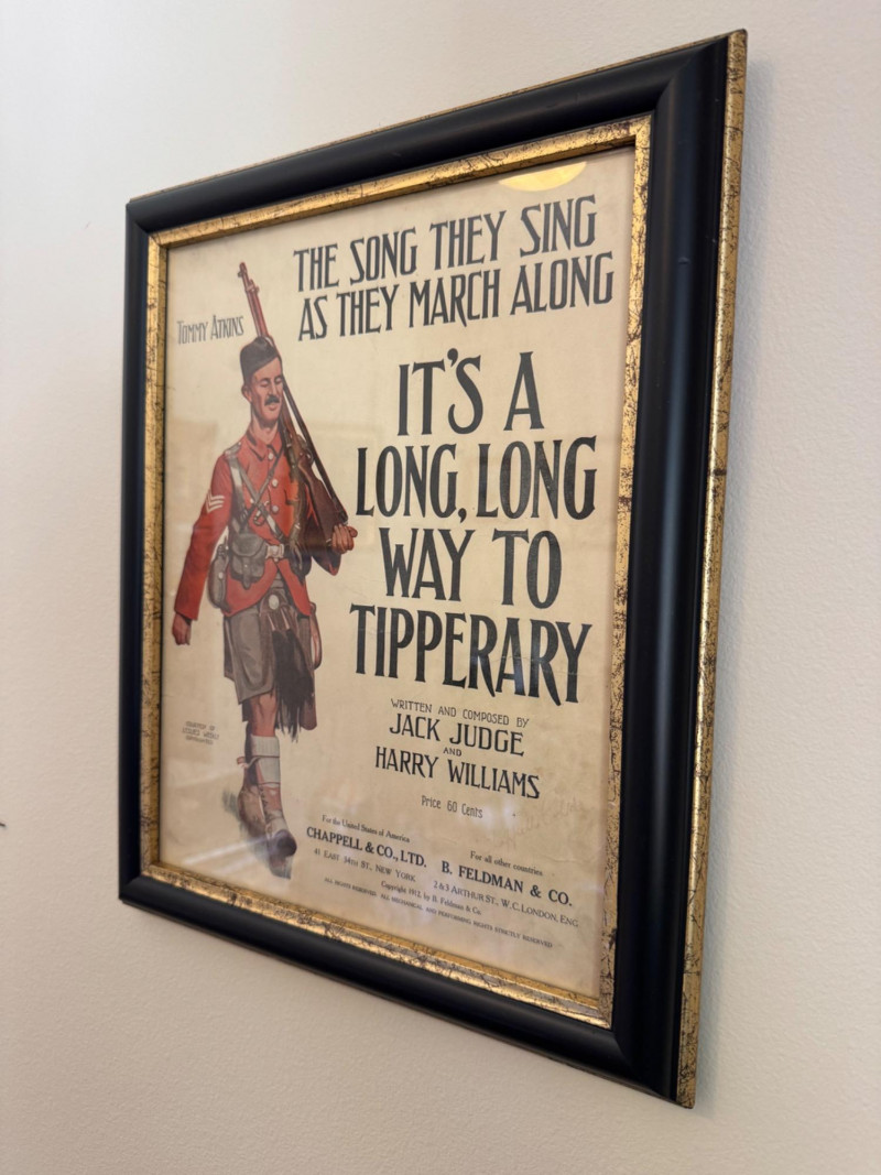 Framed WWI “Tipperary” Sheet Music – 1912 Marching Song Print.