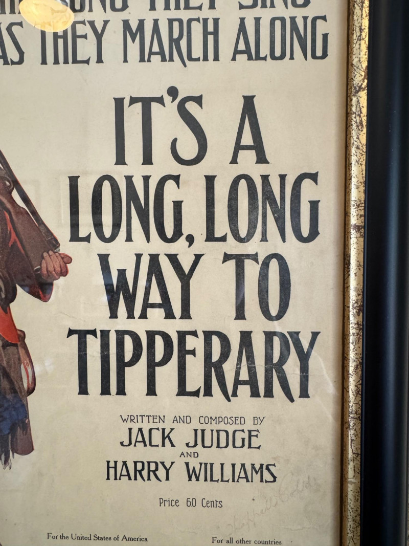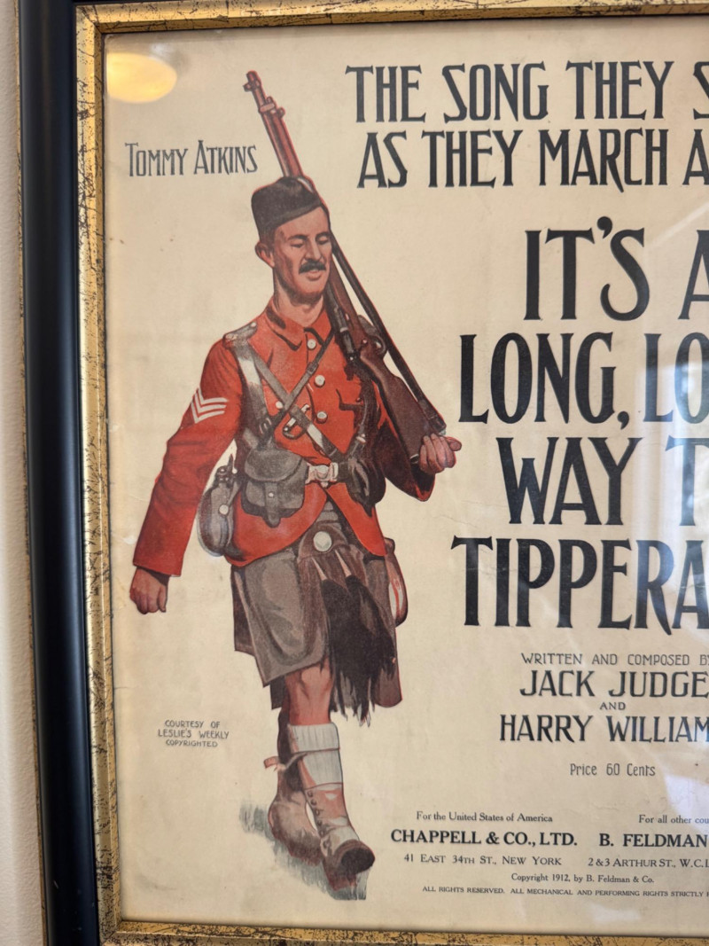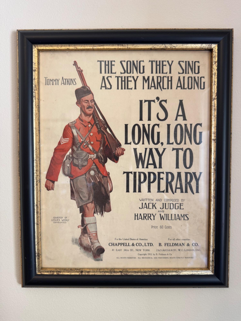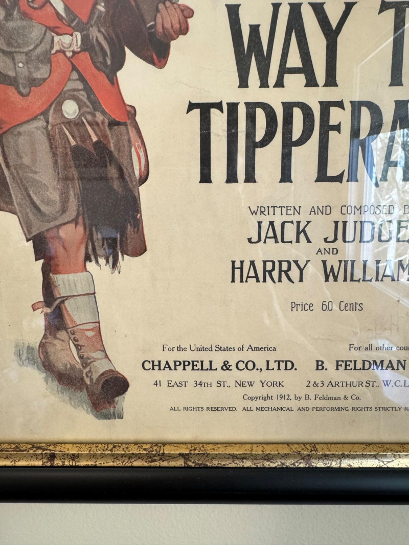Framed WWI “Tipperary” Sheet Music – 1912 Marching Song Print.