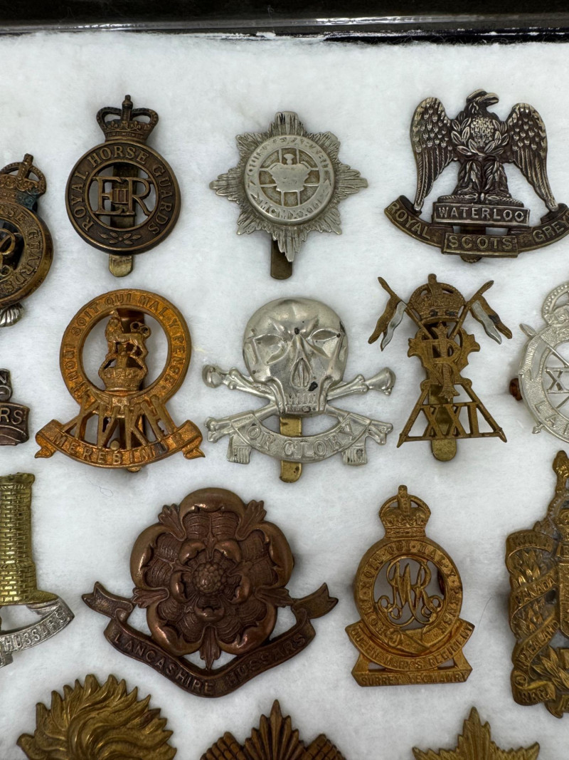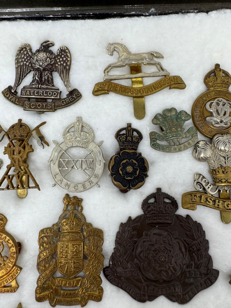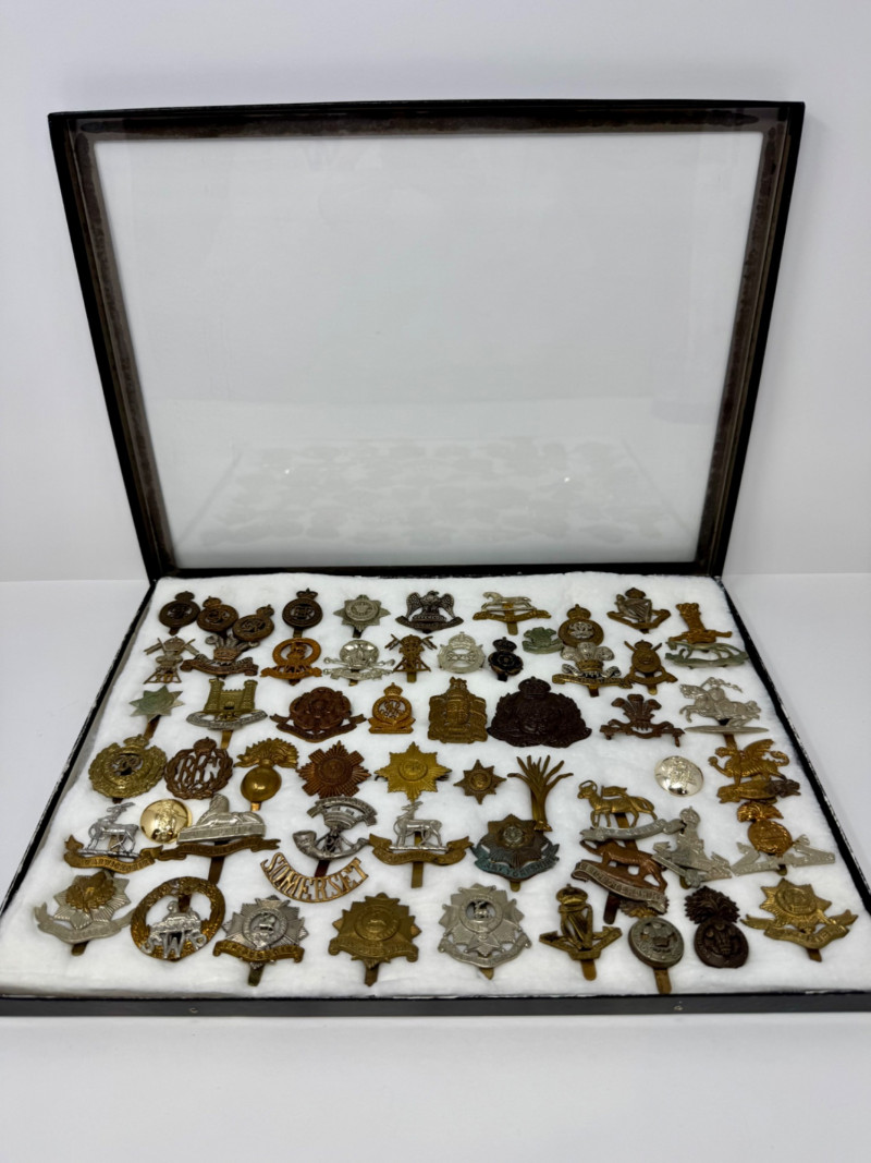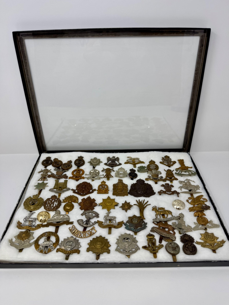 WWI–WWII British & Commonwealth Military Cap Badge Lot. Glass Top Case 16 x 12” Notable inclusions (by visible badge text and shape): And More.