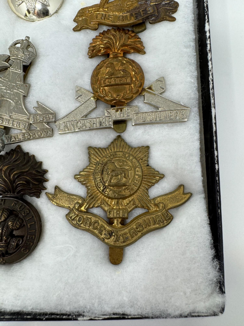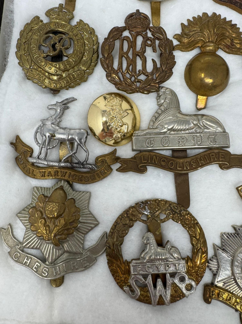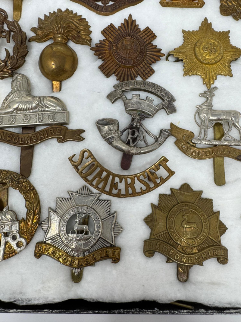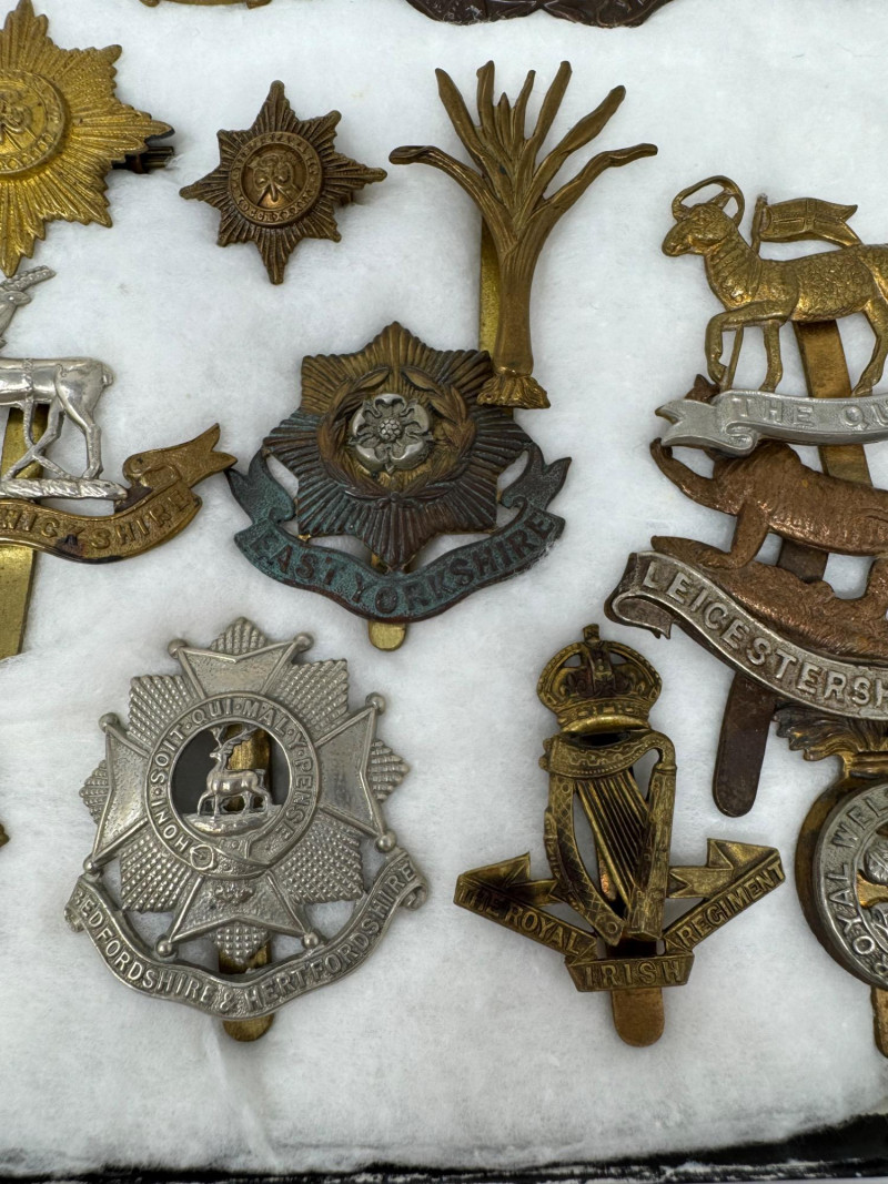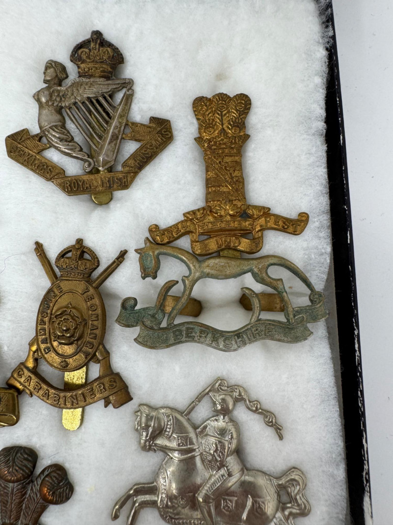 WWI–WWII British & Commonwealth Military Cap Badge Lot. Glass Top Case 16 x 12” Notable inclusions (by visible badge text and shape): And More.
