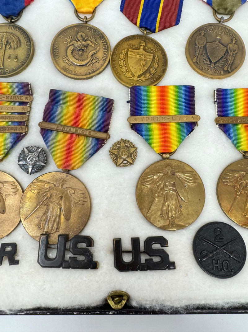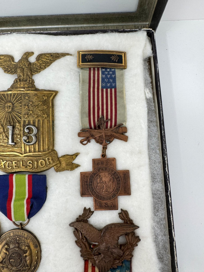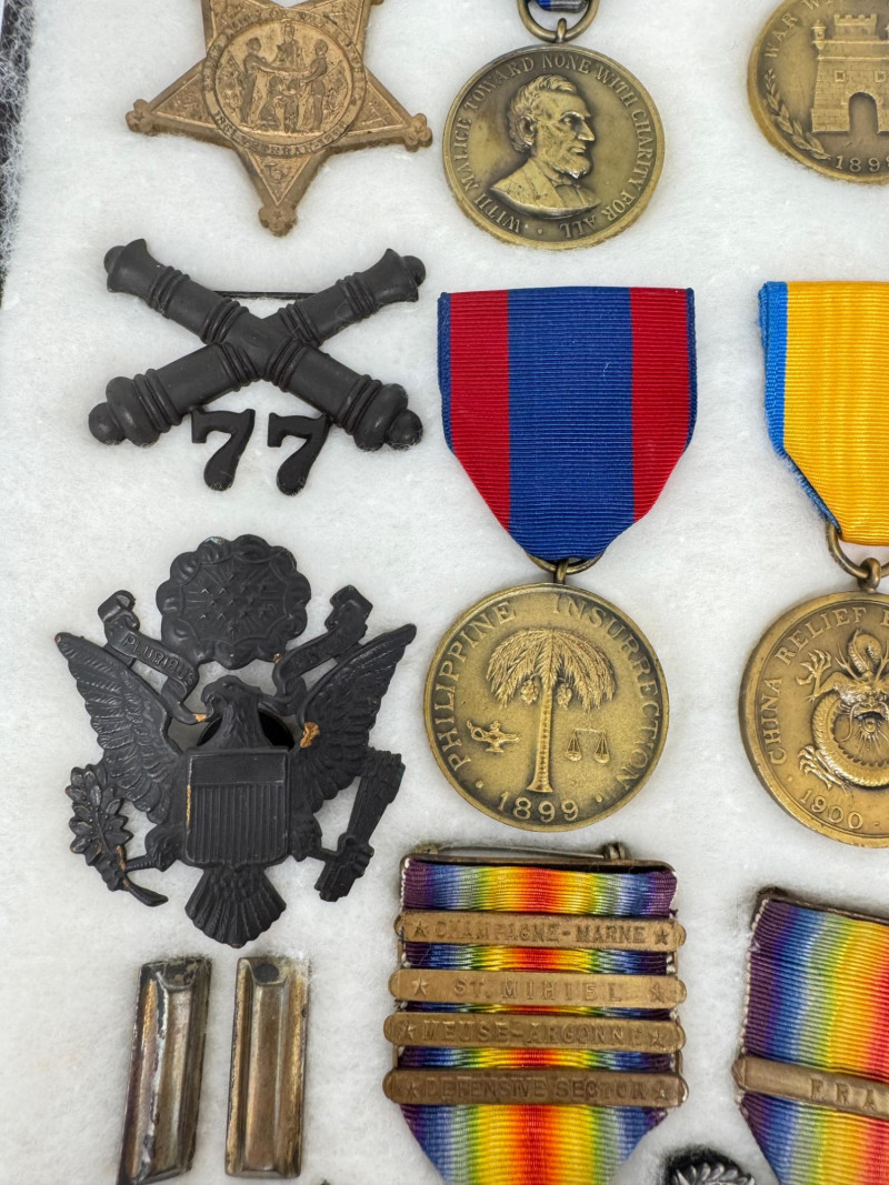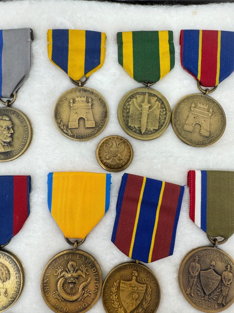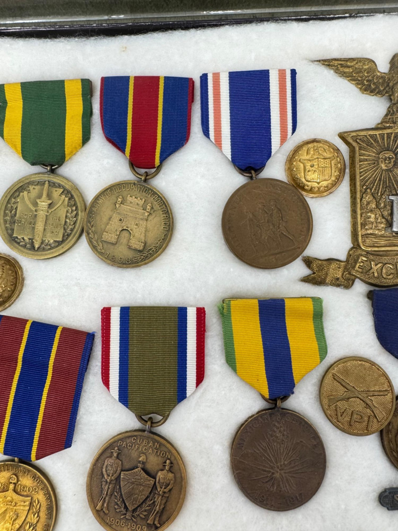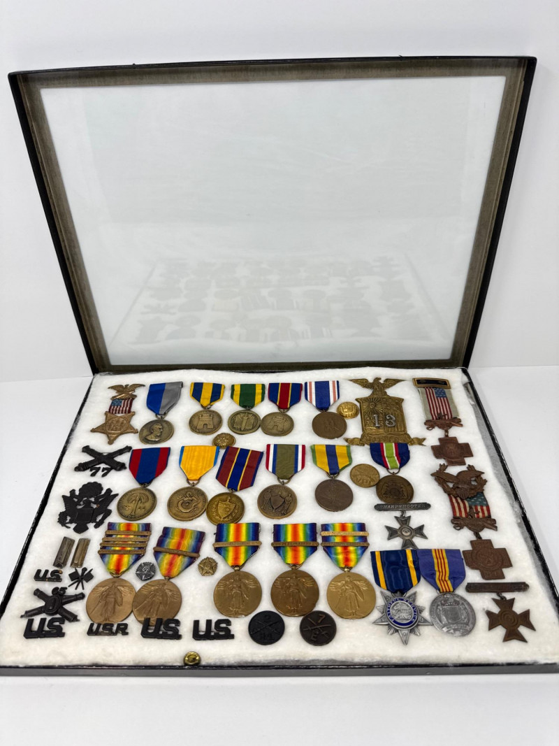 Large U.S. Military Medal Collection – Civil War to WWI, 40+ Pieces. Glass Top Case 16 x 12” And More.