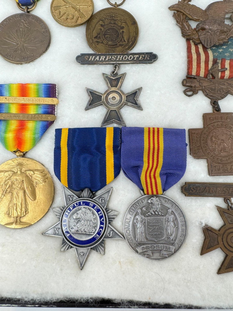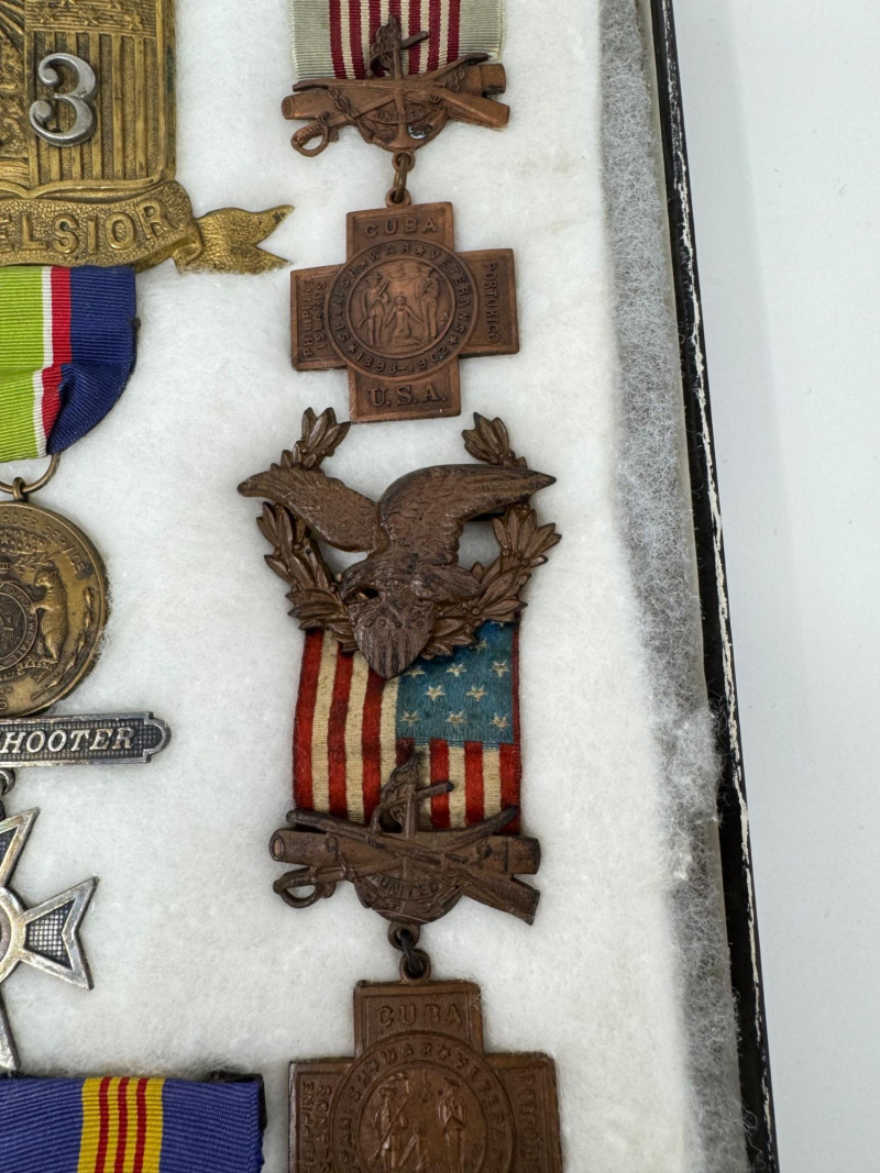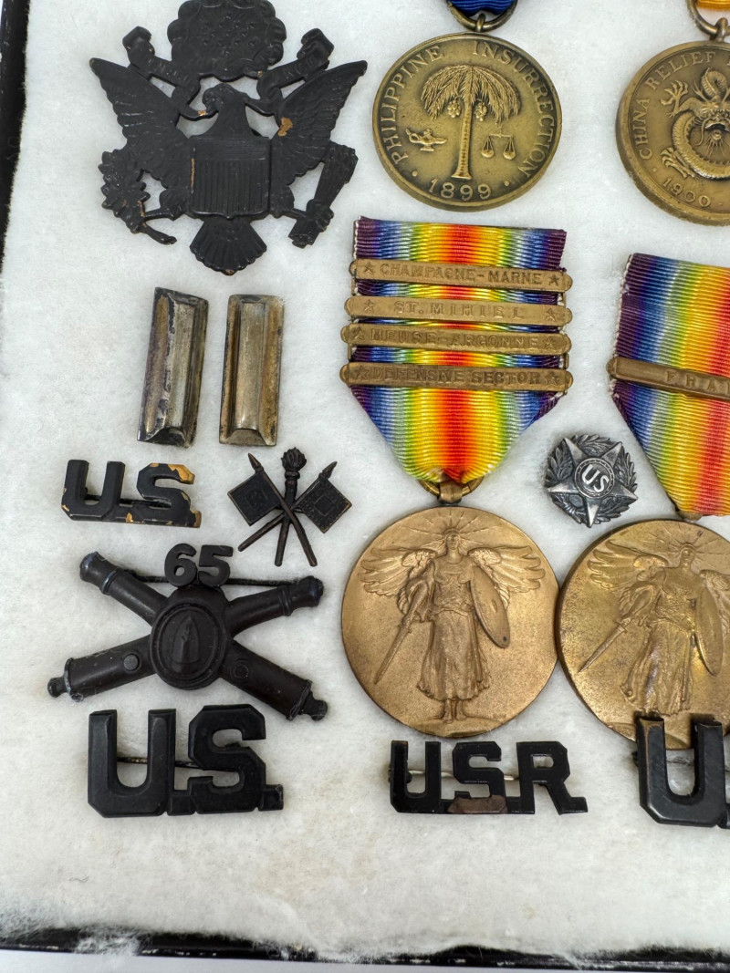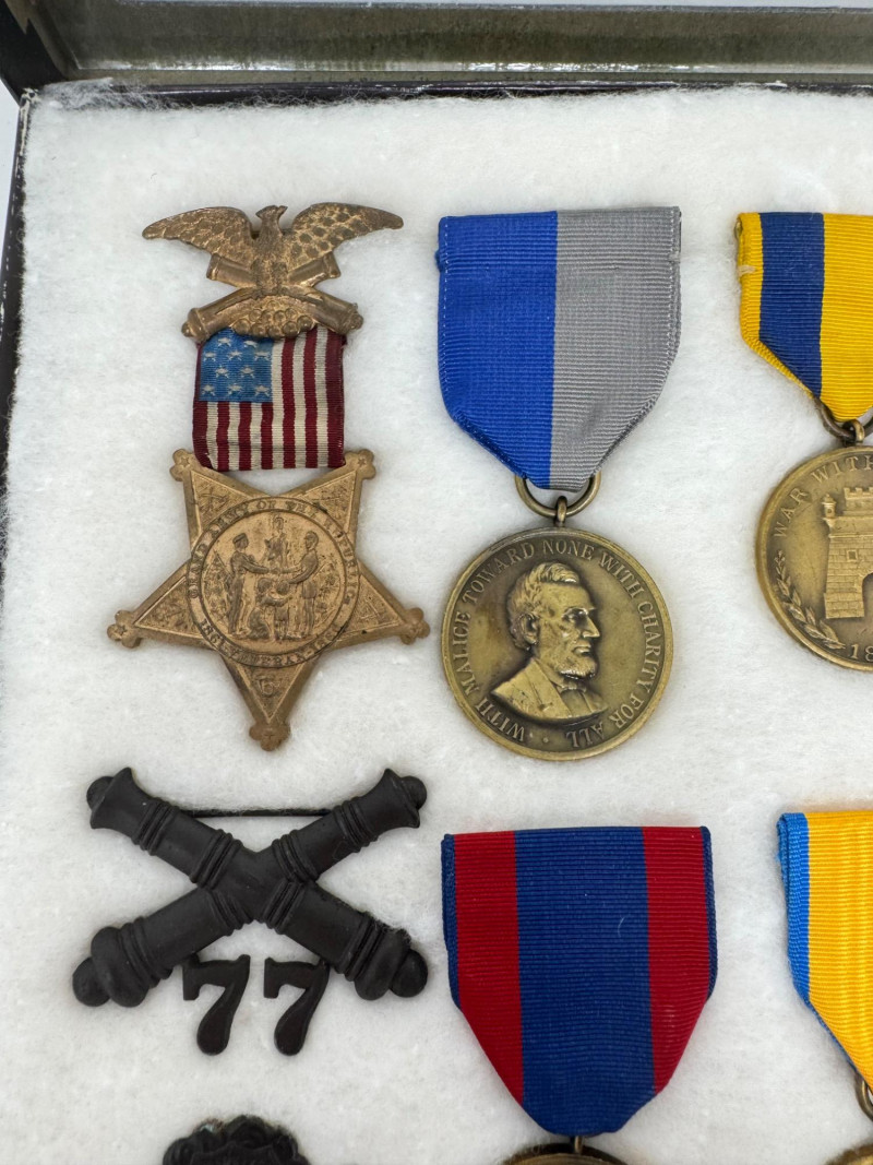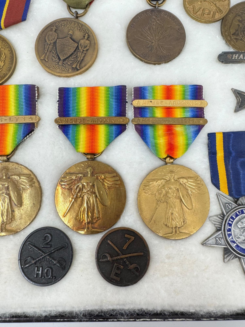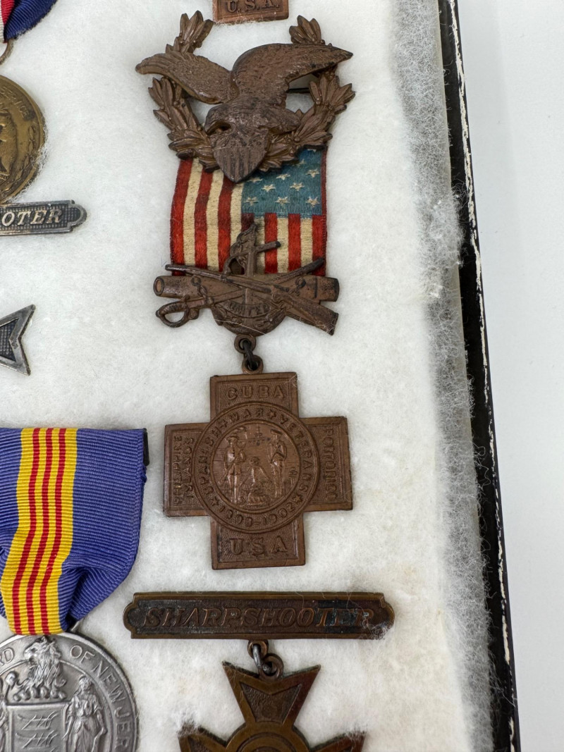 Large U.S. Military Medal Collection – Civil War to WWI, 40+ Pieces. Glass Top Case 16 x 12” And More.