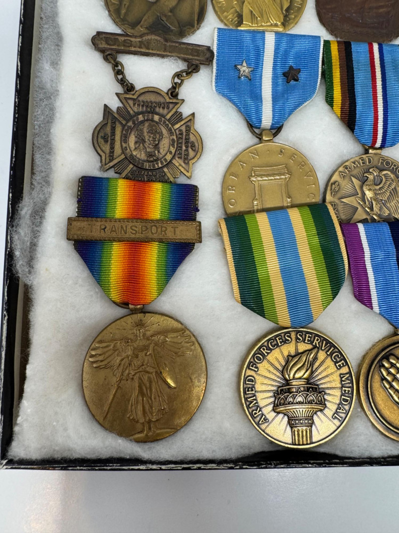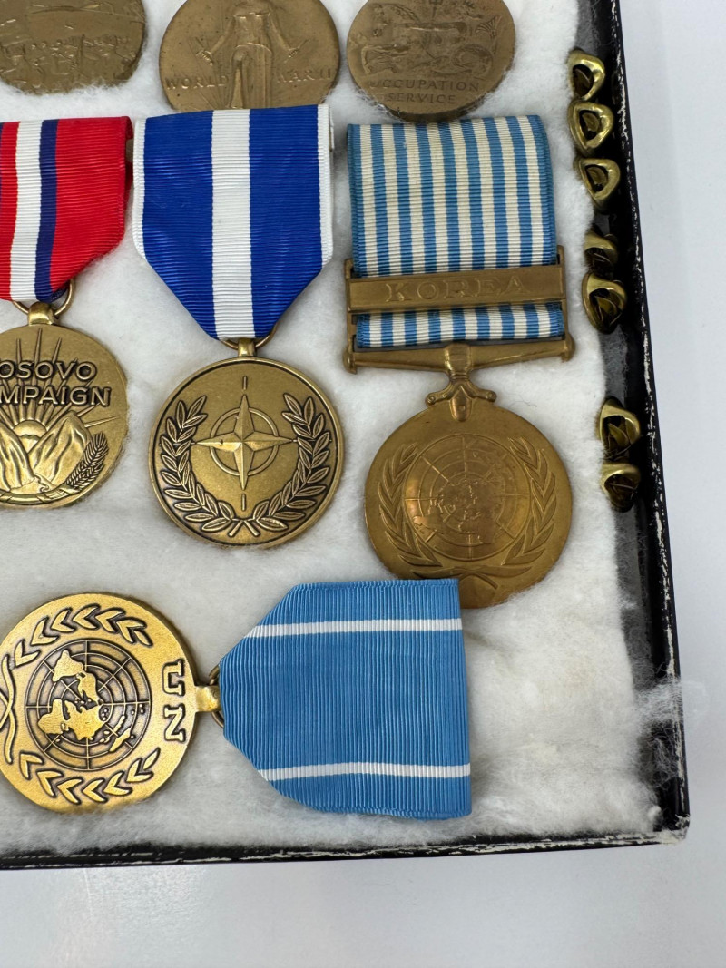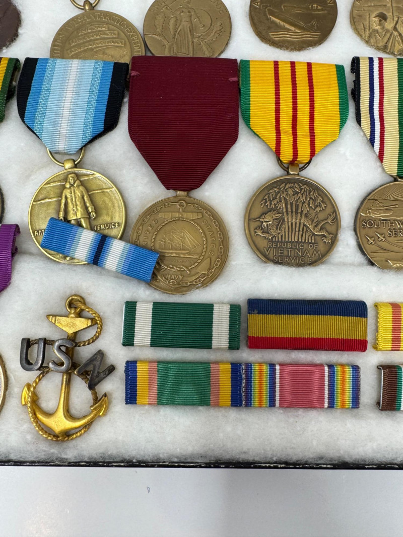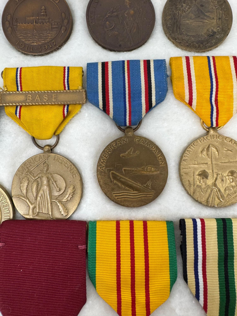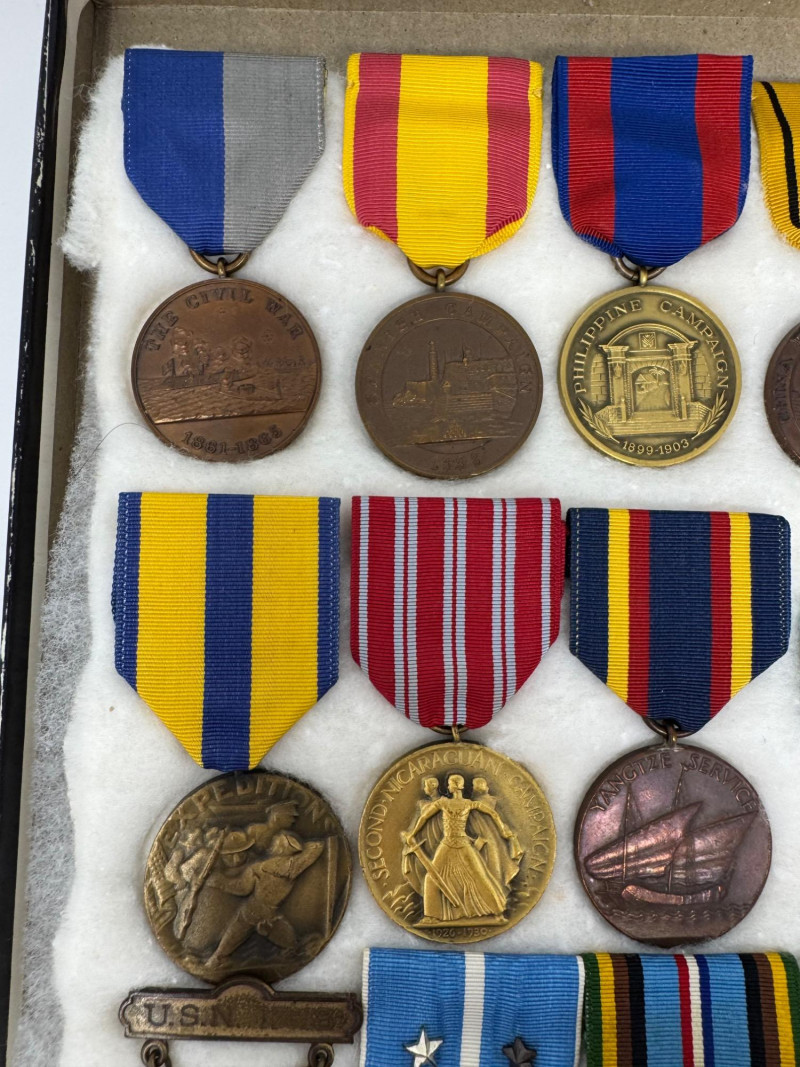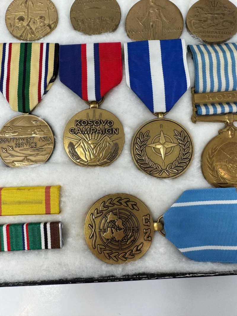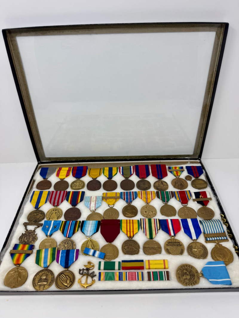Large Assortment of U.S. Military Medals & Campaigns – WWI–Vietnam Era Glass Top Case 16 x 12”