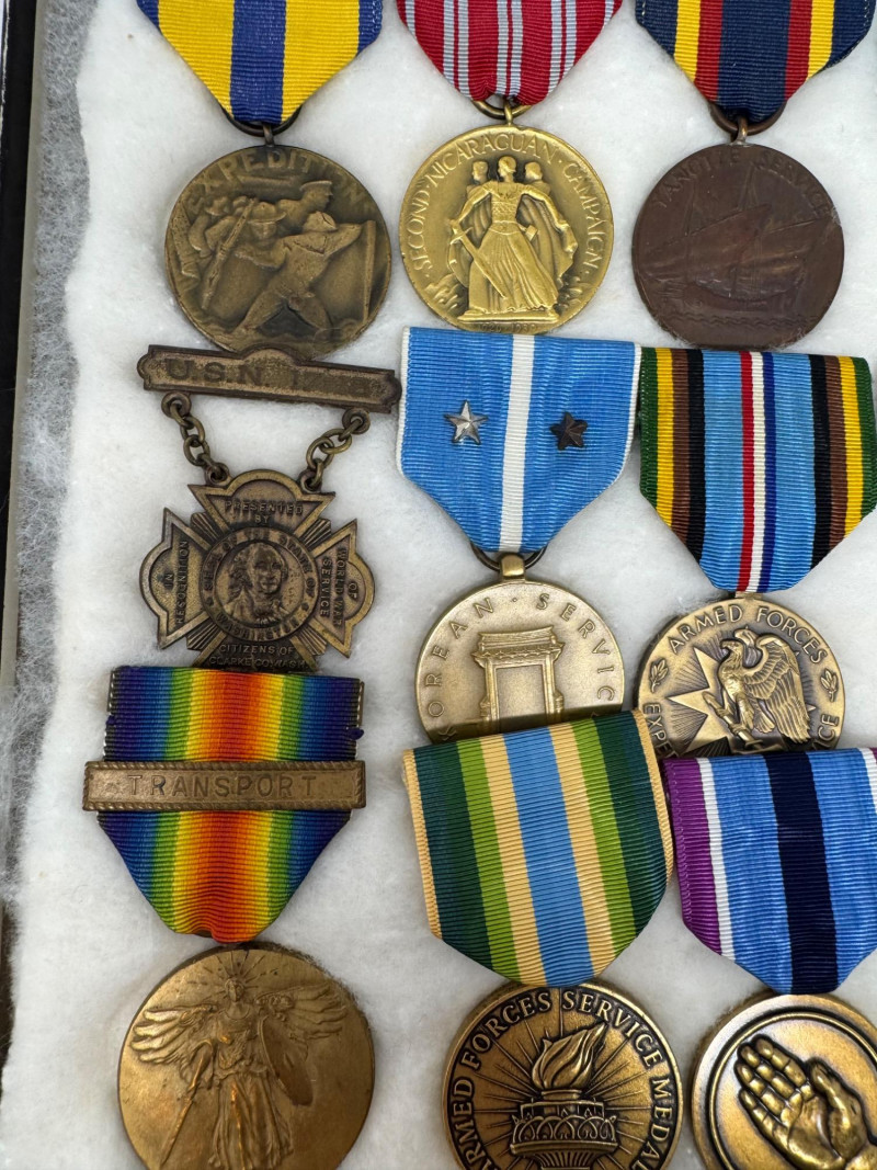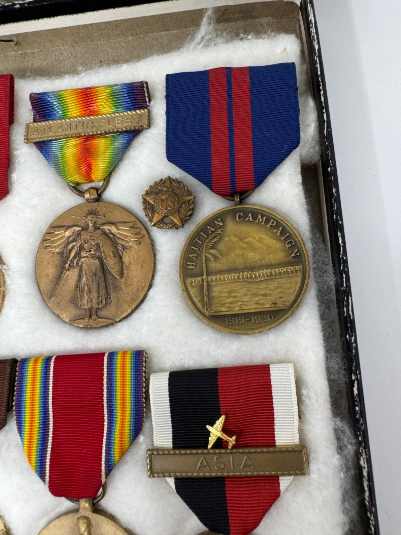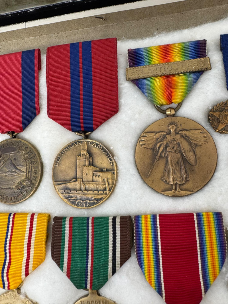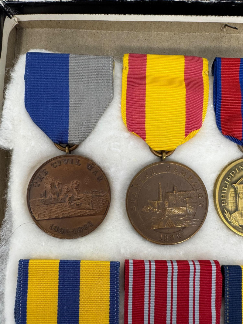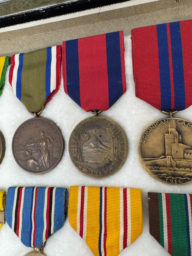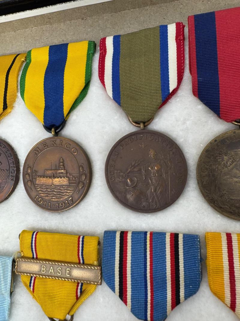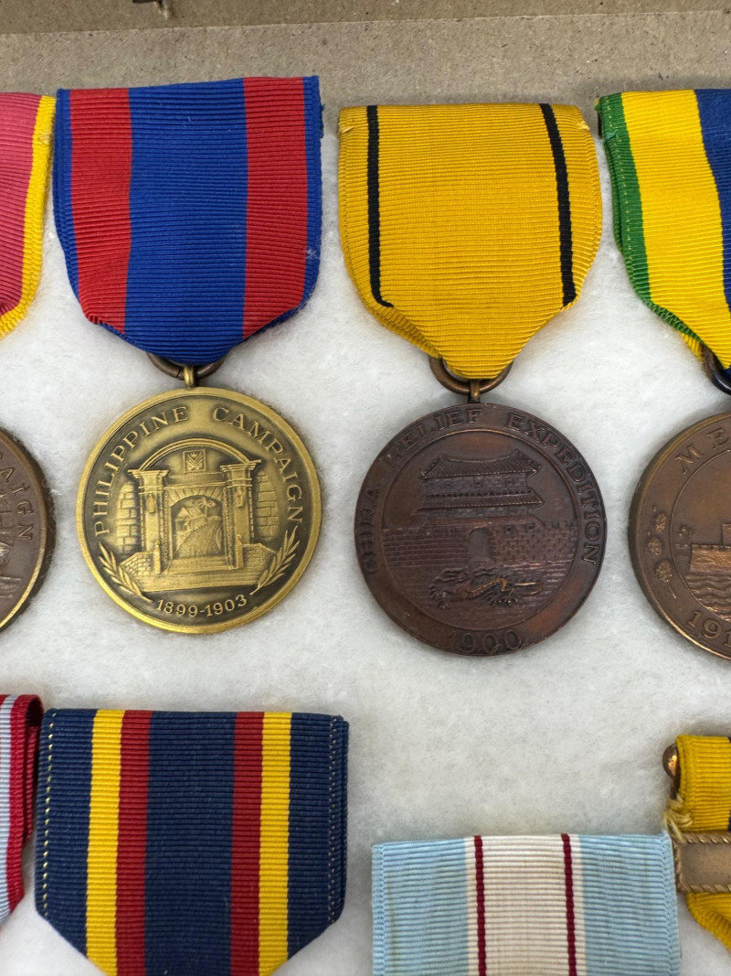 Large Assortment of U.S. Military Medals & Campaigns – WWI–Vietnam Era Glass Top Case 16 x 12”