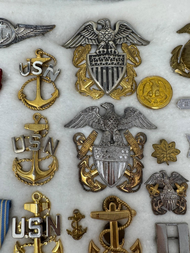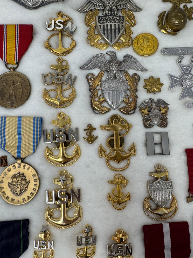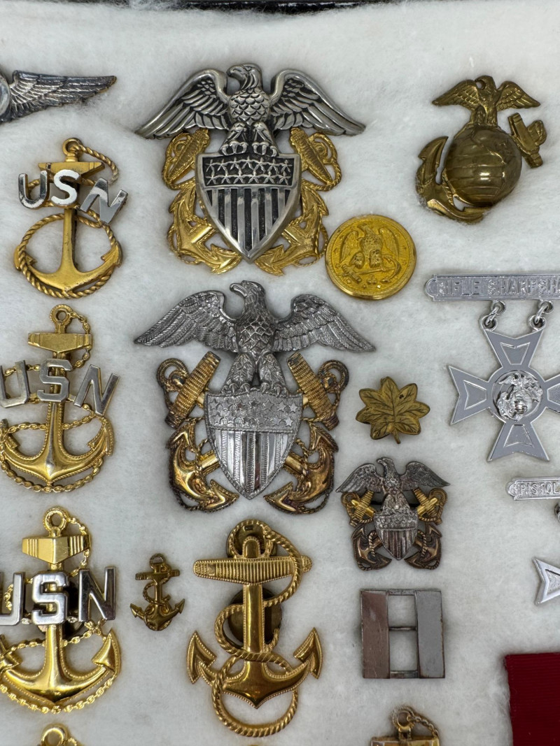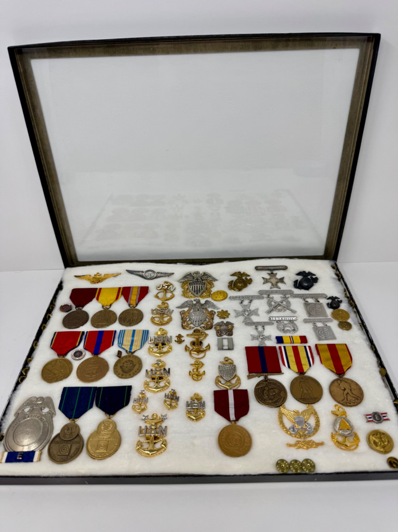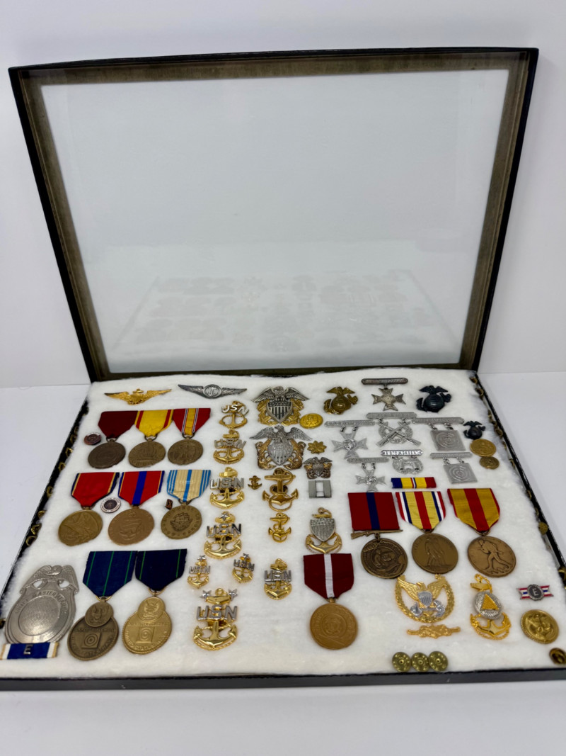 U.S. Navy Medal & Insignia Collection – Sharpshooter, CPO, Vietnam, WWII+ Glass Top Case 16 x 12”