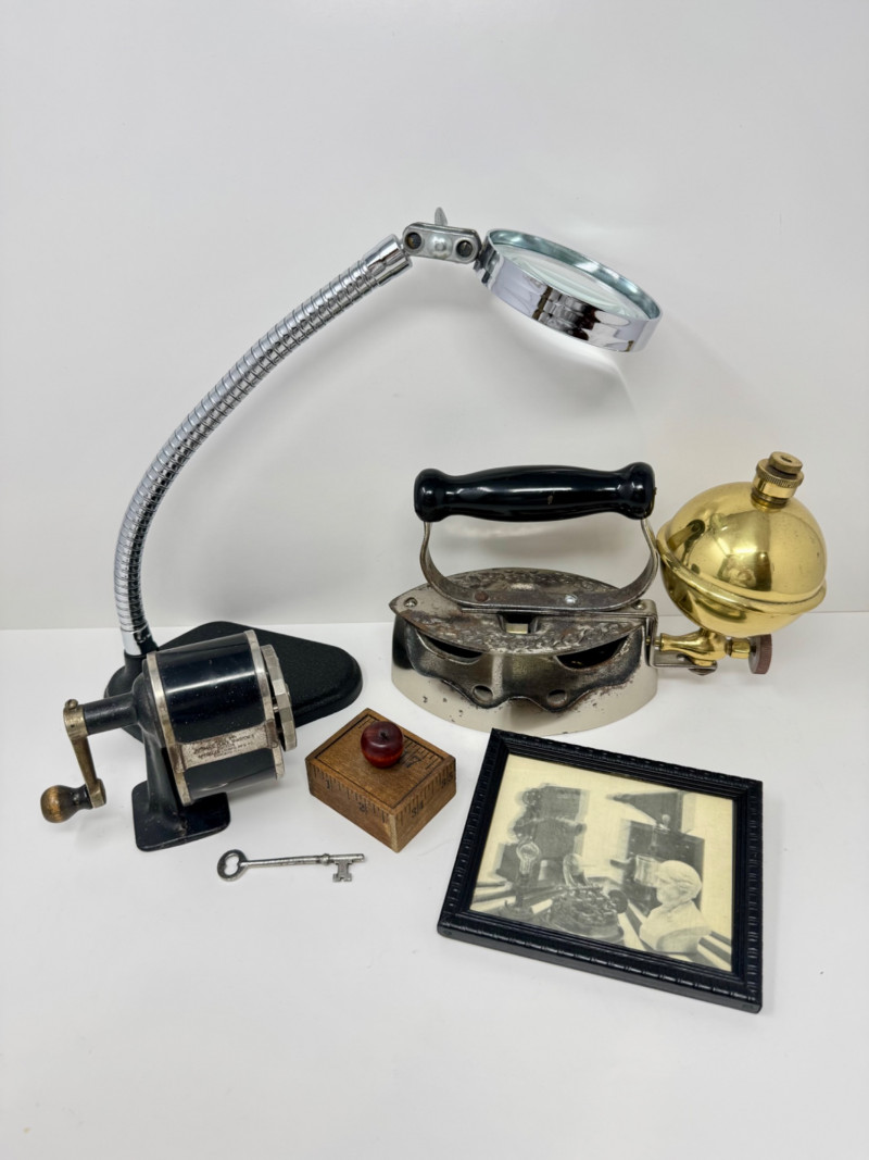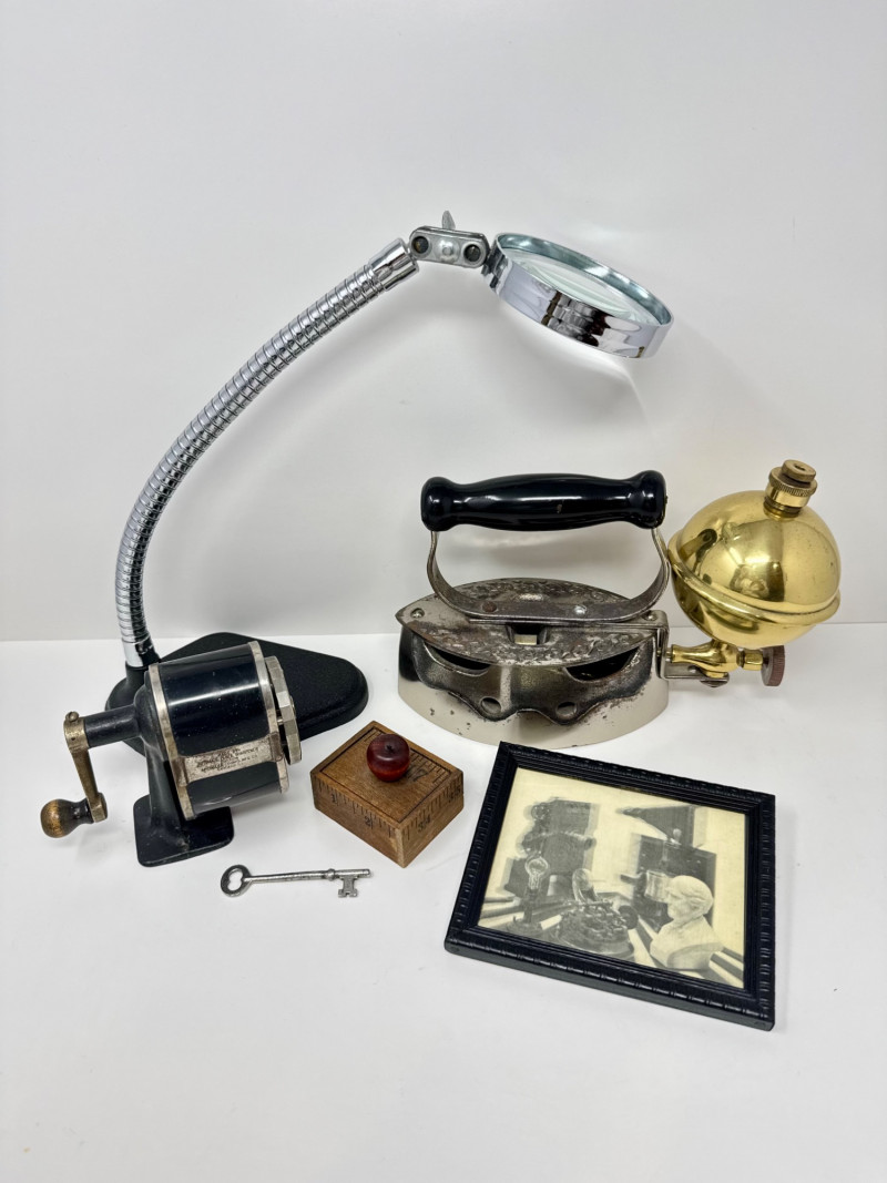 Curated Vintage/Antique Desk Treasures – Iron, Photo Box, Sharpener +