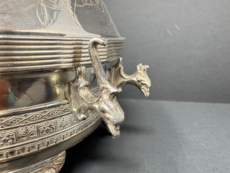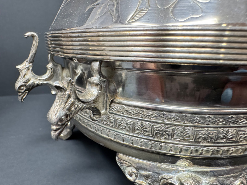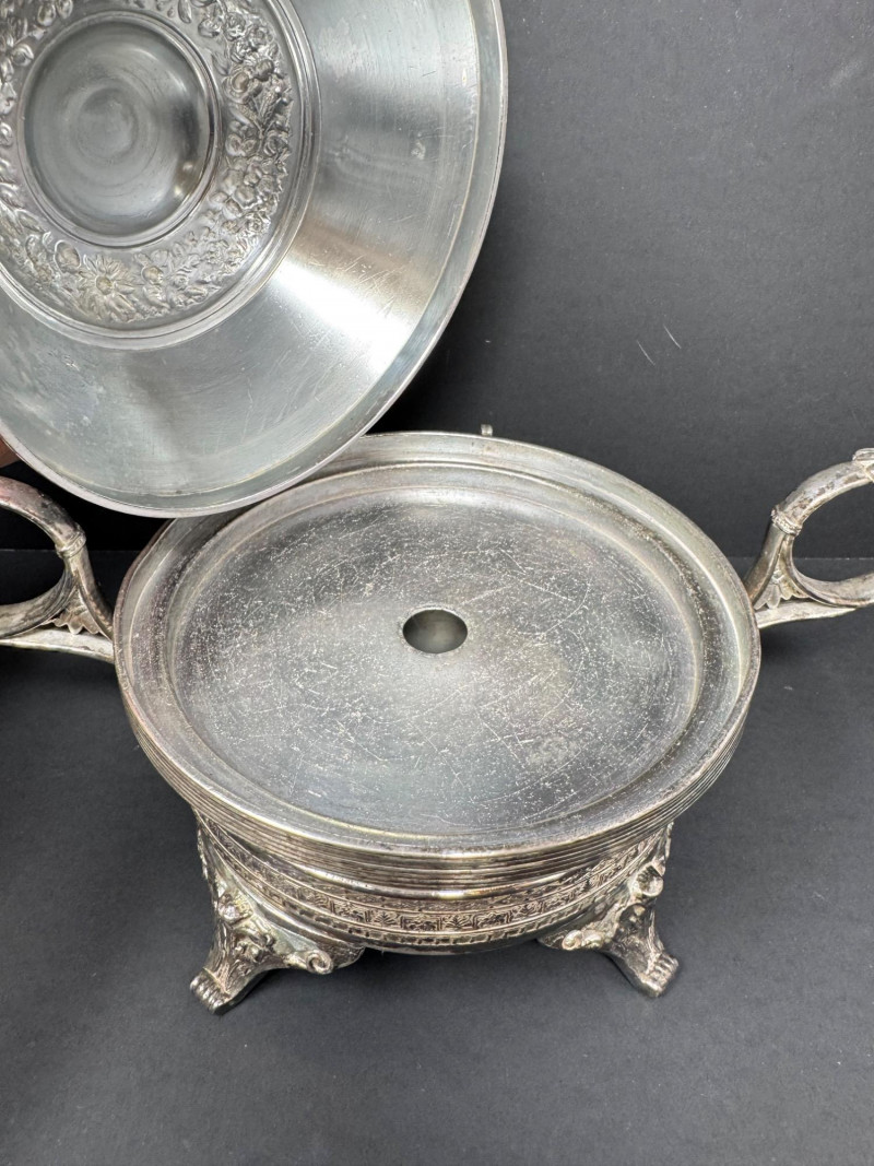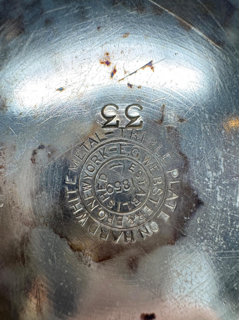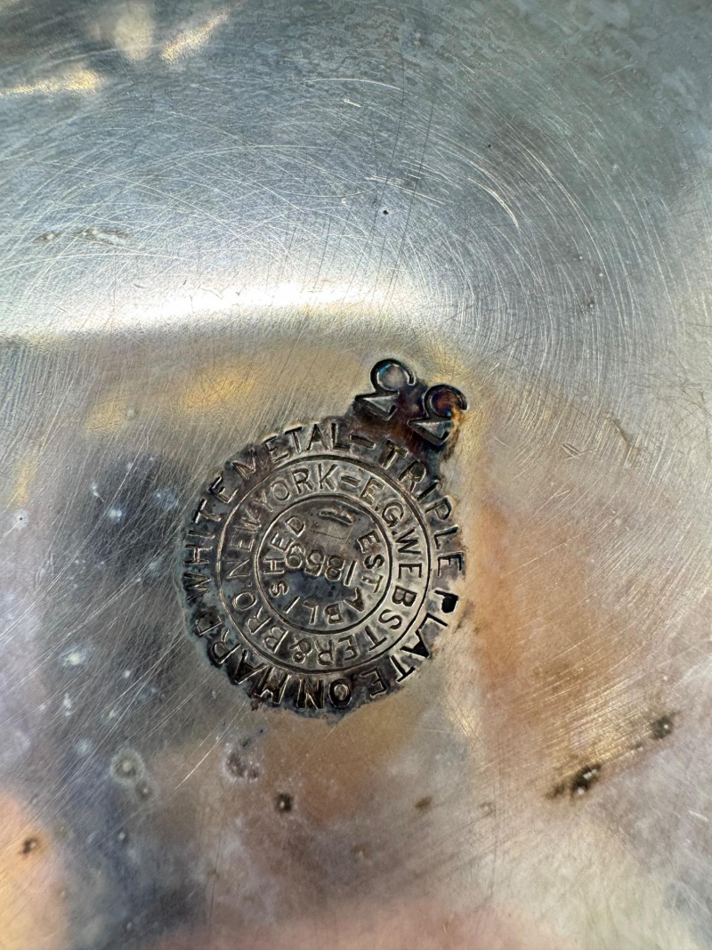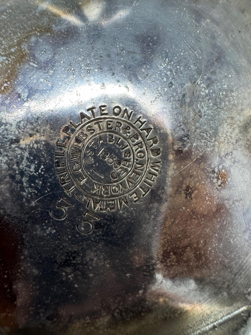 E.G. Webster Silverplate Tea Set – 4pc Triple Plate Ornate Set. Please note: The butter dish has a small broken piece. Disclaimer: We do not test the metals of the items listed for auction. By placing a bid, you acknowledge and agree that you are purchasing the item "as is" and without any guarantee of metal quality. We do not offer refunds based on metal content or purity.