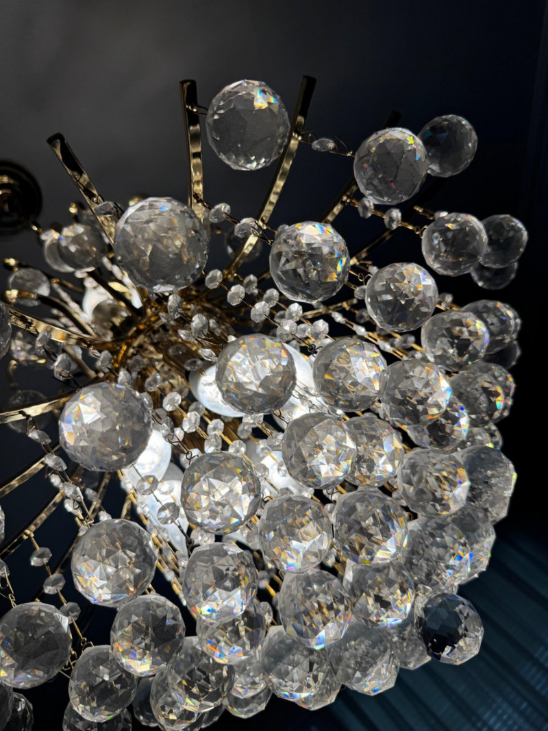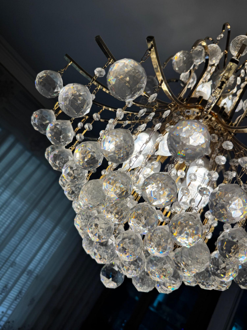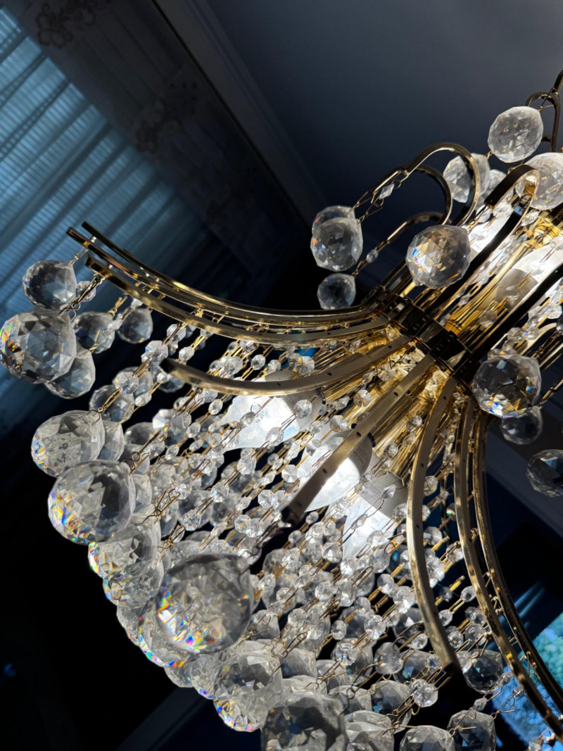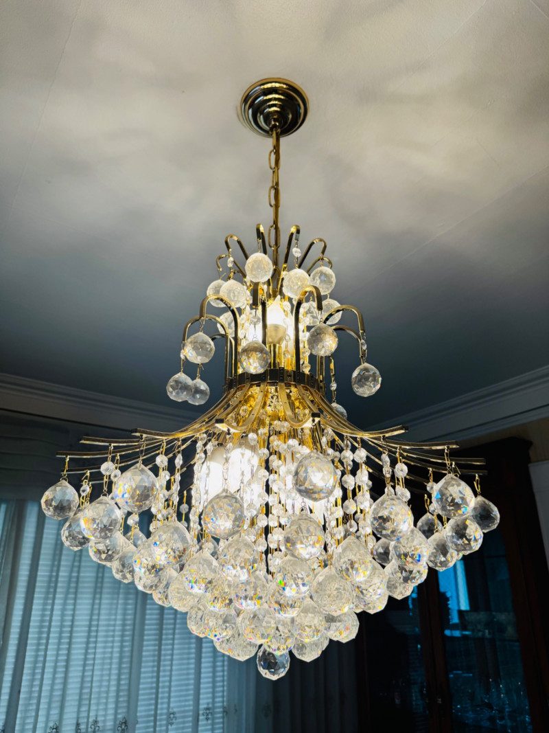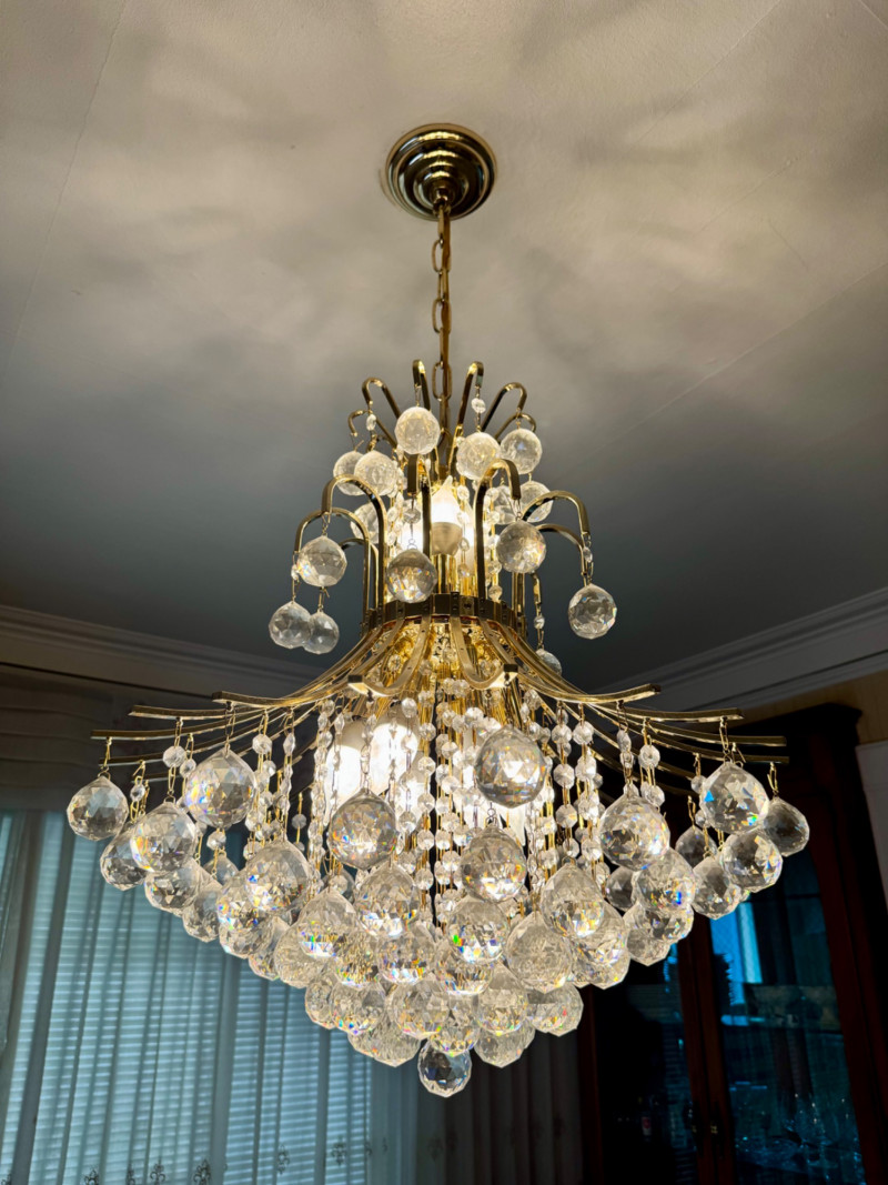 Raindrop Crystal Chandelier w/ Cascading Glass Prisms. 39” Long 21” Diameter Bidding on this lot is an agreement that: (1.) You will have at least 2 capable, able bodied persons to lift and load at a minimum. (2.) You will bring a hand truck and/or any other tools needed to remove this item. If these steps are not followed your item will be forfeit and no refund given.