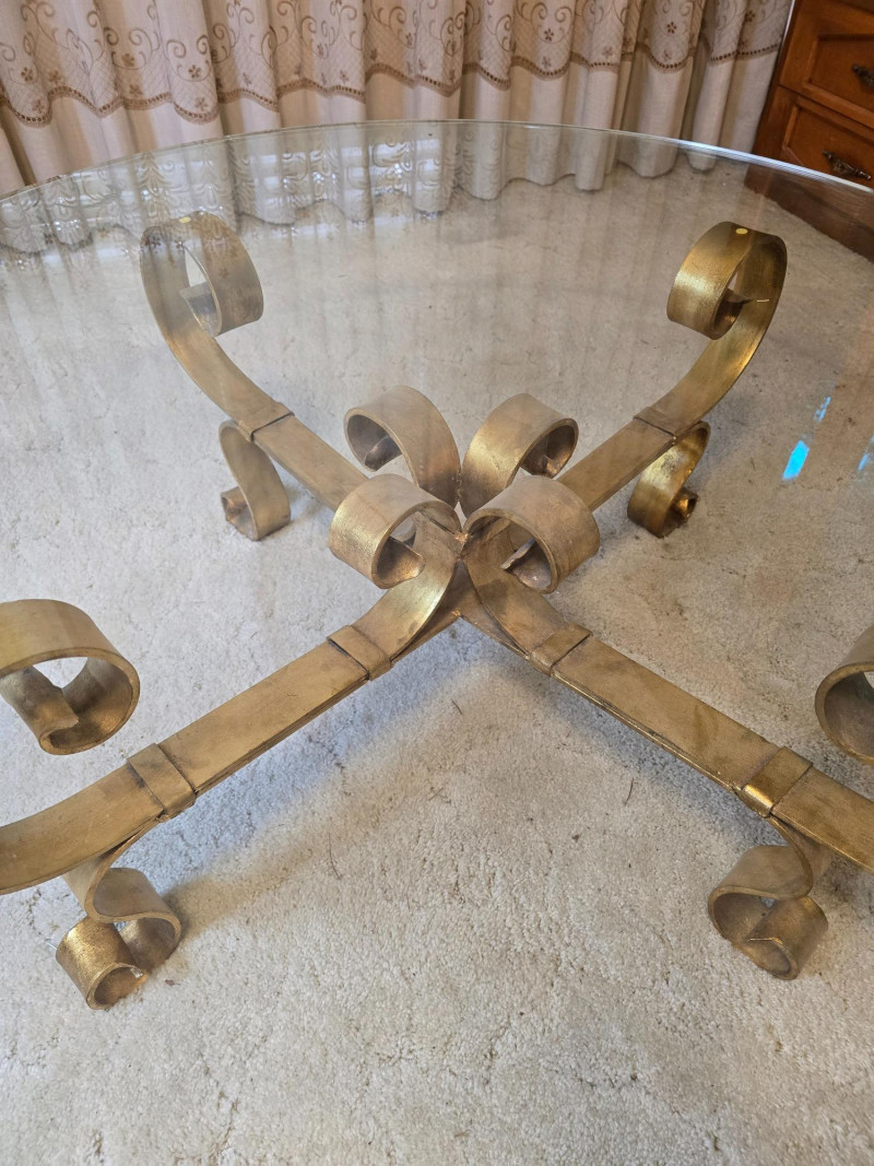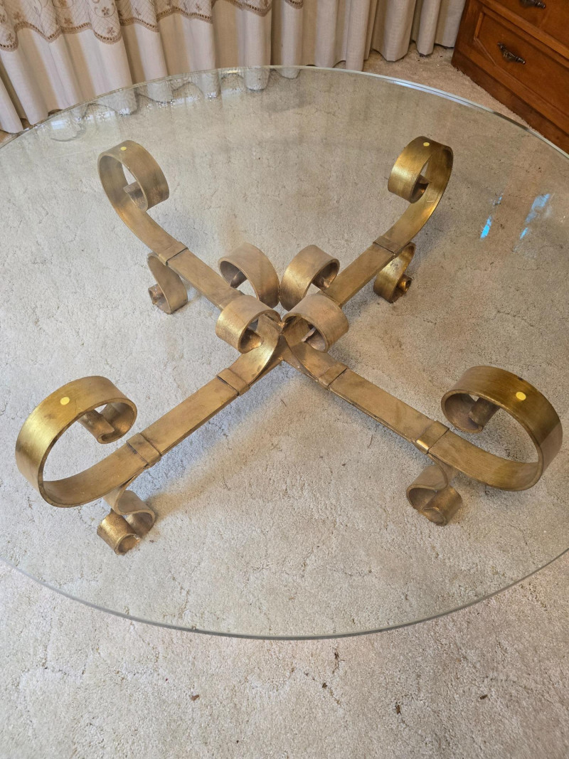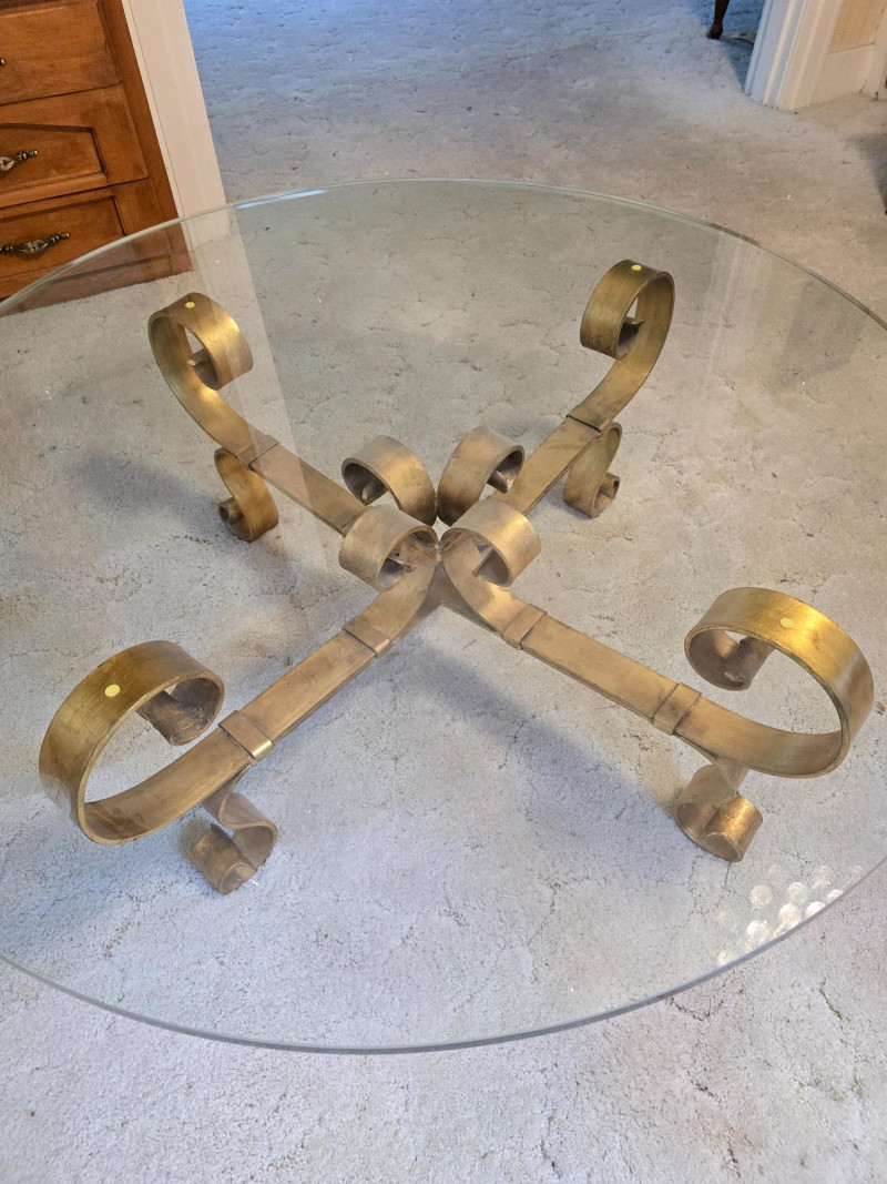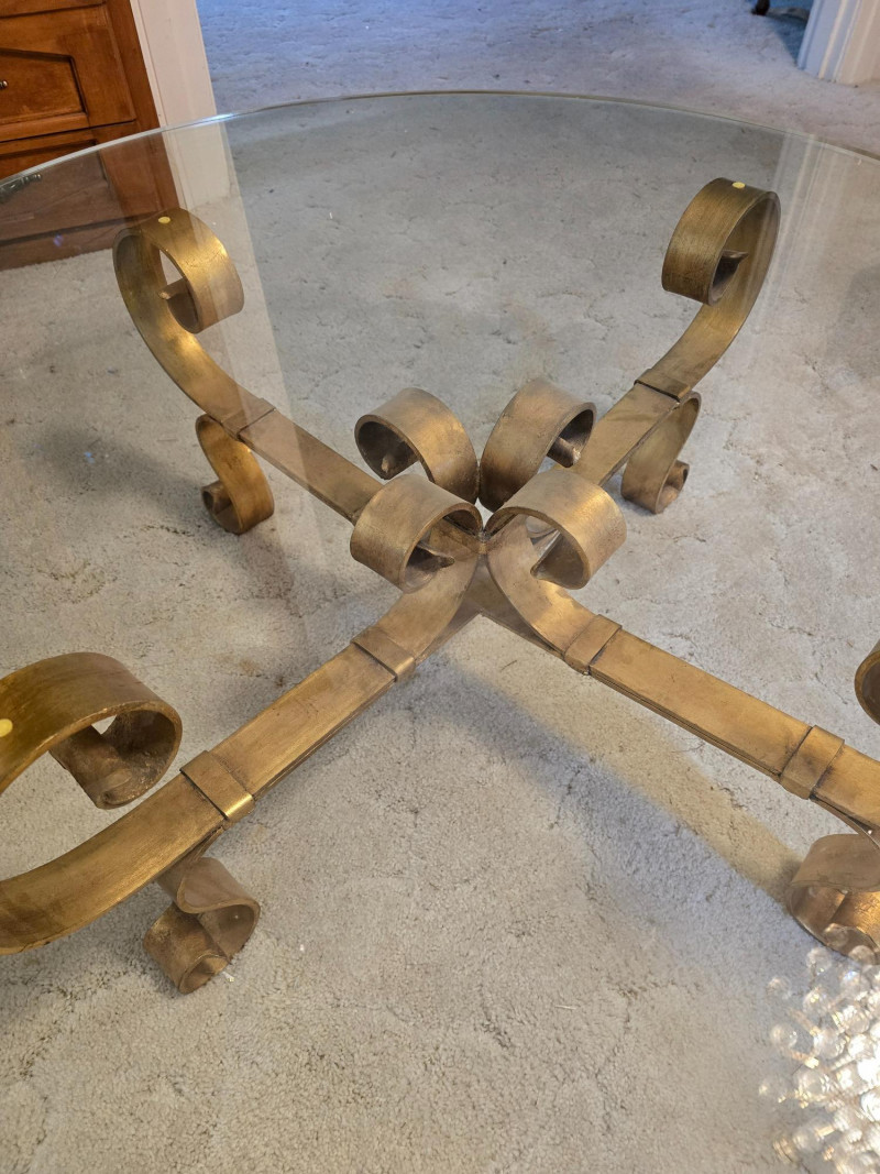 Round Glass Table w/ Ornate Gilded Metal Scroll Base. 40 x 15 Bidding on this lot is an agreement that: (1.) You will have at least 2 capable, able bodied persons to lift and load at a minimum. (2.) You will bring a hand truck and/or any other tools needed to remove this item. If these steps are not followed your item will be forfeit and no refund given.