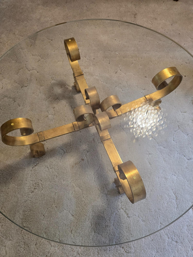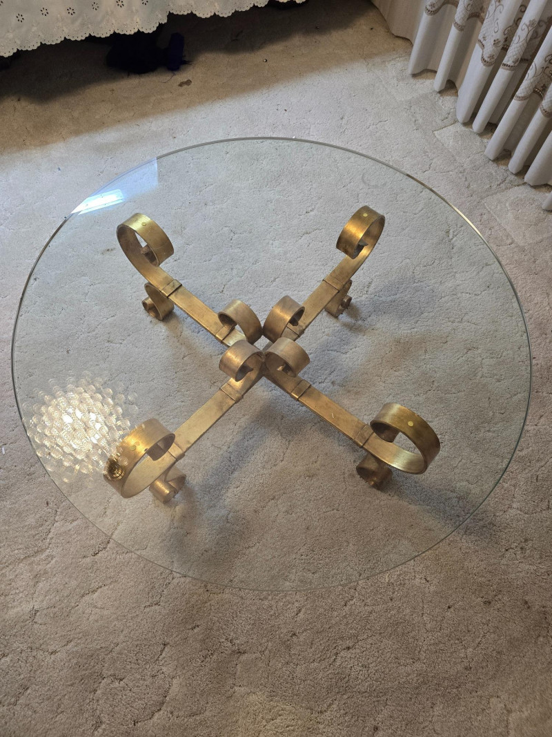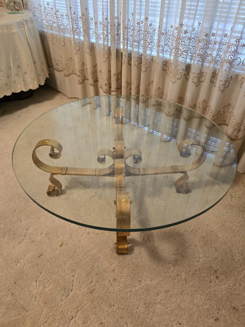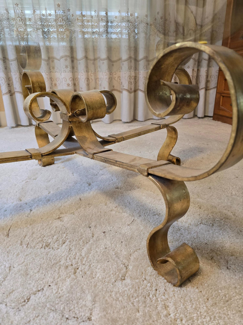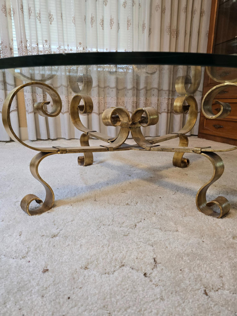 Round Glass Table w/ Ornate Gilded Metal Scroll Base. 40 x 15 Bidding on this lot is an agreement that: (1.) You will have at least 2 capable, able bodied persons to lift and load at a minimum. (2.) You will bring a hand truck and/or any other tools needed to remove this item. If these steps are not followed your item will be forfeit and no refund given.