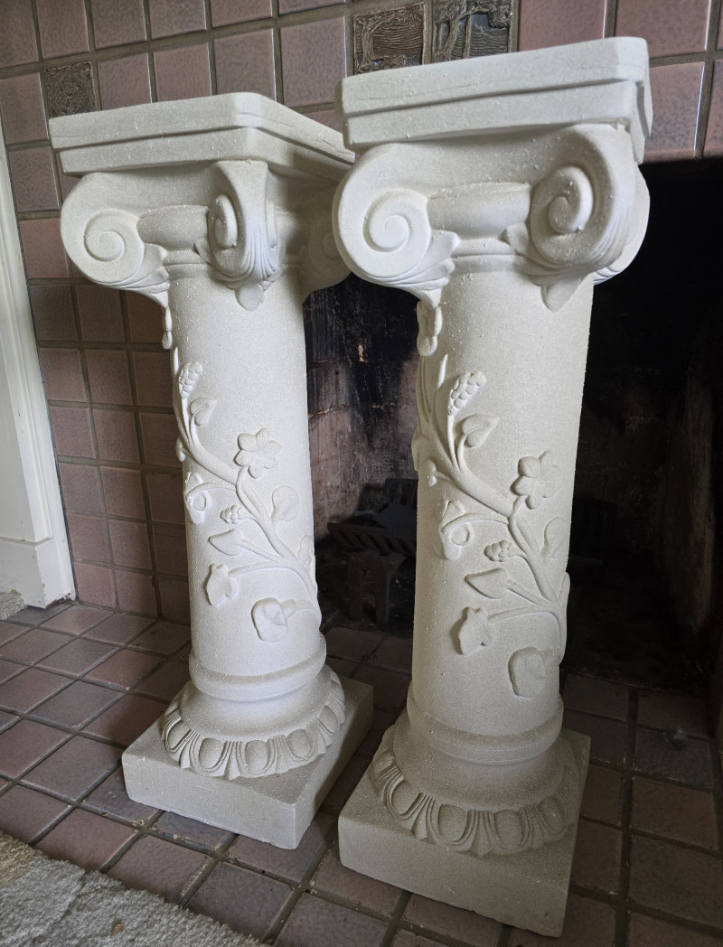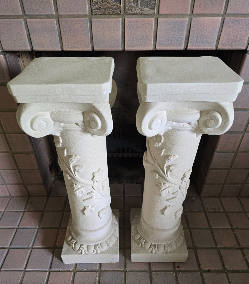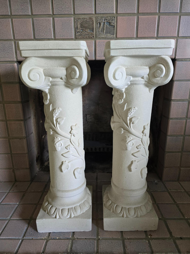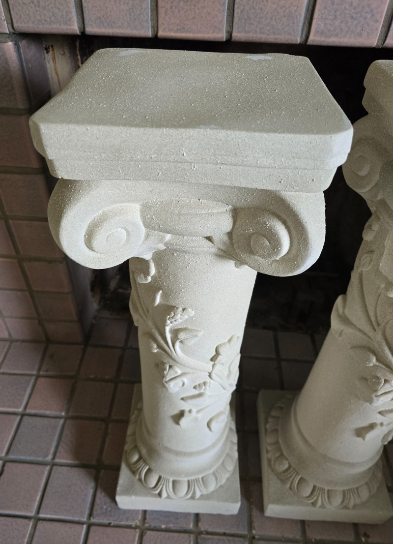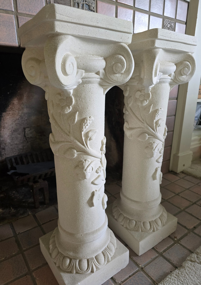 Pair of Decorative Plaster Columns w/ Floral Scroll Relief. 30"x10" Bidding on this lot is an agreement that: (1.) You will have at least 2 capable, able bodied persons to lift and load at a minimum. (2.) You will bring a hand truck and/or any other tools needed to remove this item. If these steps are not followed your item will be forfeit and no refund given.