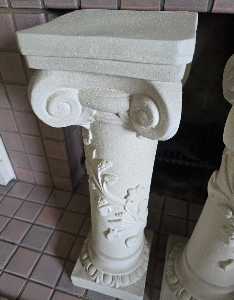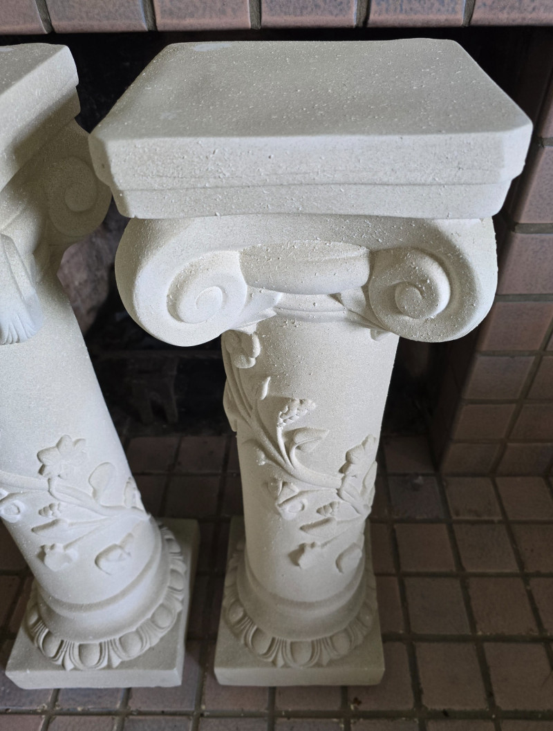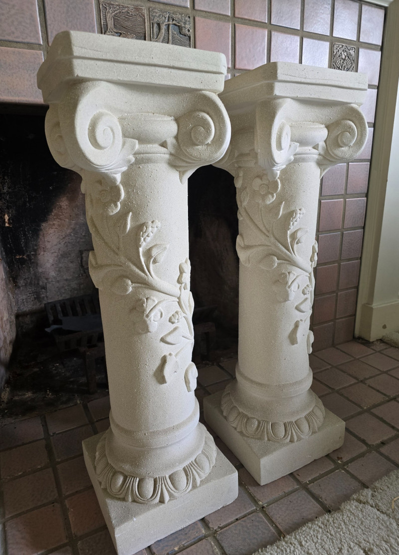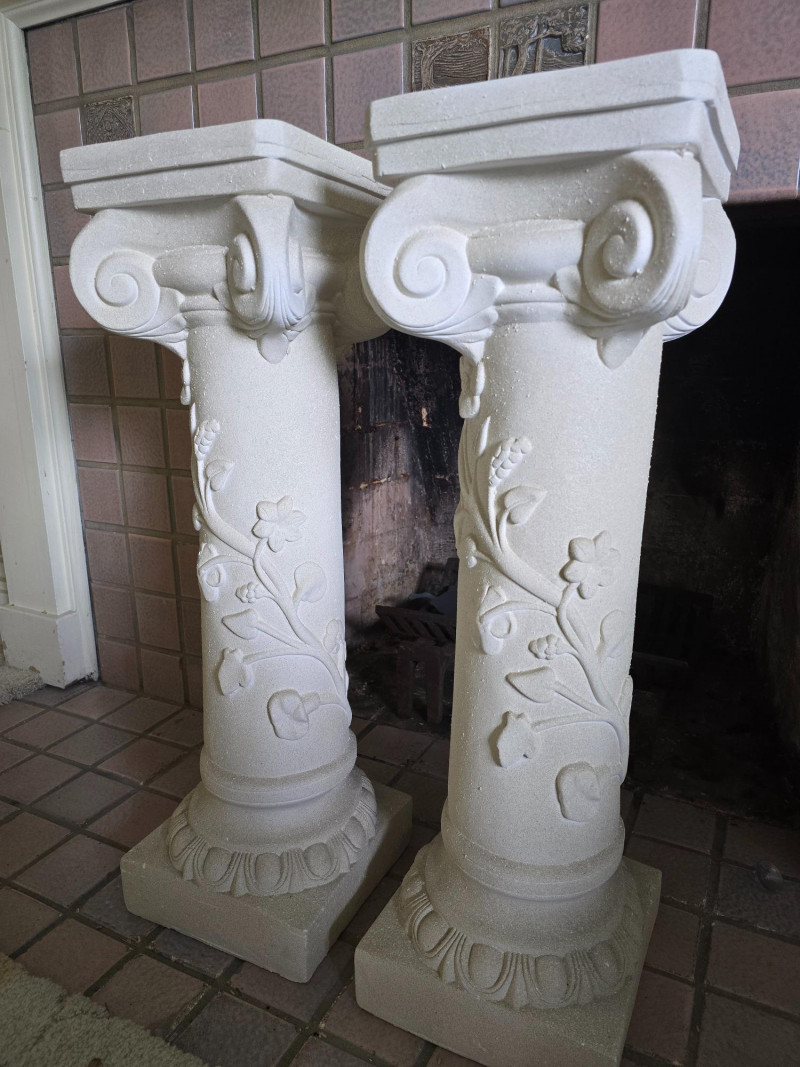 Pair of Decorative Plaster Columns w/ Floral Scroll Relief. 30"x10" Bidding on this lot is an agreement that: (1.) You will have at least 2 capable, able bodied persons to lift and load at a minimum. (2.) You will bring a hand truck and/or any other tools needed to remove this item. If these steps are not followed your item will be forfeit and no refund given.